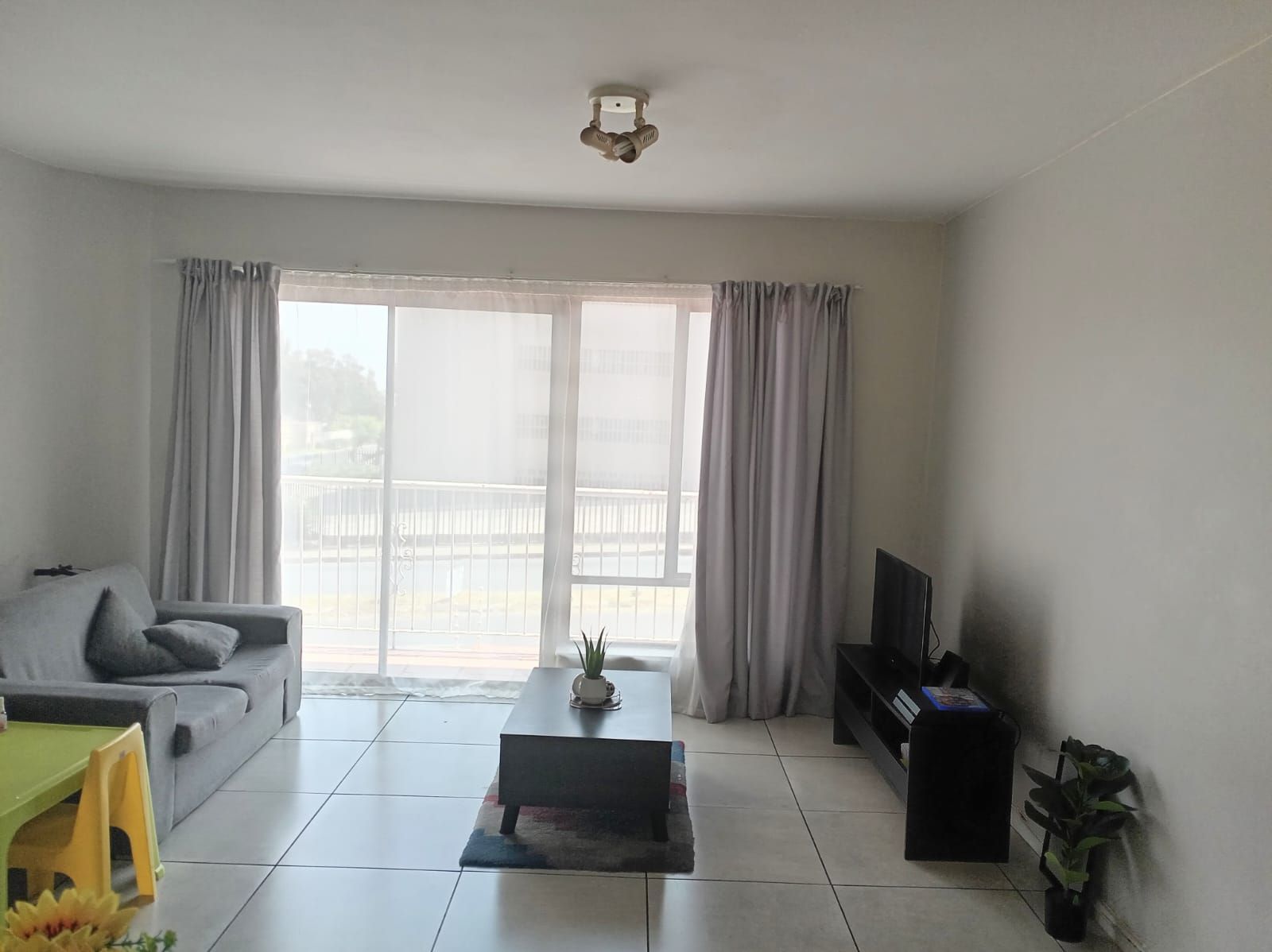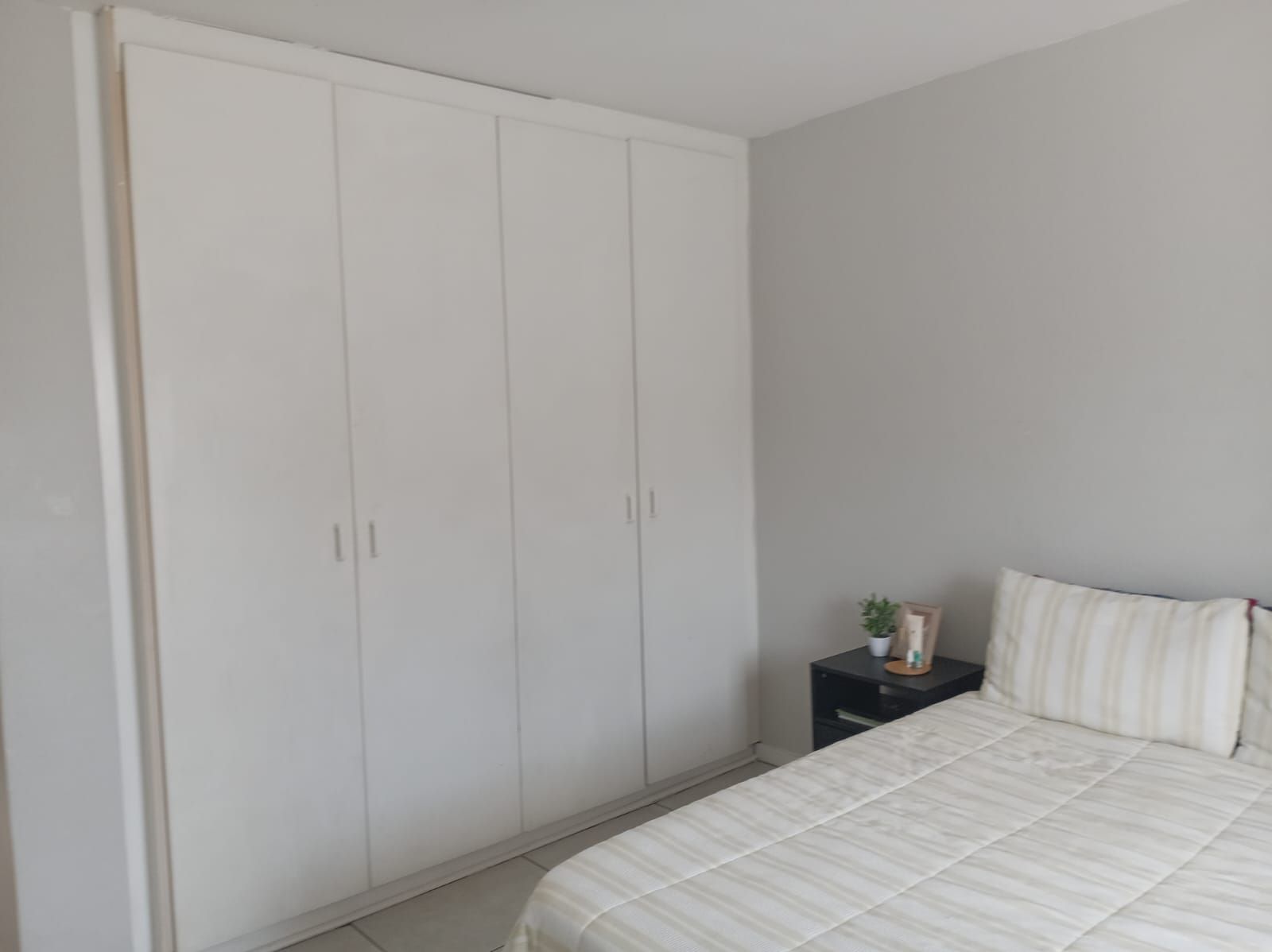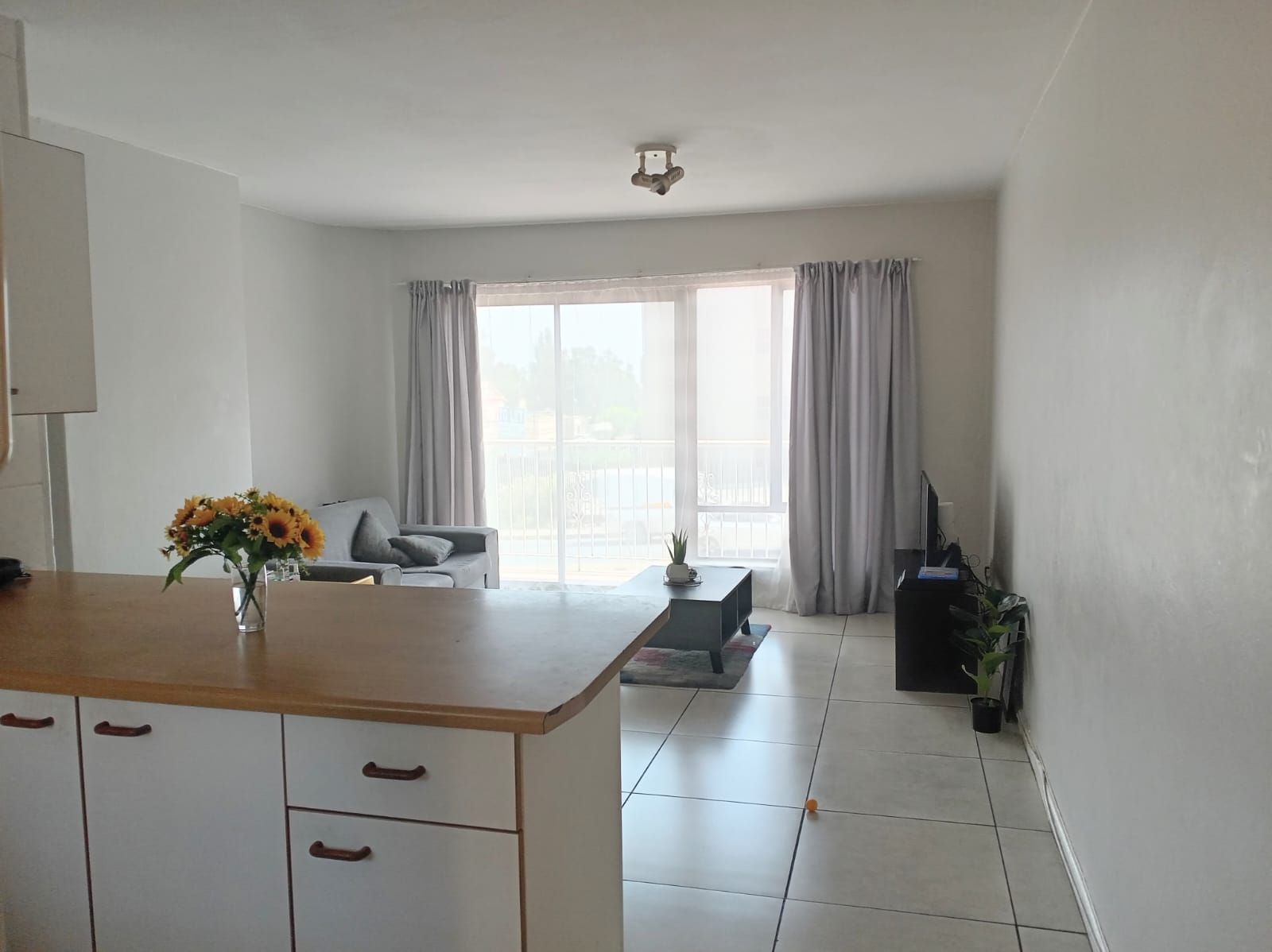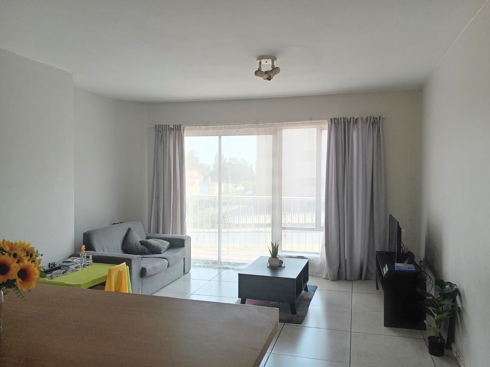 This unit offers two well-sized bedrooms, both fitted with built-in cupboards. The main bedroom faces the main road, allowing plenty of natural light to flood the space, creating a bright and airy atmosphere. The entire apartment is beautifully tiled, adding a clean, modern finish throughout.