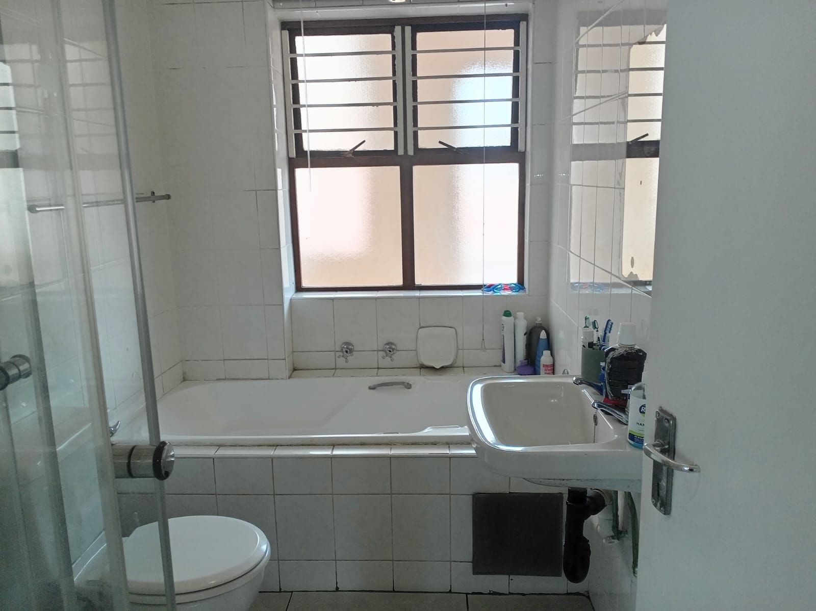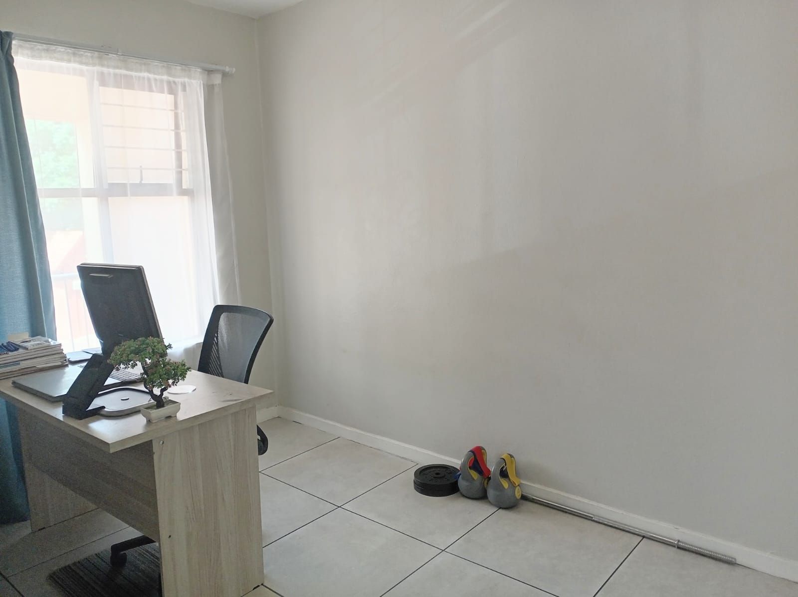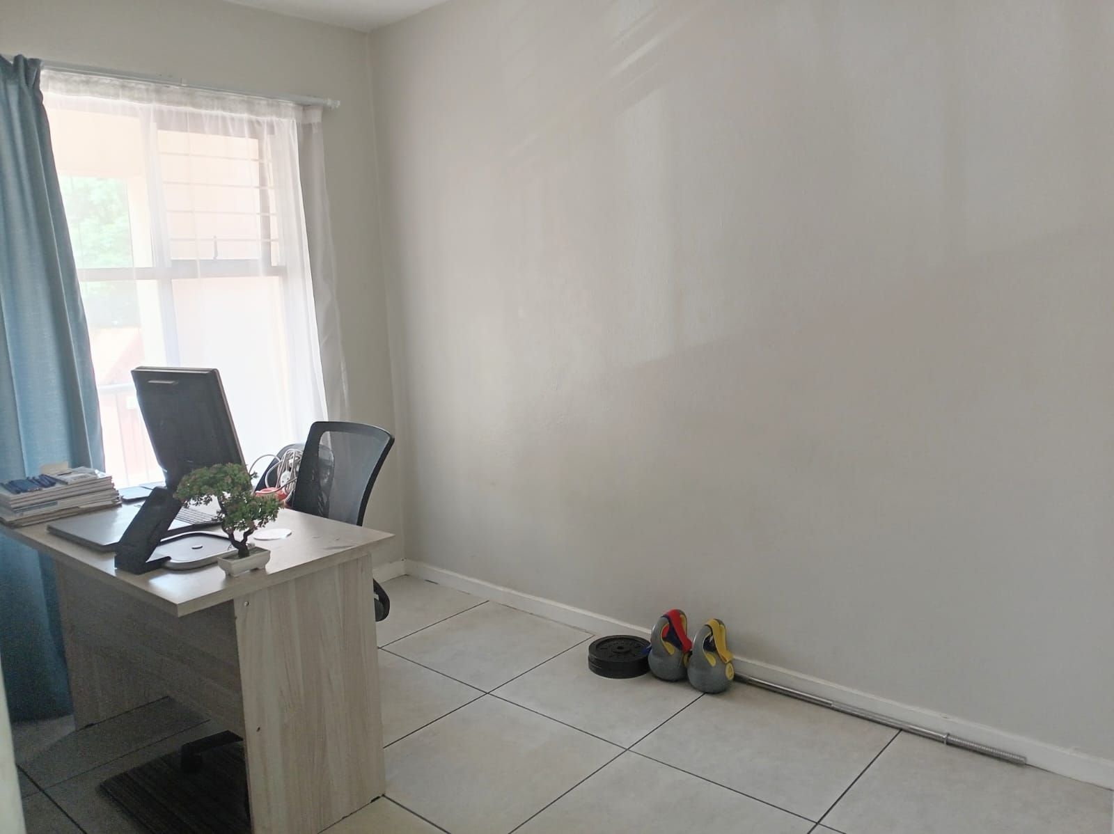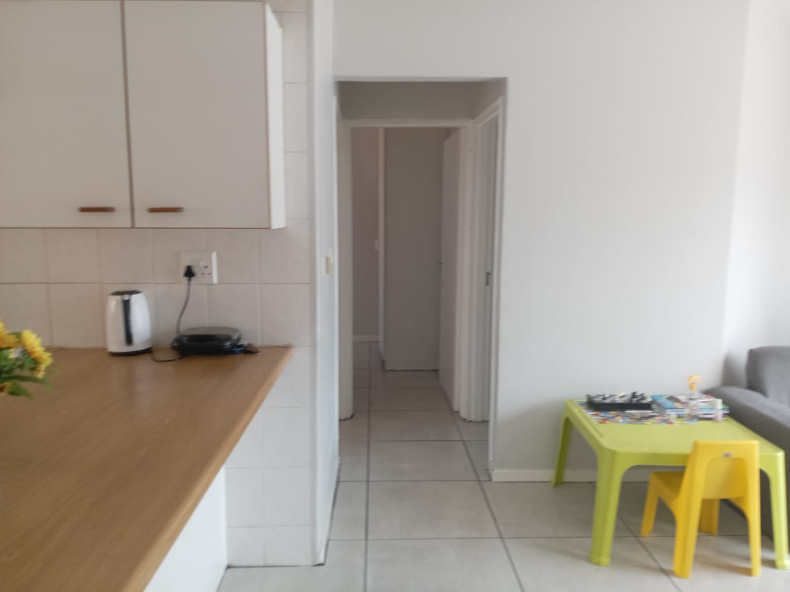 This unit offers two well-sized bedrooms, both fitted with built-in cupboards. The main bedroom faces the main road, allowing plenty of natural light to flood the space, creating a bright and airy atmosphere. The entire apartment is beautifully tiled, adding a clean, modern finish throughout.