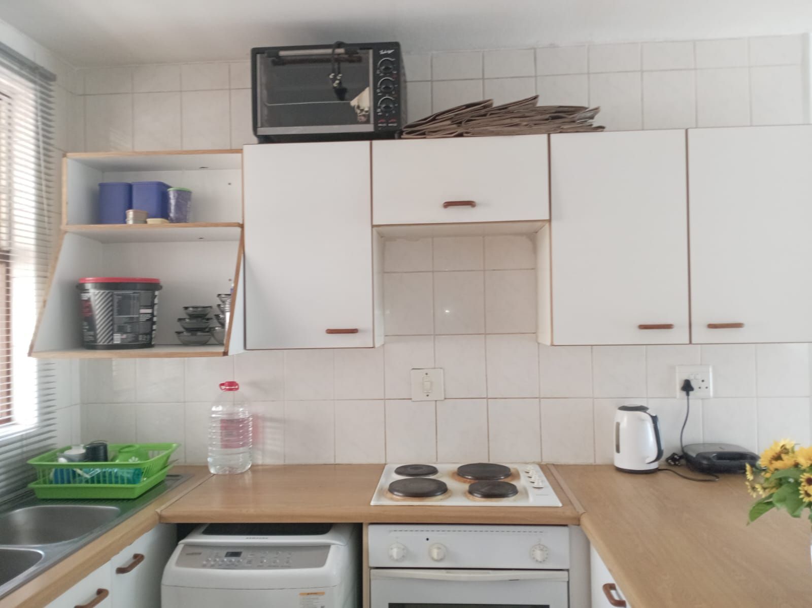 Step into the spacious lounge, perfect for family gatherings or relaxing evenings, which flows effortlessly onto the balcony. The open-plan kitchen is well-designed with ample cupboard space, beautiful countertops, and a washing machine connection for added practicality.
