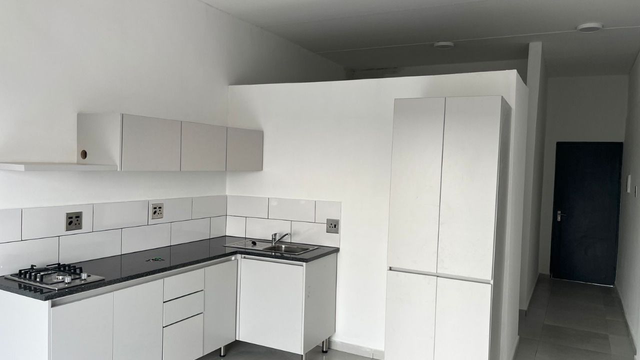 The open-plan kitchen is thoughtfully designed with premium finishes, featuring a high-quality kitchen unit, a built-in oven, and a gas stove. The layout includes a welcoming living area, a delightful bedroom complete with an ensuite bathroom and a large geyser. The residence is entirely tiled and boasts spacious, state-of-the-art built-in wardrobes, complemented by a balcony that provides stunning views. Additionally, the property is equipped with a lift for added convenience and grants access to a communal swimming pool.
