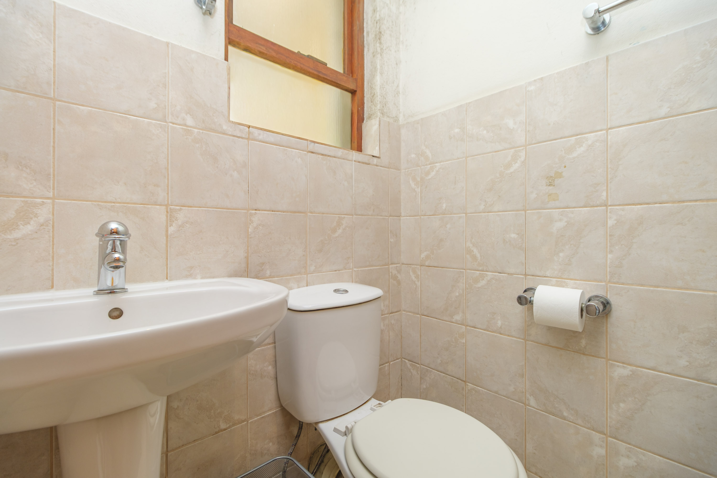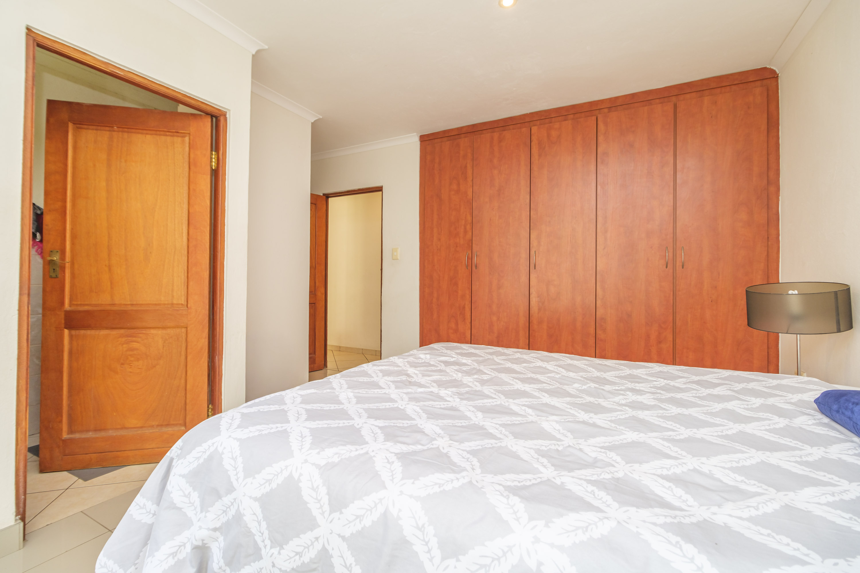The kitchen is functional and well-designed, with ample cupboard space and room for appliances. Two spacious bedrooms provide excellent accommodation, with the main bedroom featuring an en-suite bathroom for added privacy. The second bathroom is conveniently positioned for guests or family.