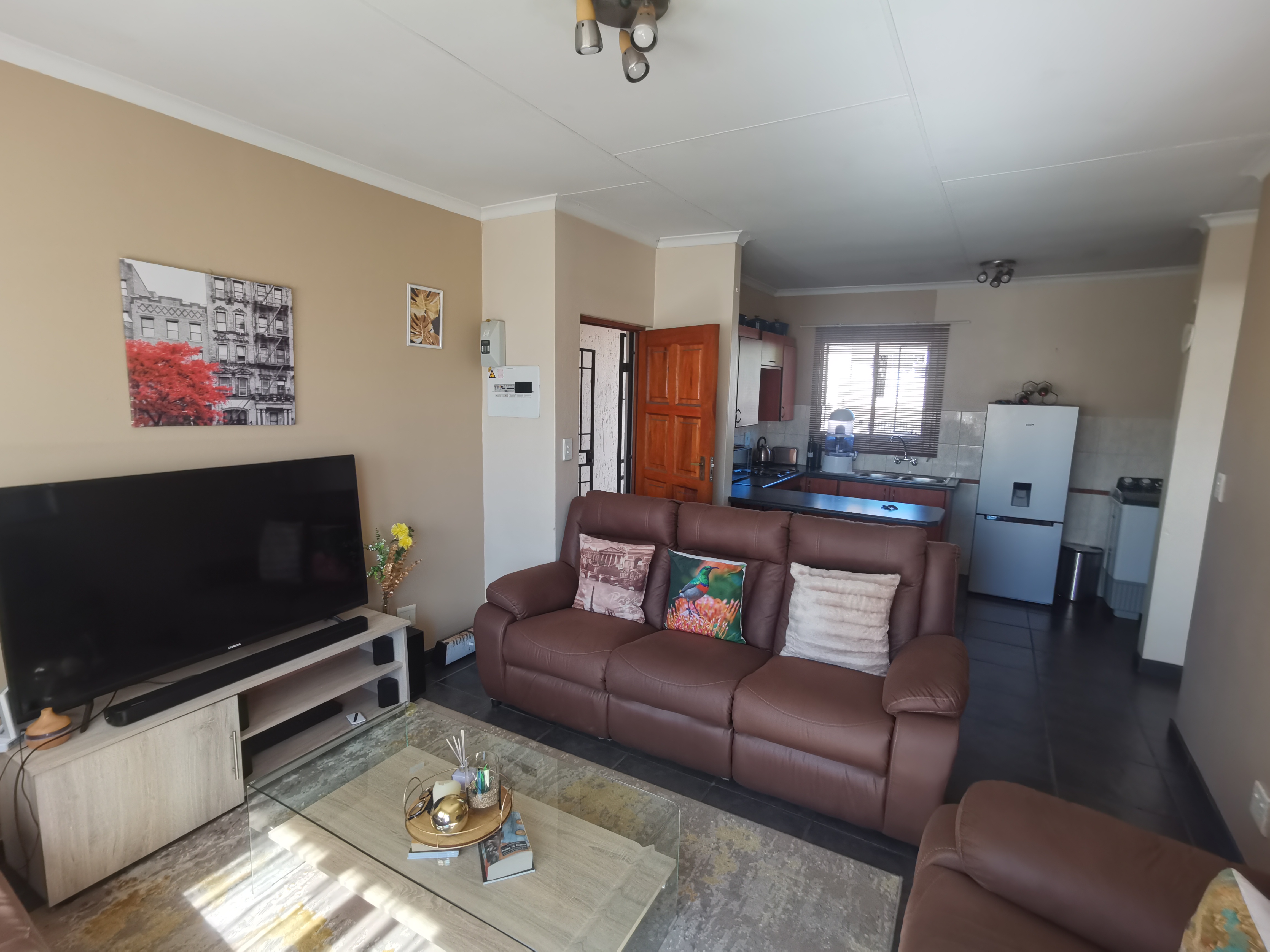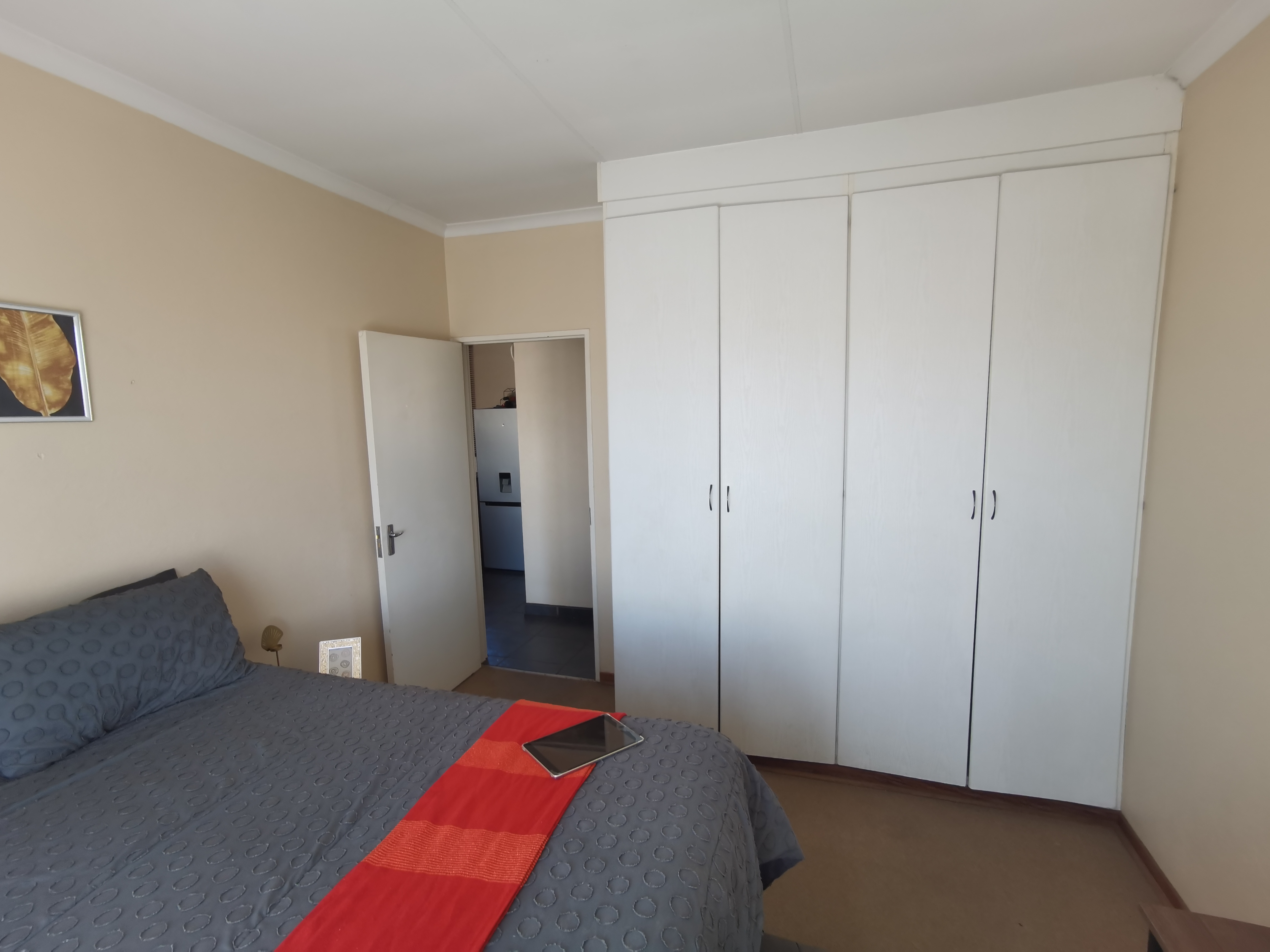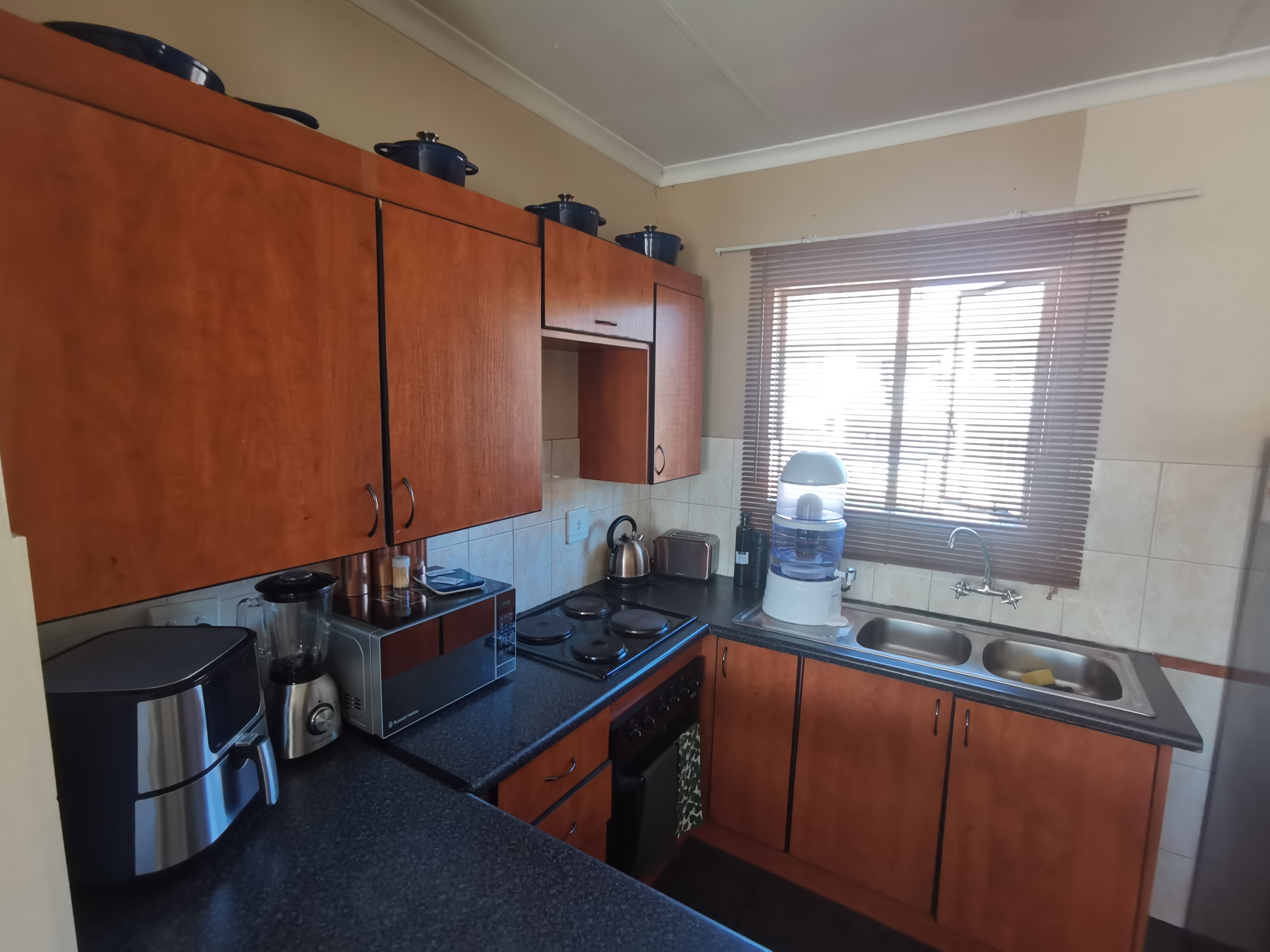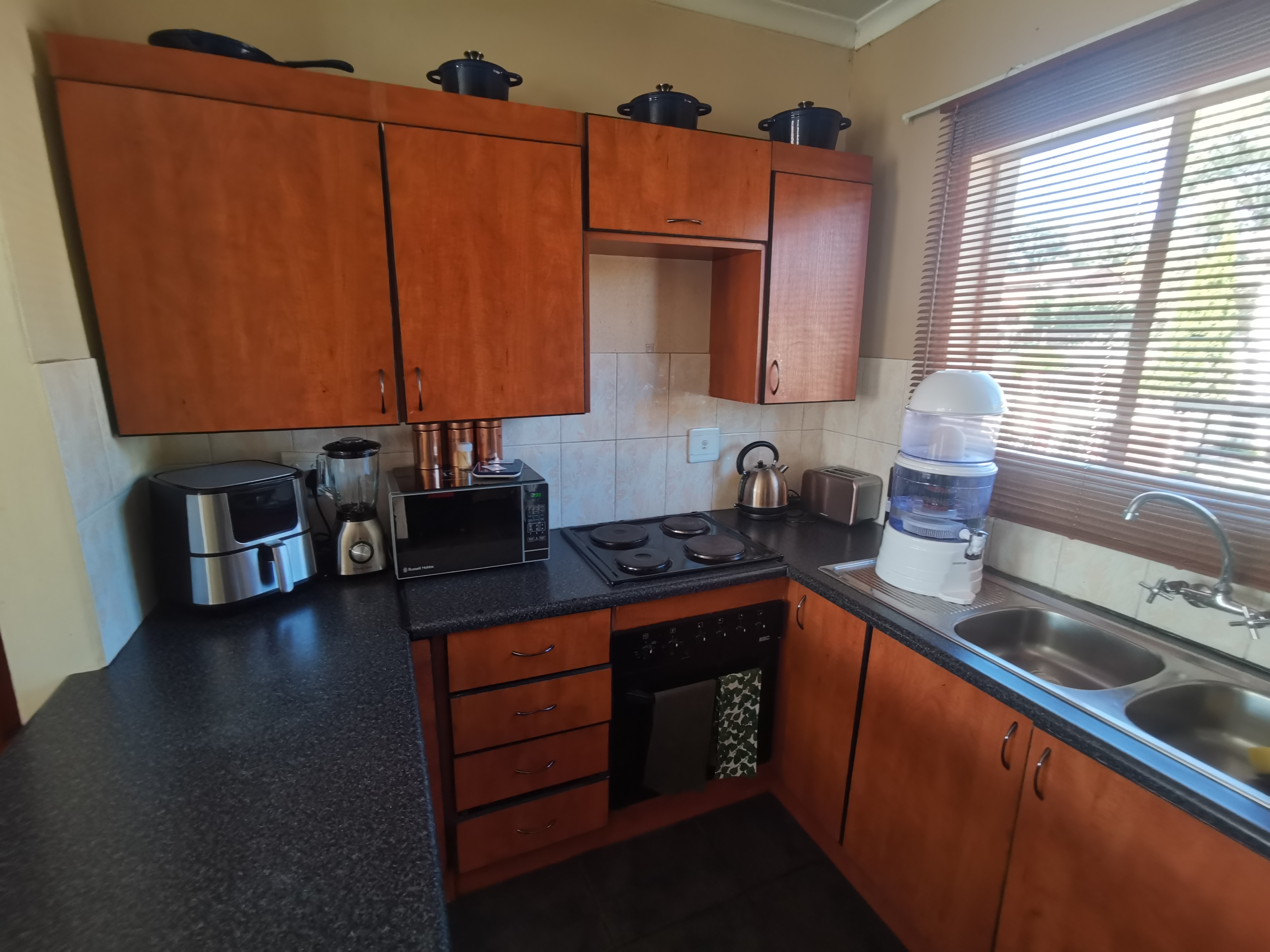 The open plan kitchen with breakfast nook and three appliance spaces flows into the tiled, airy, lounge, which open with a sliding door onto a sunny balcony with Northern views.
