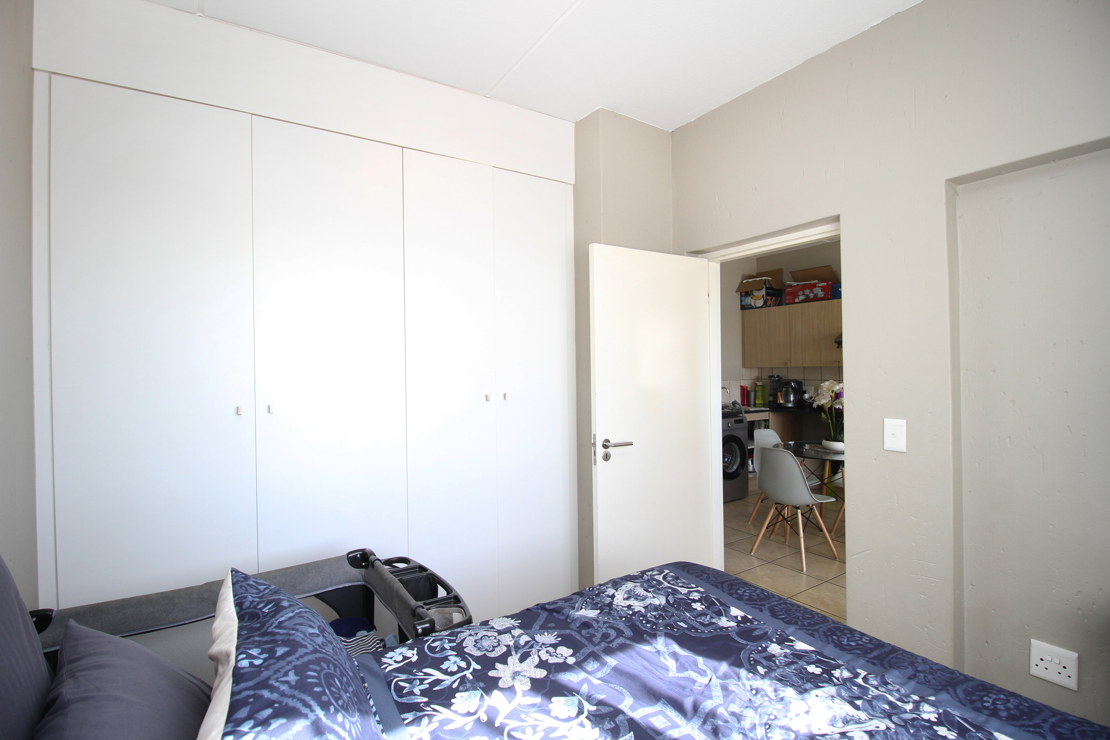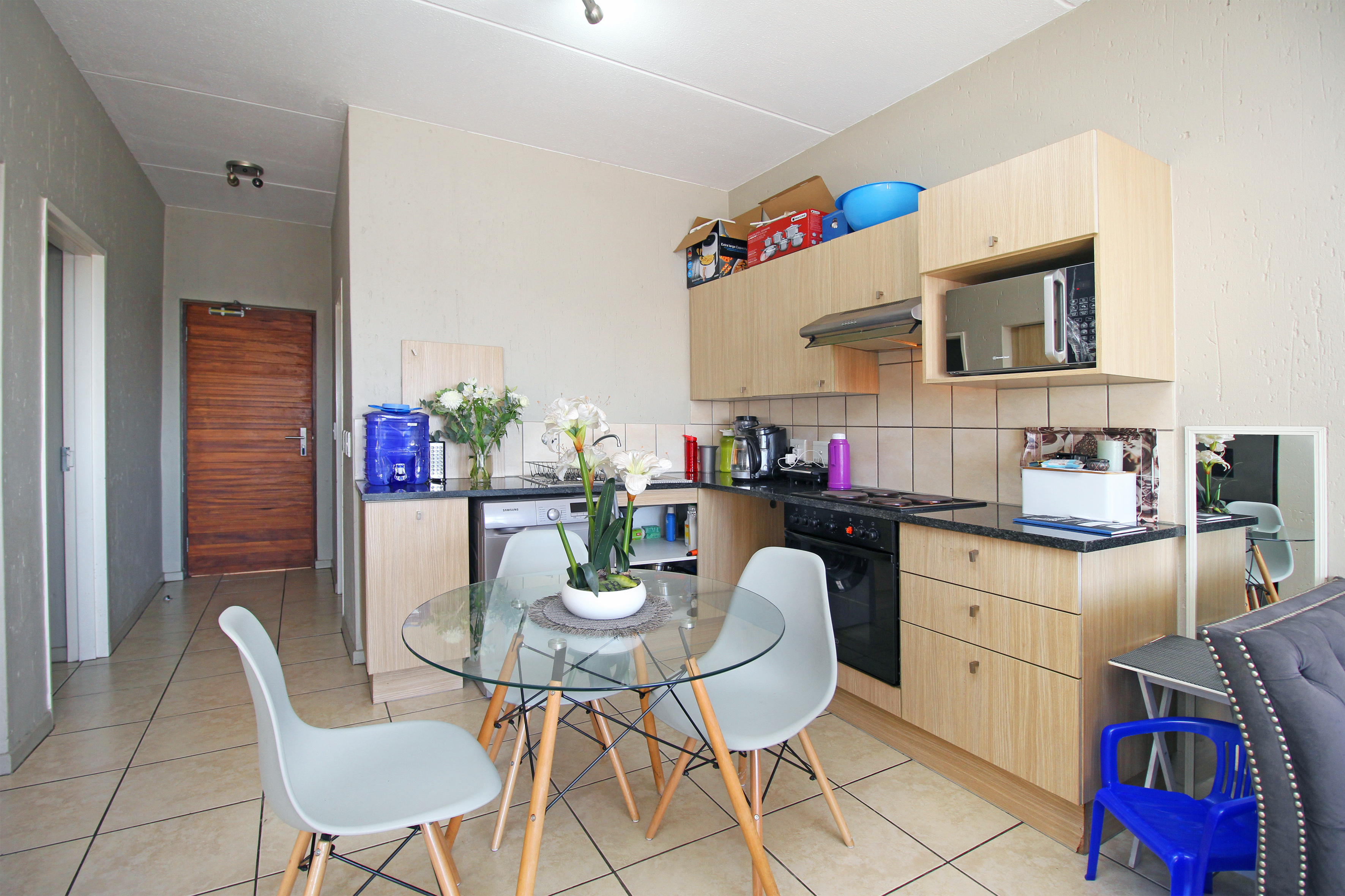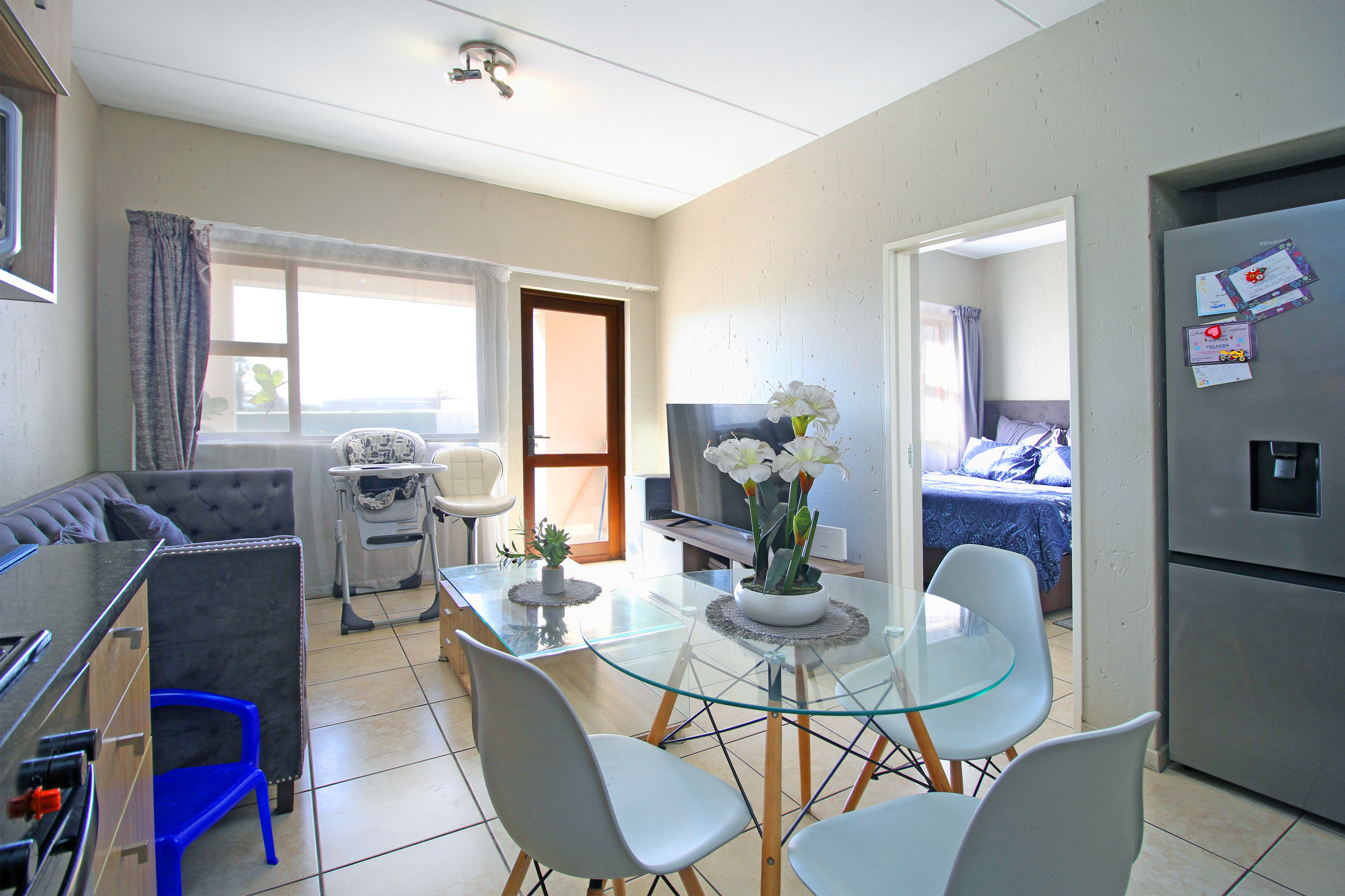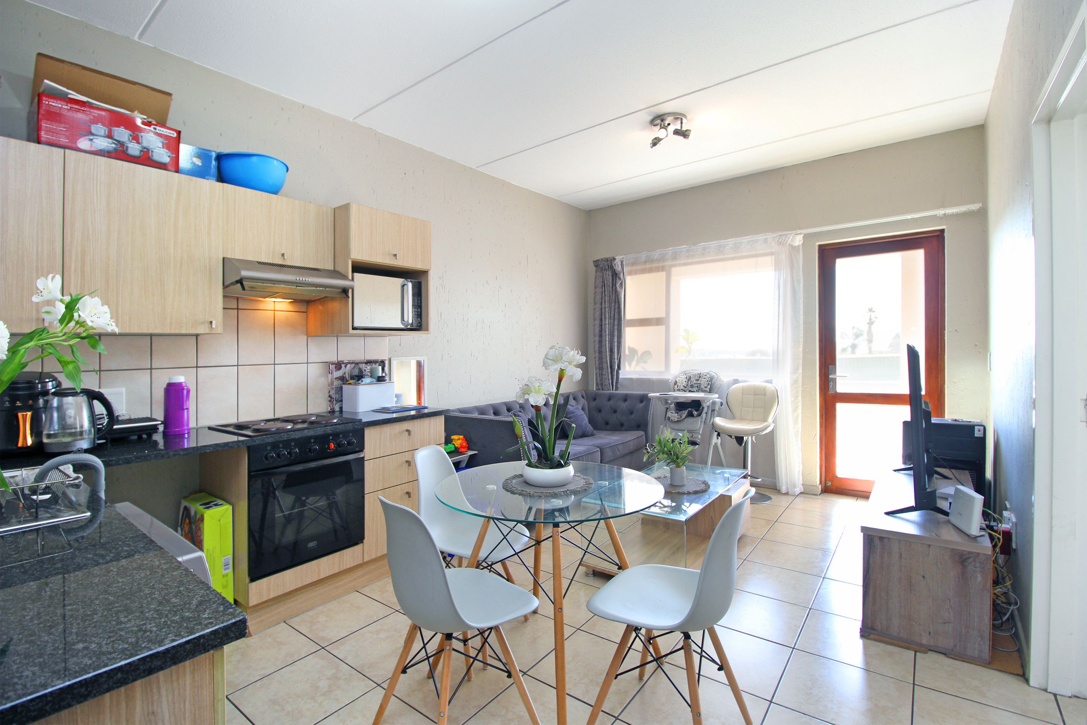 The unit features an open-plan lounge and dining area, a kitchen fitted with granite countertops, and two well-sized bedrooms with built-in cupboards. The bathroom includes a shower-over-bath combination.