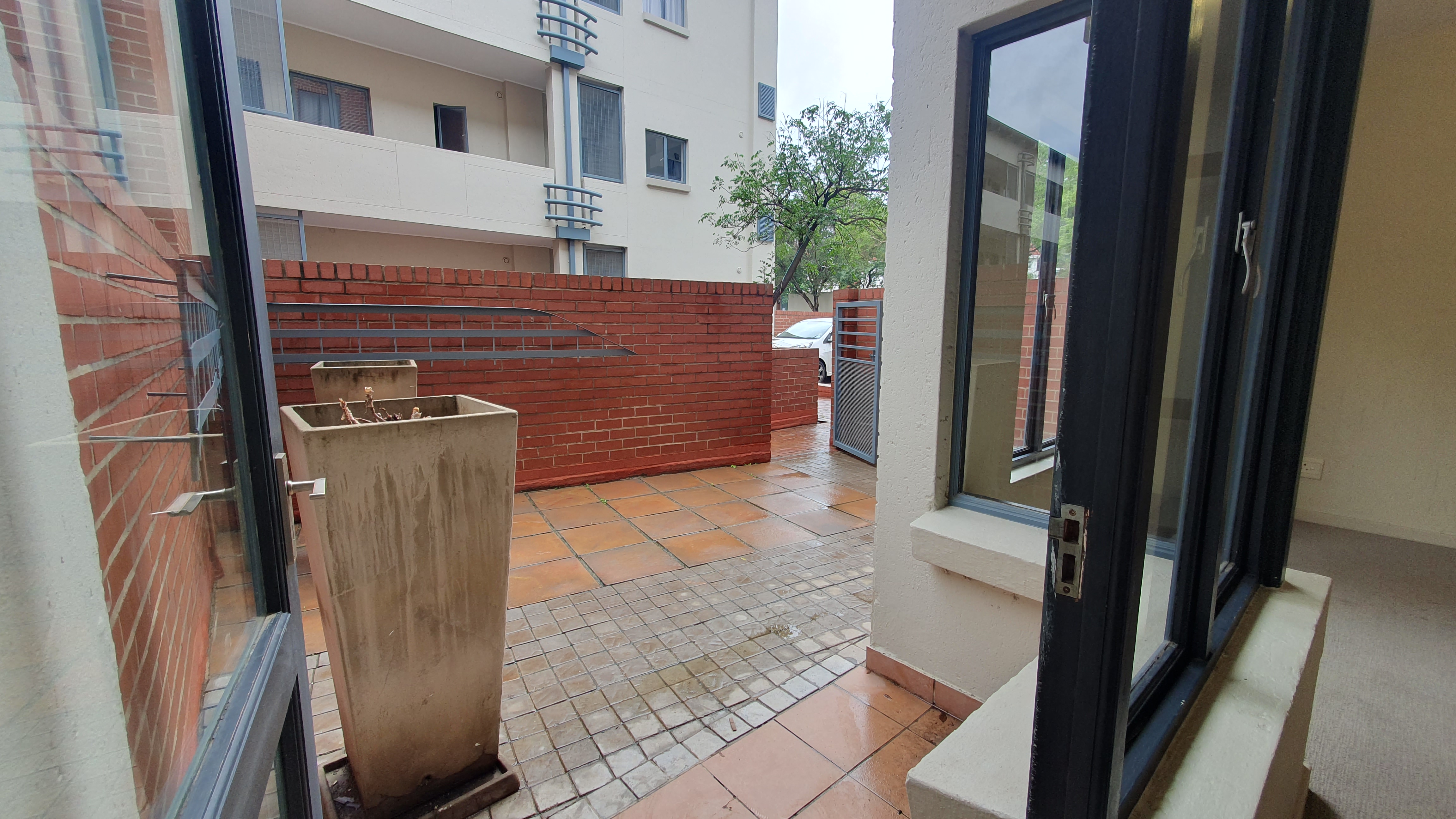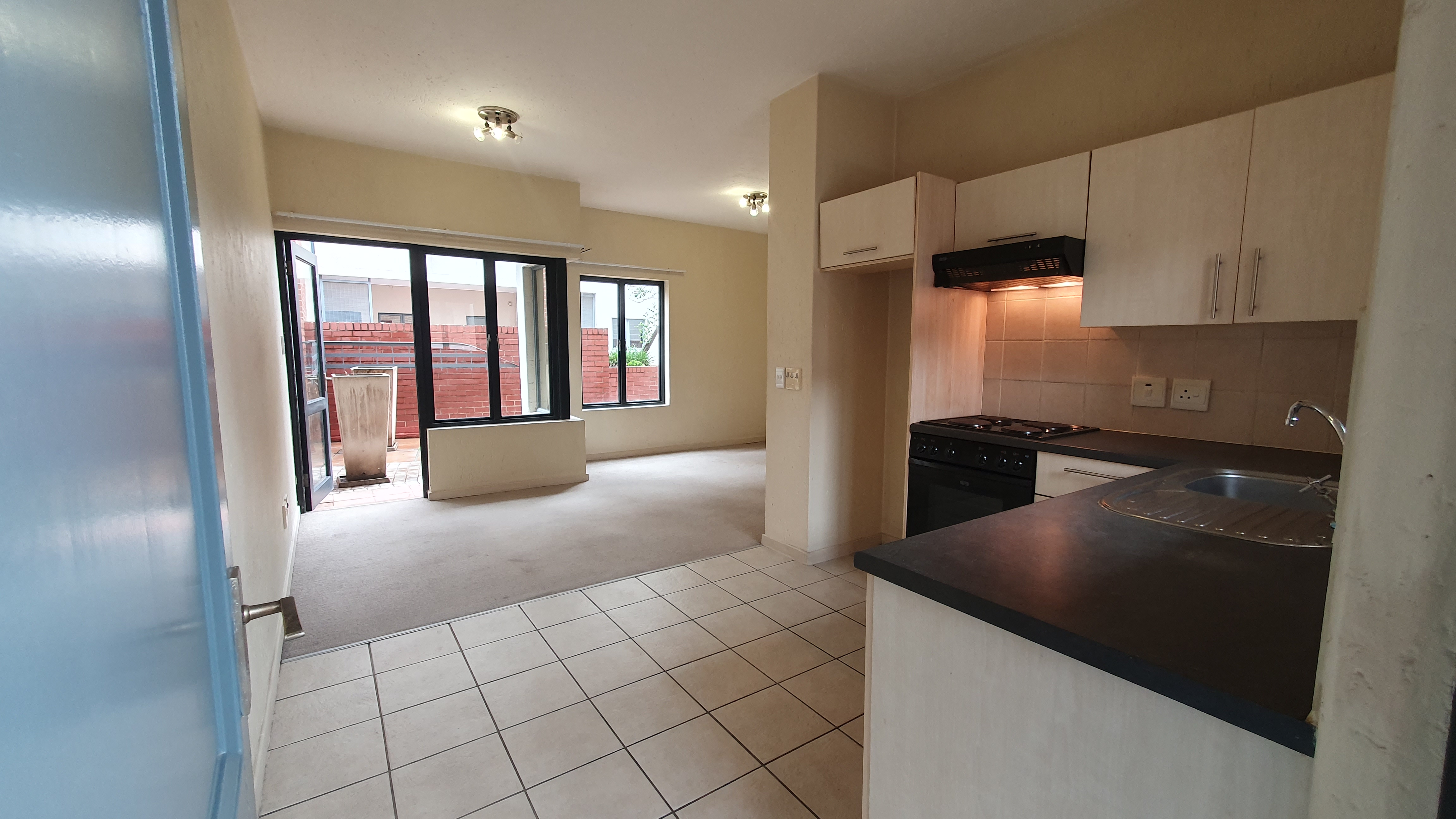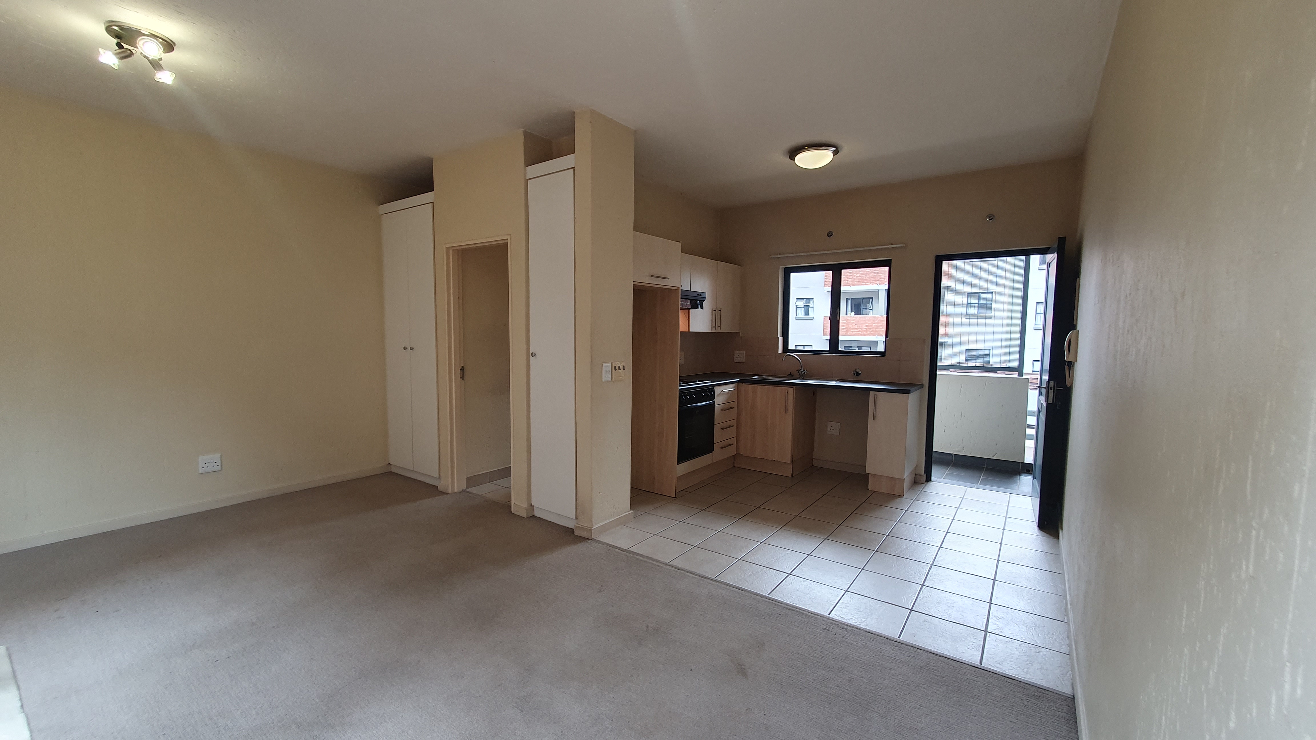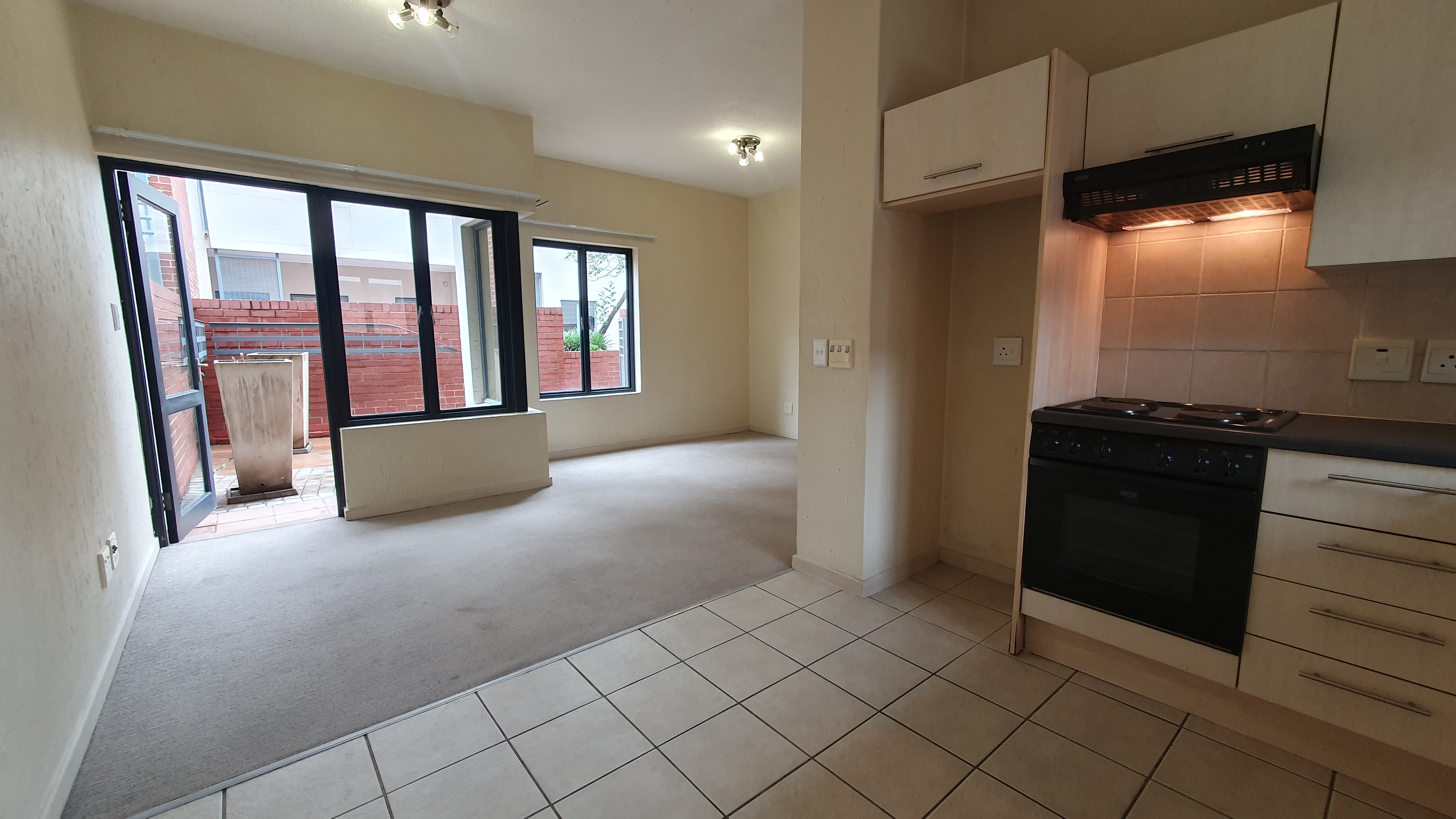 This is a ground floor STUDIO located in 456 Cypress in Ferndale, Randburg. Suitable for 1 person or a couple. The unit is completely open plan. On entrance, you will find the small but neat kitchen with everything you need. There is space for 1 under counter appliance and a single door fridge.The lounge area and bedroom area are carpeted. There are built in cupboards in the bedroom area. The bathroom offers a bath. The patio and courtyard are nice in size.
