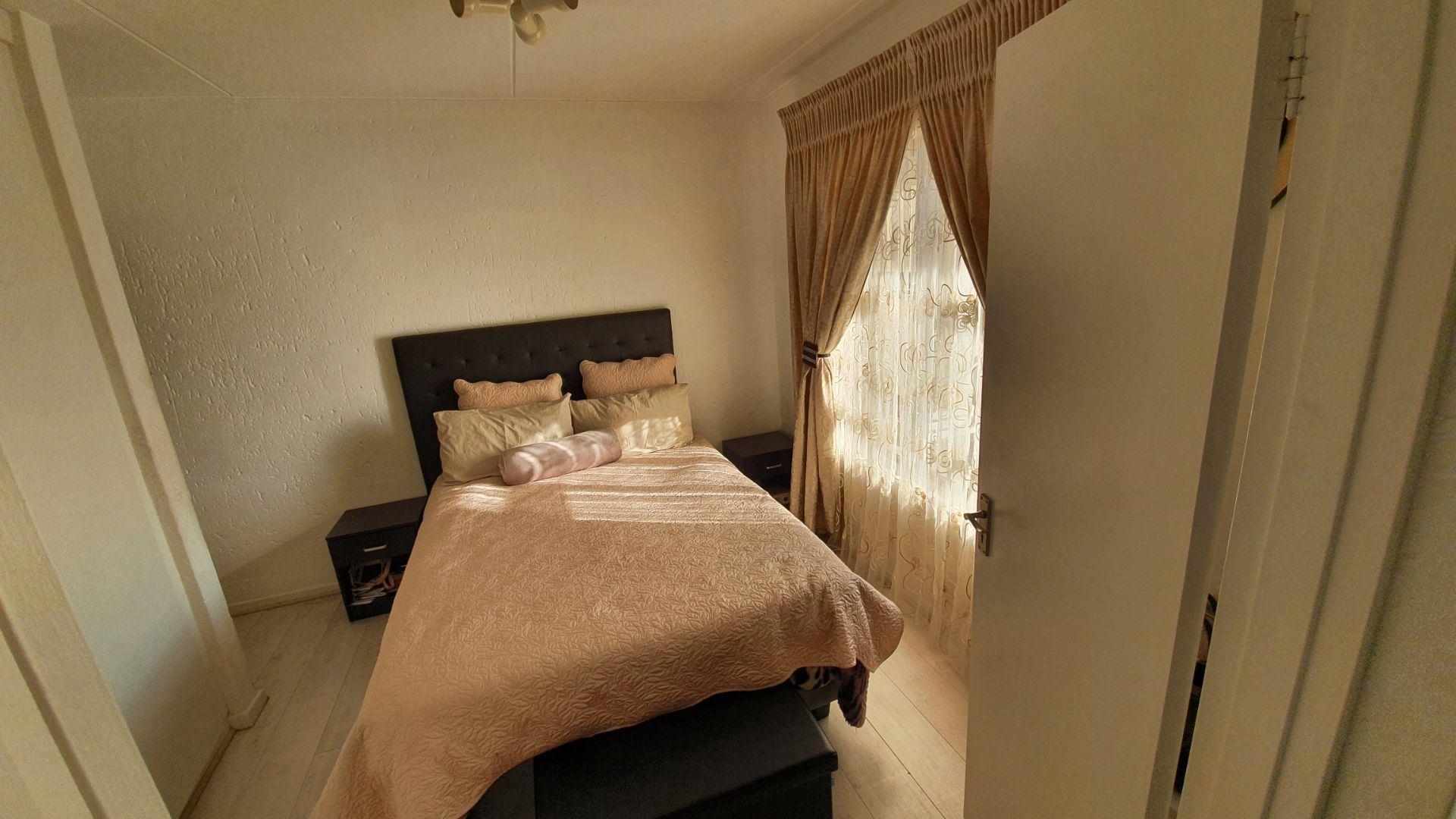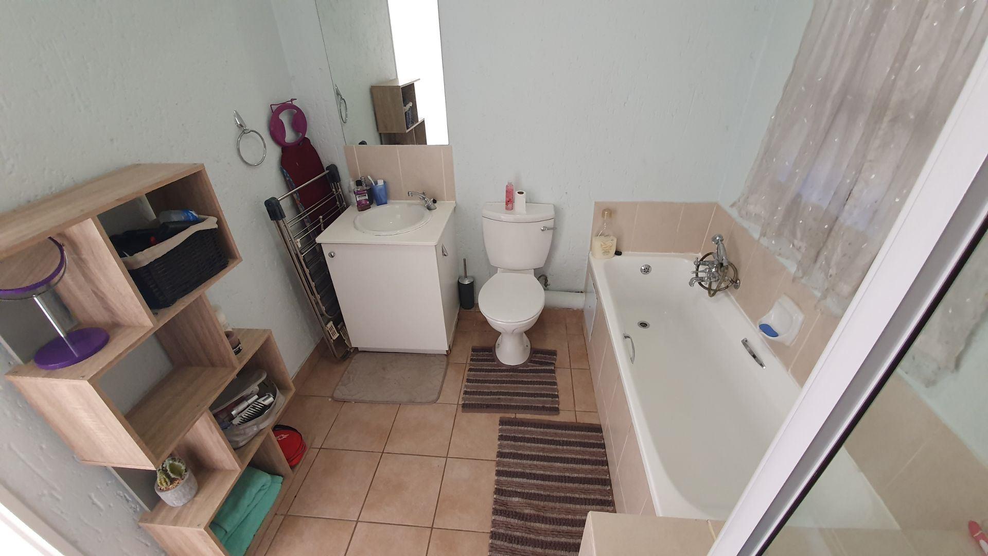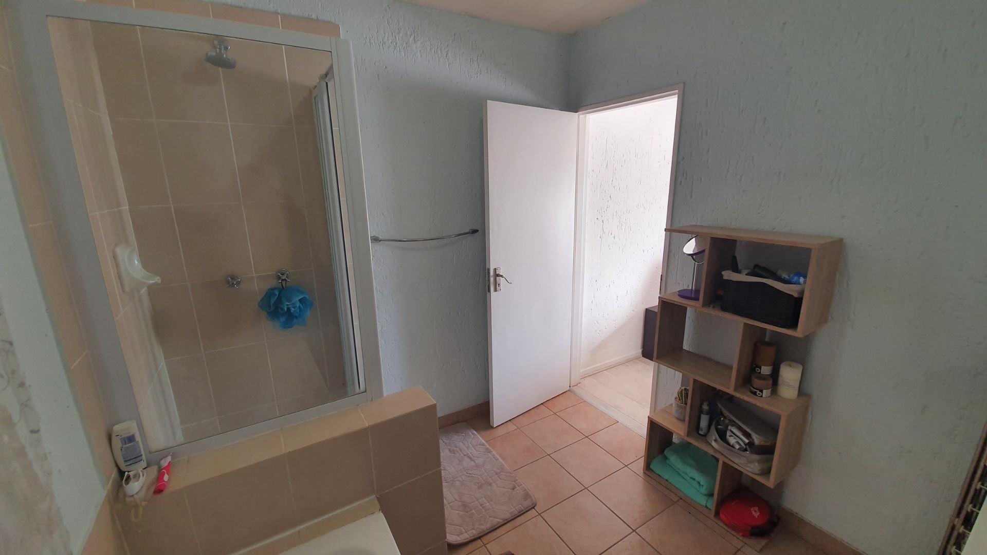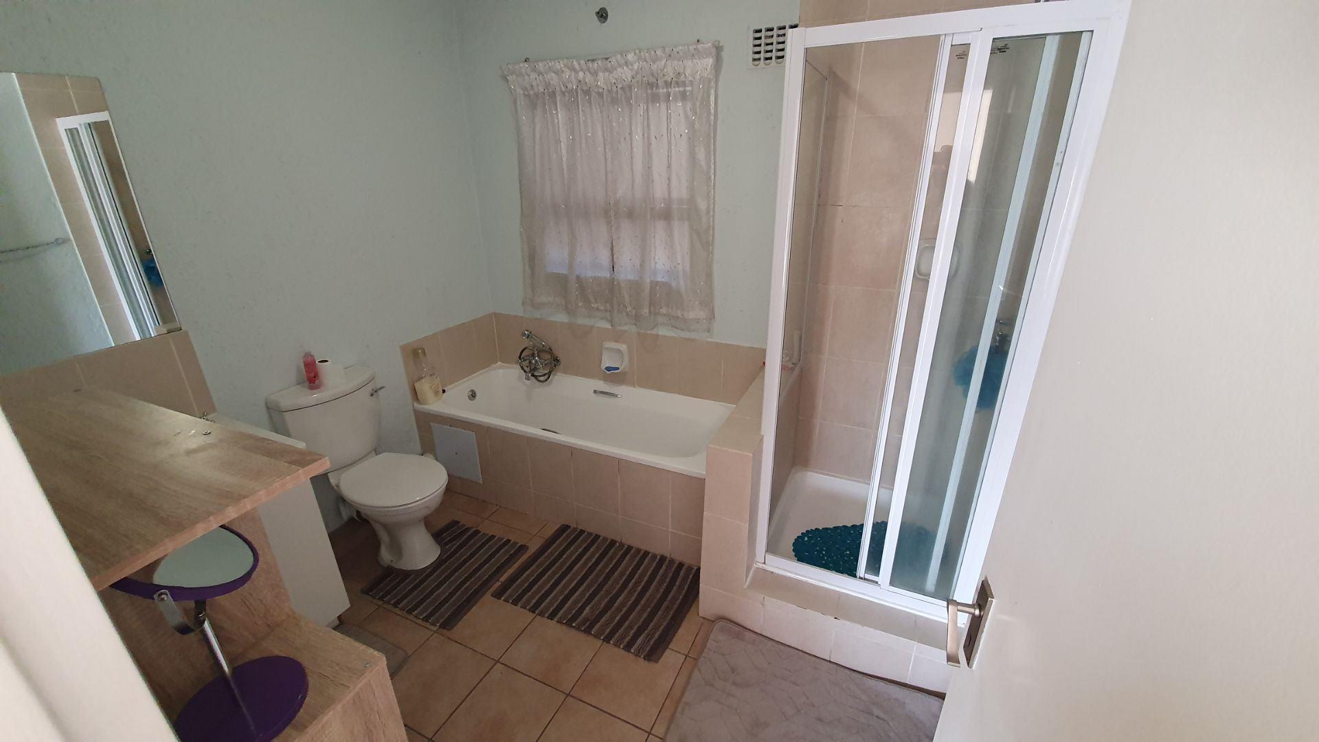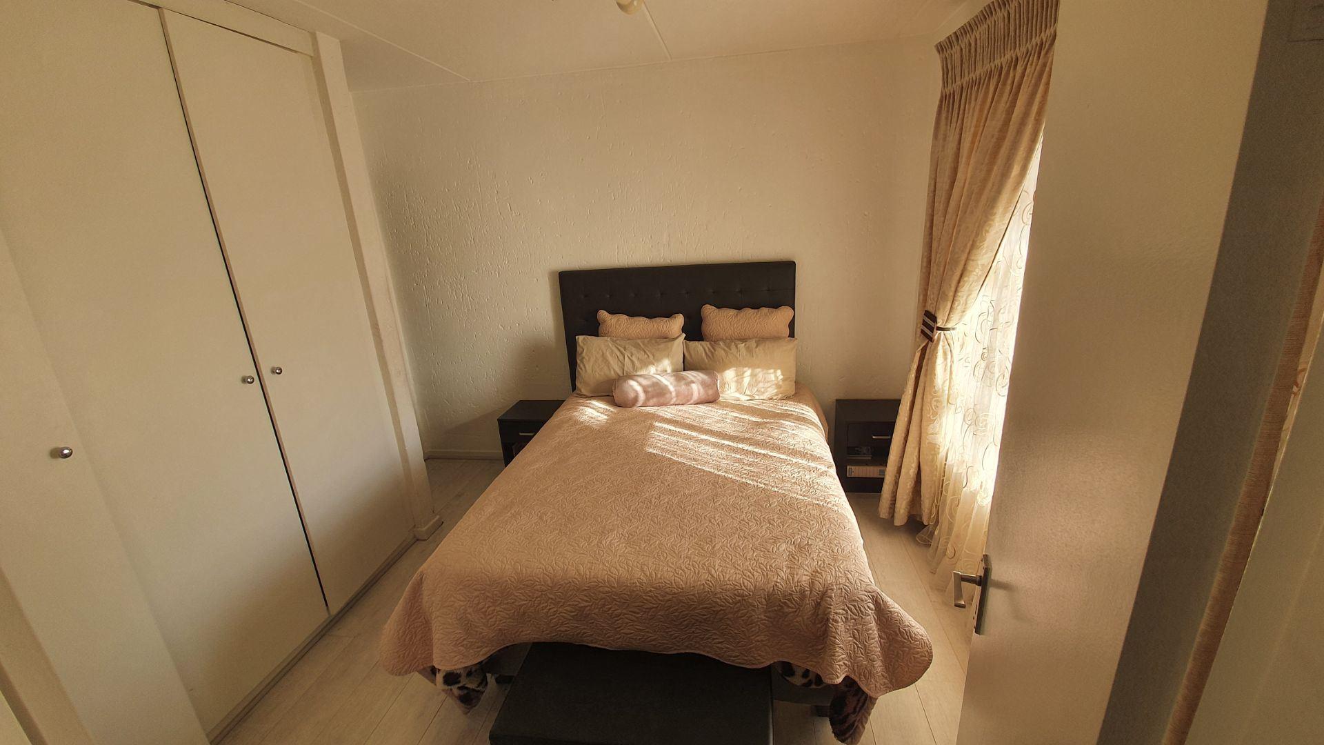 The bedroom features laminate flooring, built-in cupboards, and comfortably accommodates a queen-size bed. Full bathroom fitted with both a bath and a shower.