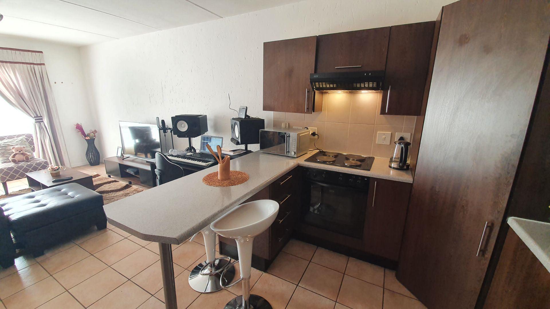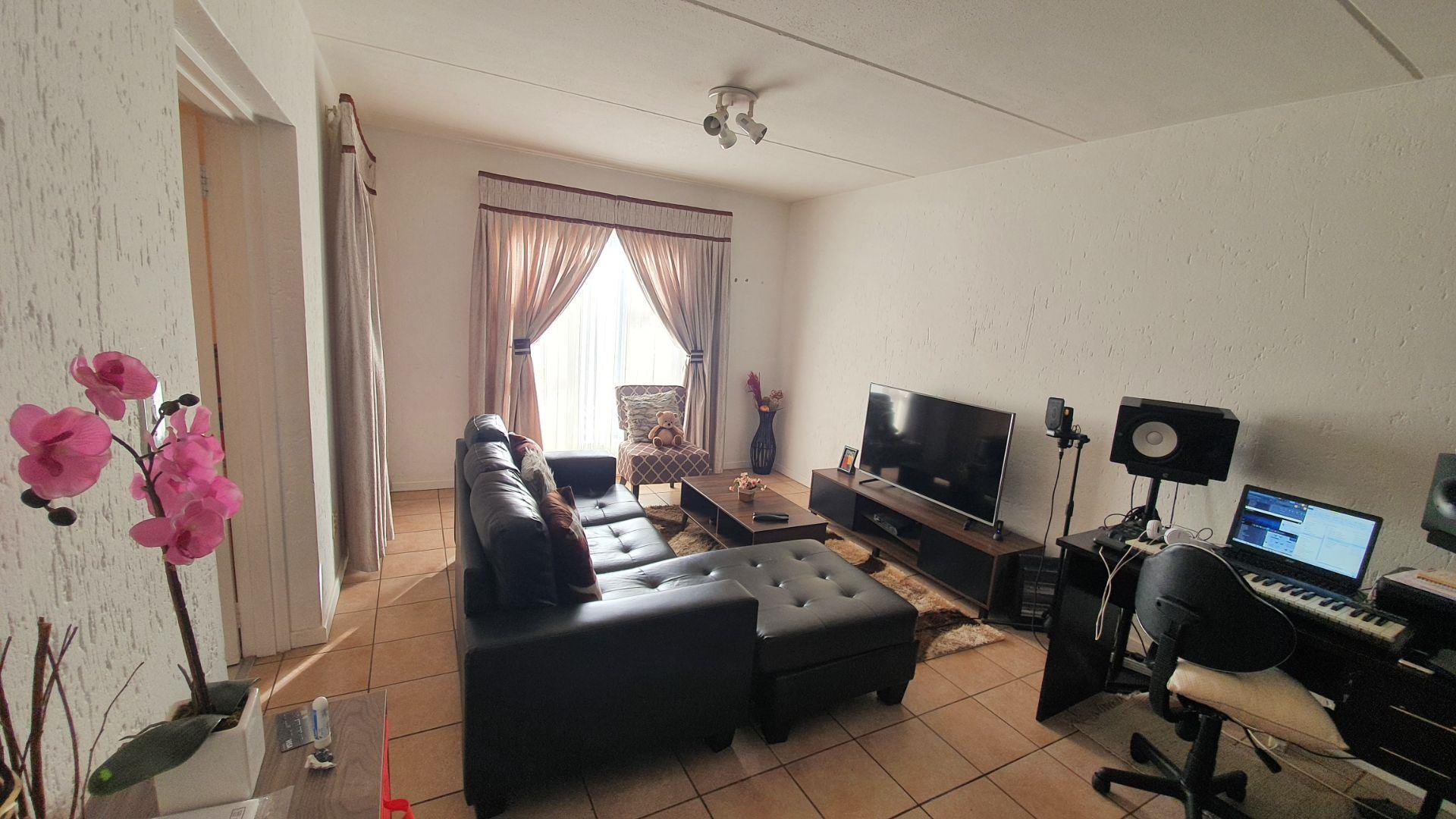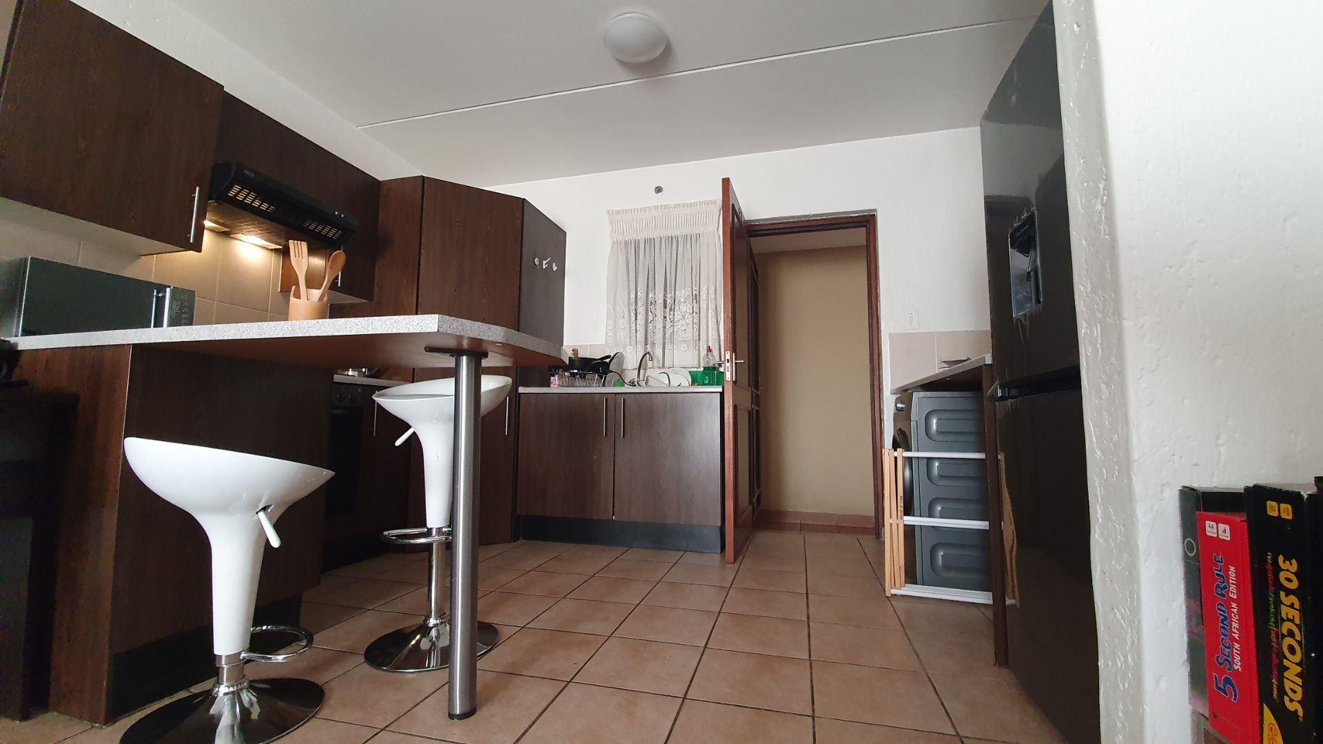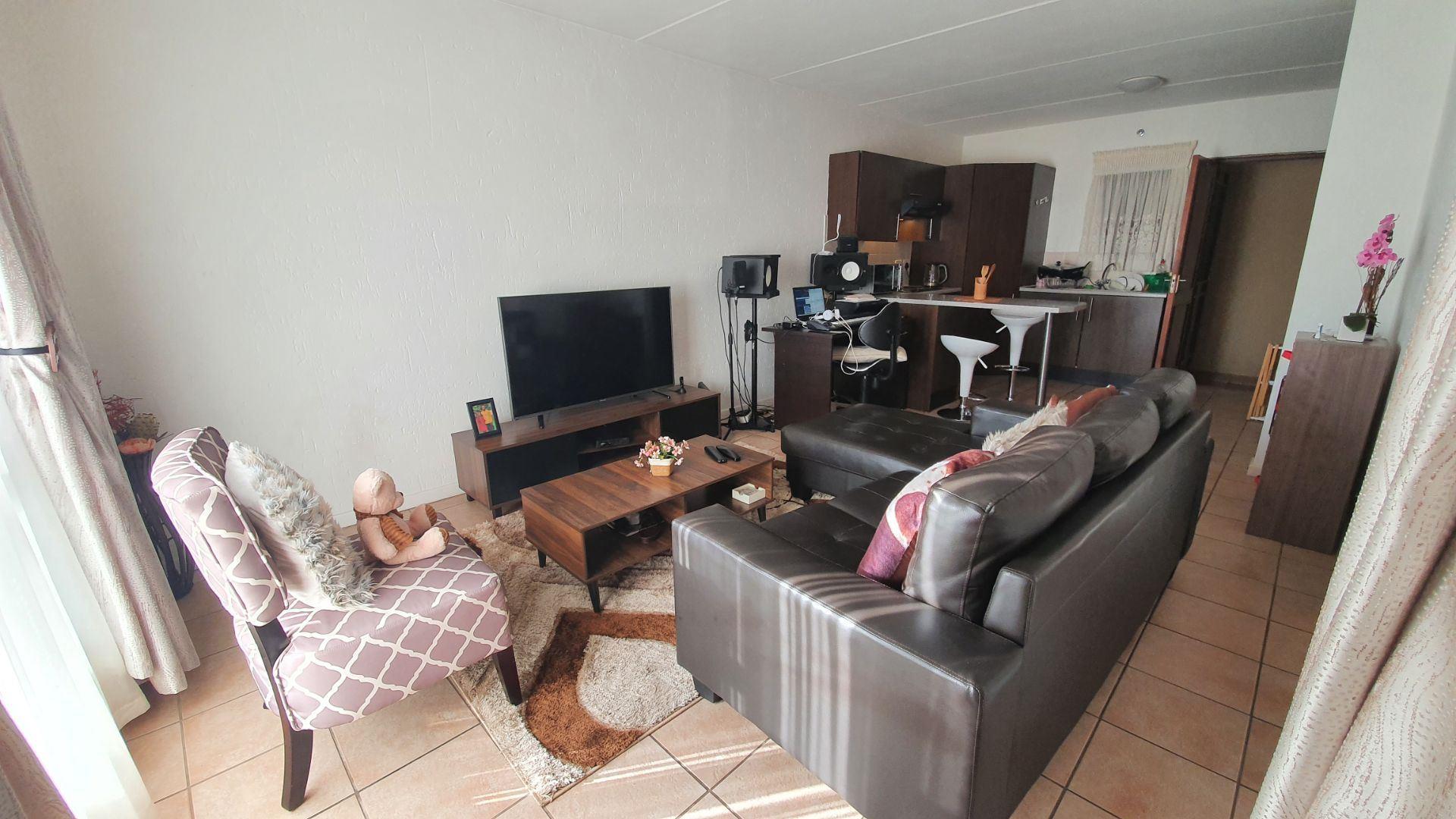Upon entering, you are welcomed into an open-plan kitchen and living area. The kitchen offers a large pantry cupboard and space for two under-counter appliances. The living room is DSTV-ready and opens onto a covered patio, ideal for relaxed indoor-outdoor living.
