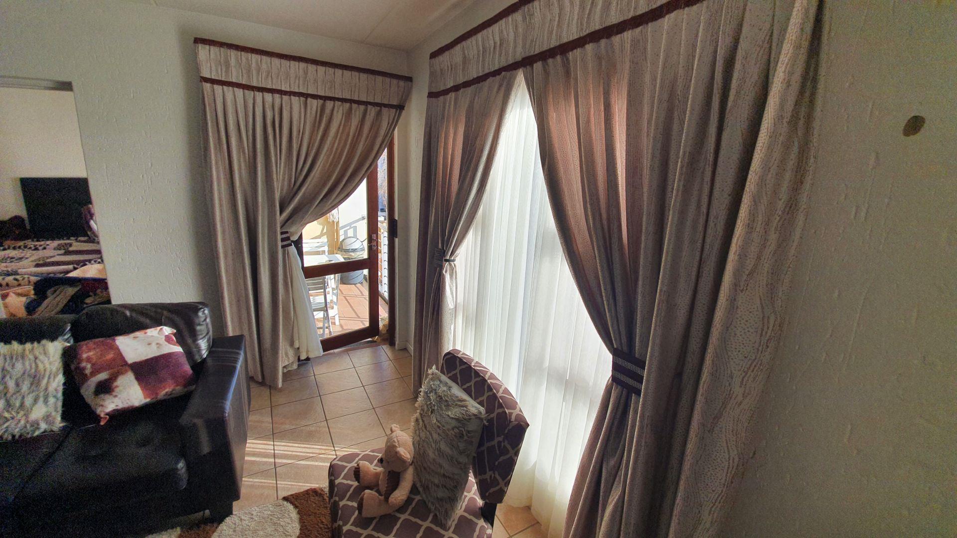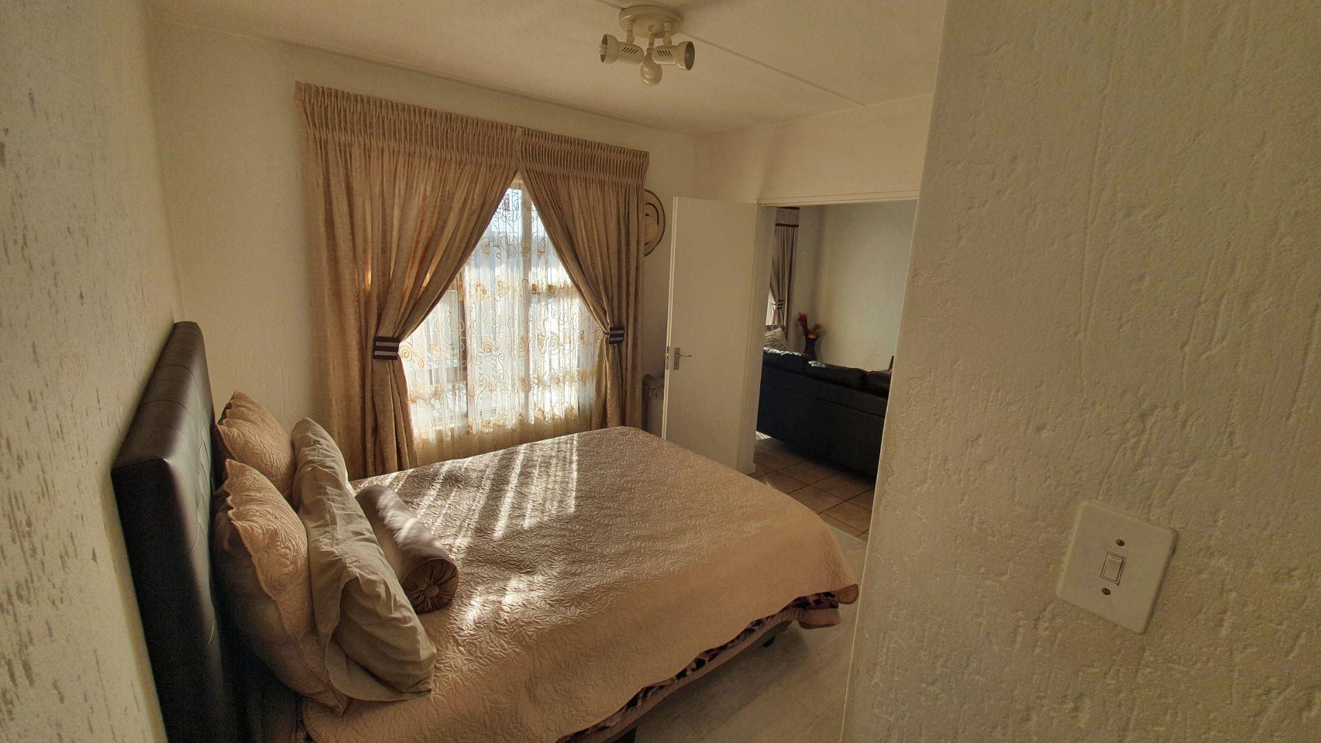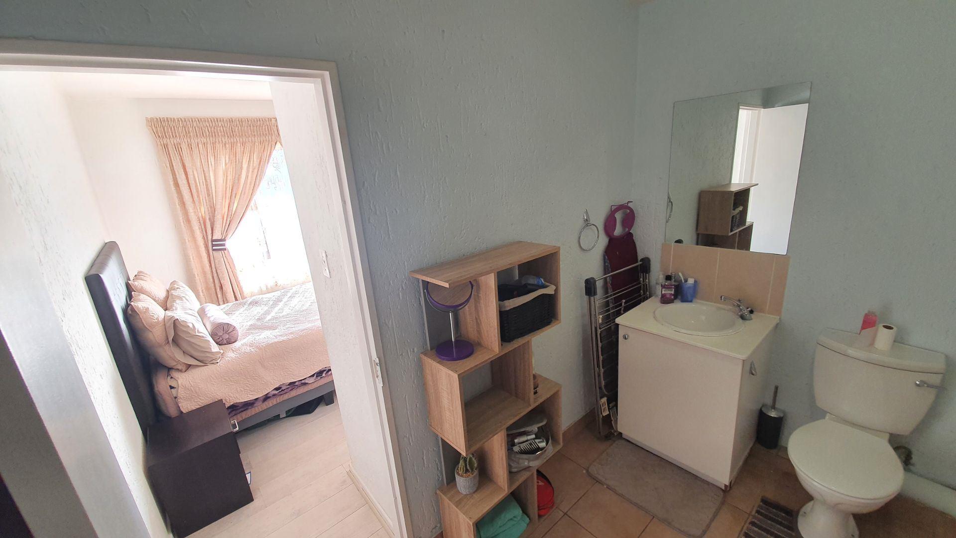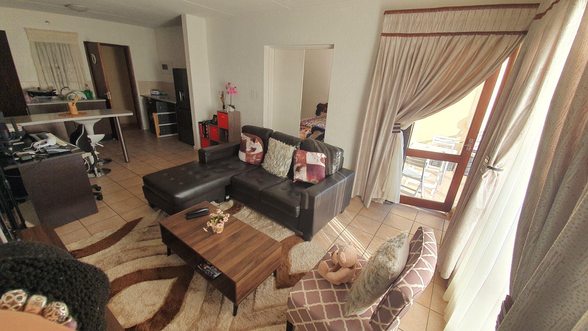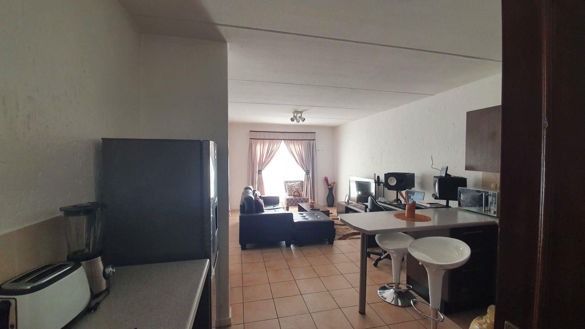 Upon entering, you are welcomed into an open-plan kitchen and living area. The kitchen offers a large pantry cupboard and space for two under-counter appliances. The living room is DSTV-ready and opens onto a covered patio, ideal for relaxed indoor-outdoor living.