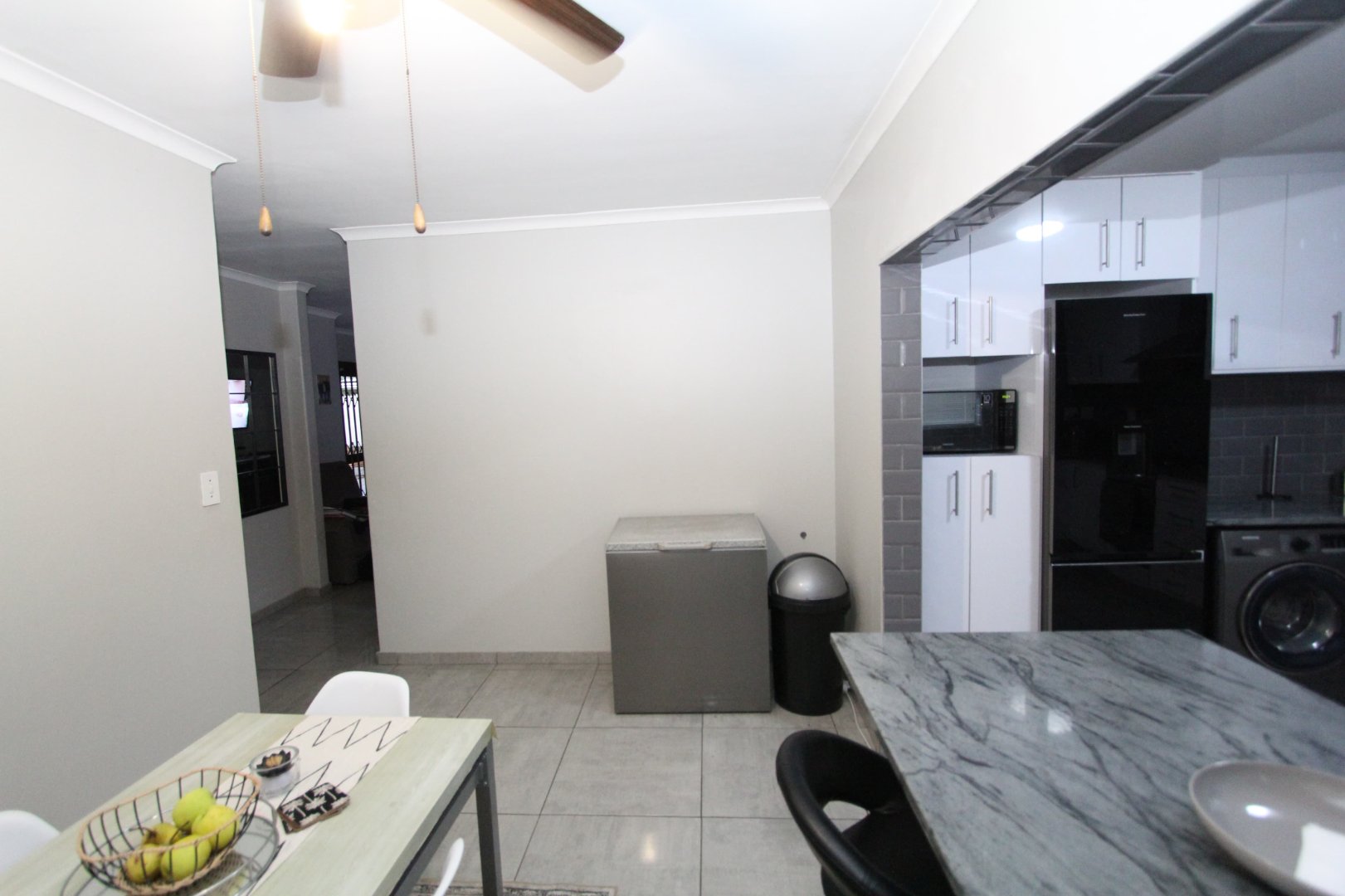 Adjacent to the kitchen, the cozy living area invites relaxation with its comfortable layout and abundant natural light. The flow from the living space to the expansive front yard is seamless, making outdoor entertaining a breeze. Picture yourself unwinding with family and friends under the summer sky, grilling up a feast with the built-in braai area, creating memories that will last a lifetime.
