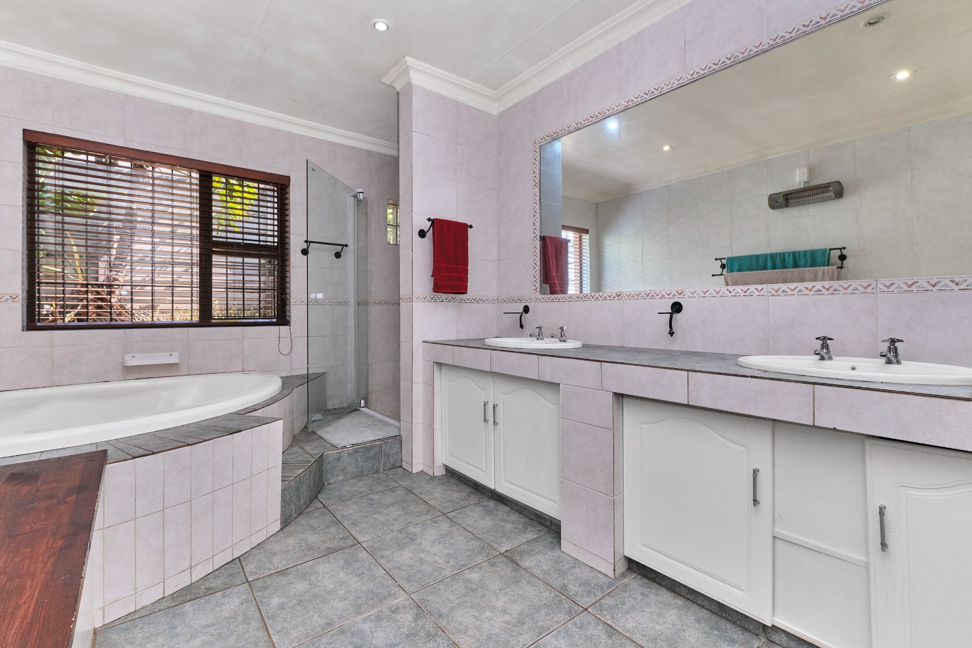 The main bedroom designed to comfortably fit a King-sized bed offers ample Built-In Cupboards and has sliding door allowing you to step onto the tranquil garden. The main en-suite bathroom offers a jacuzzi style bath, shower and his and hers basins.