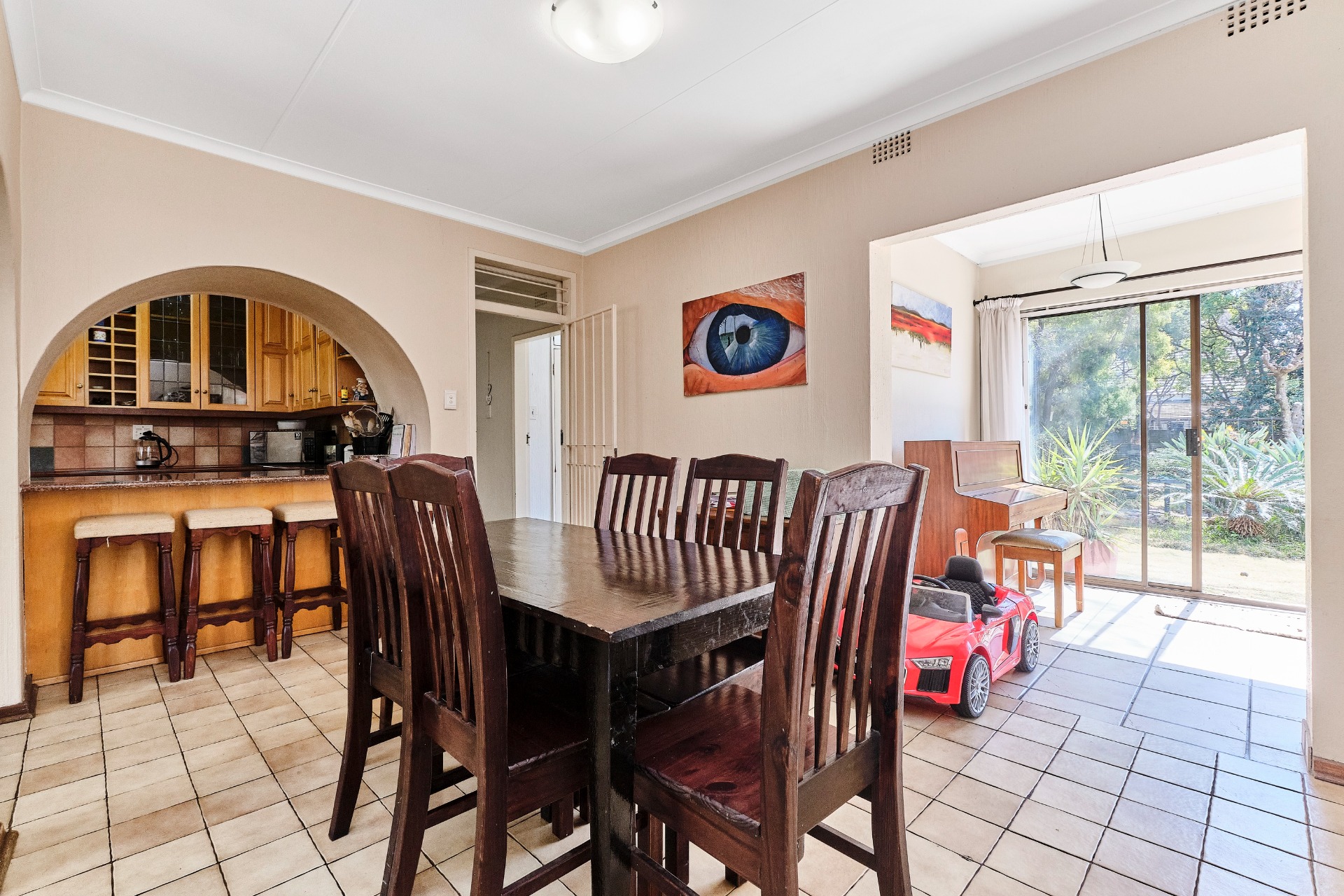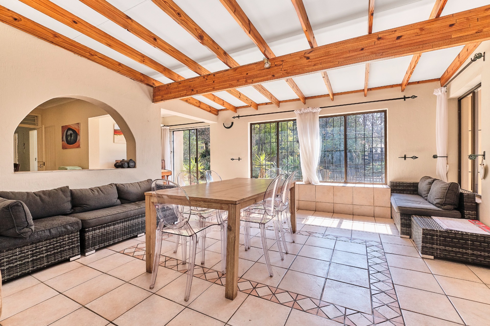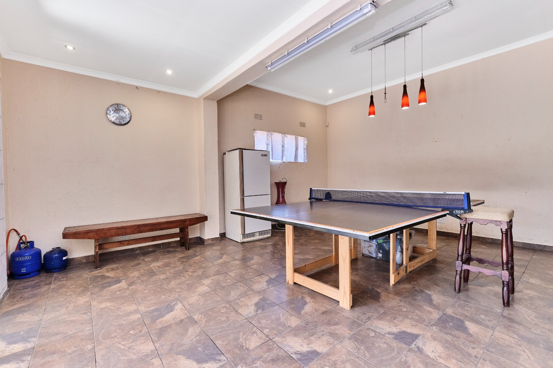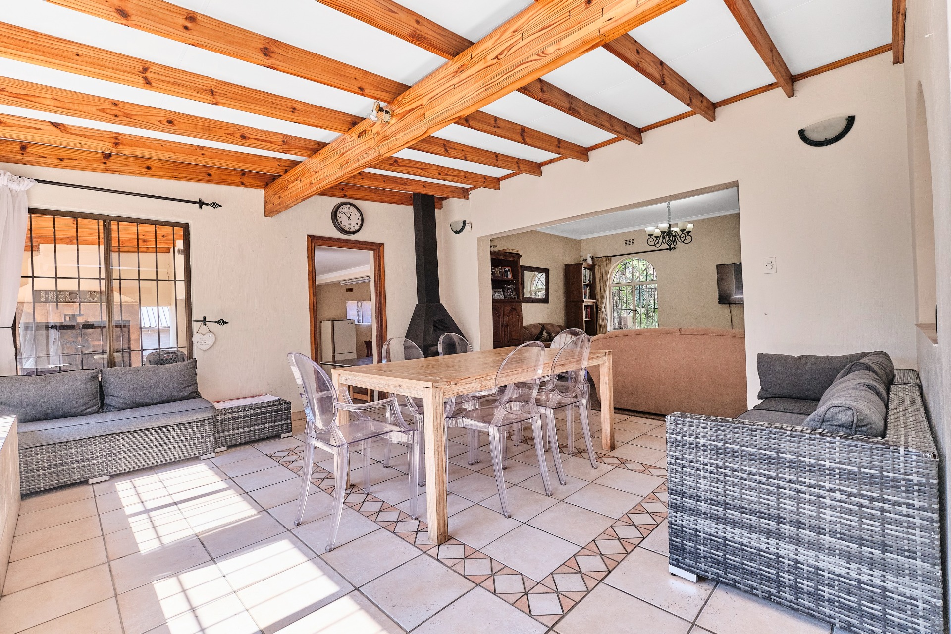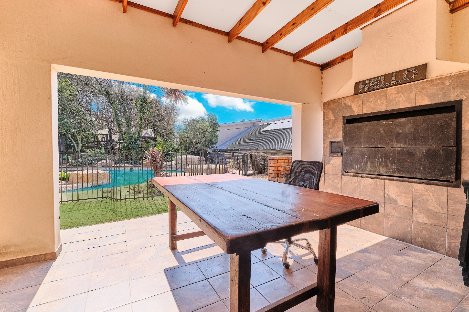 The entertainment room leads out to a covered patio, complete with a built-in braai, making it the perfect spot for hosting gatherings and enjoying the outdoors.