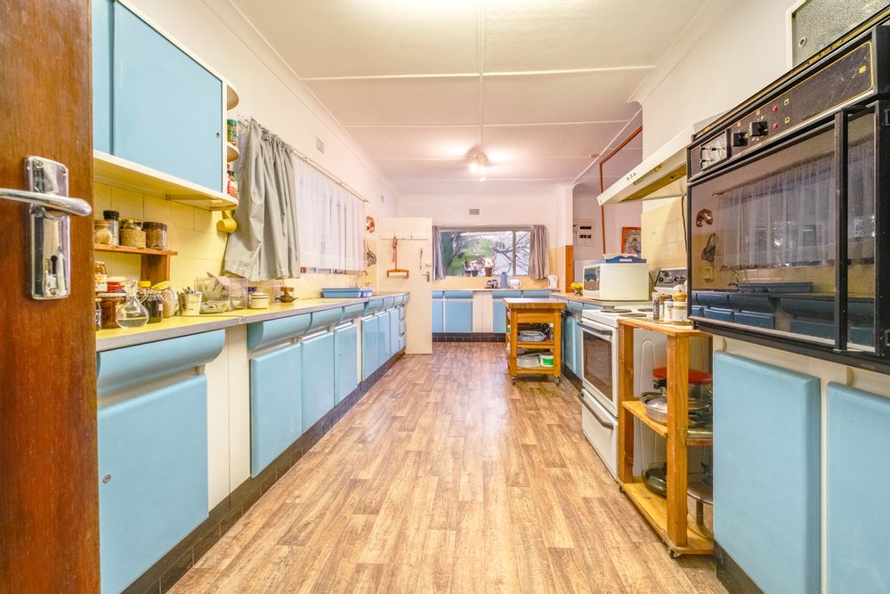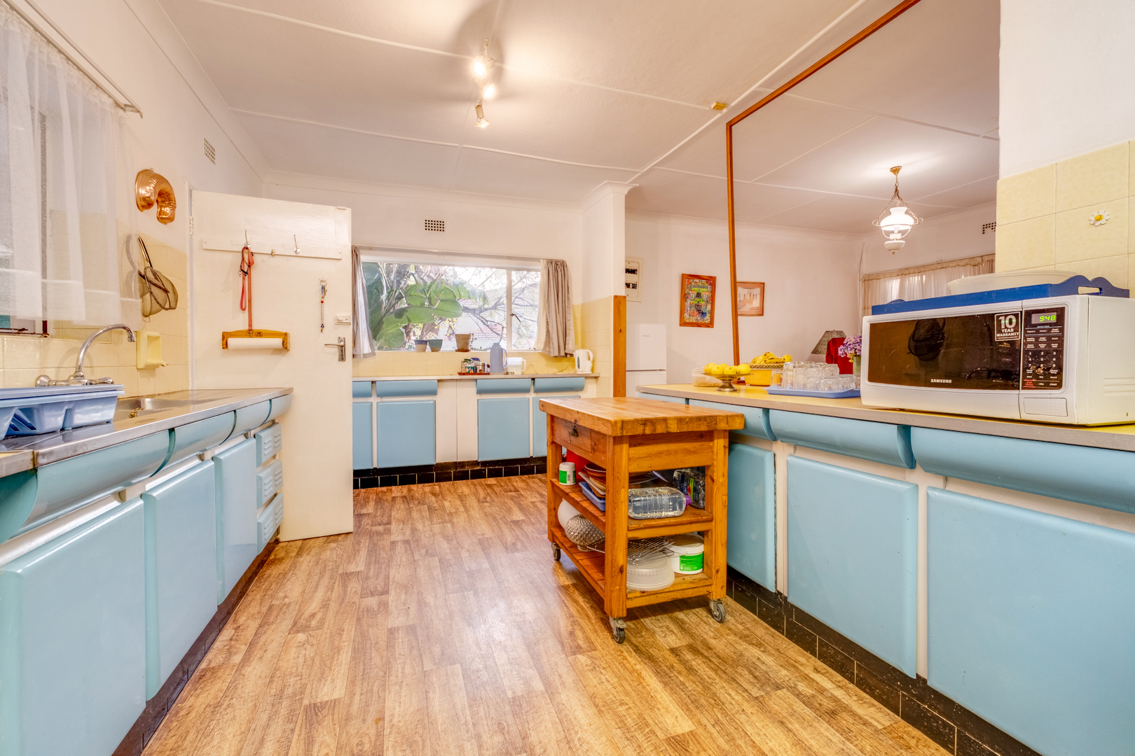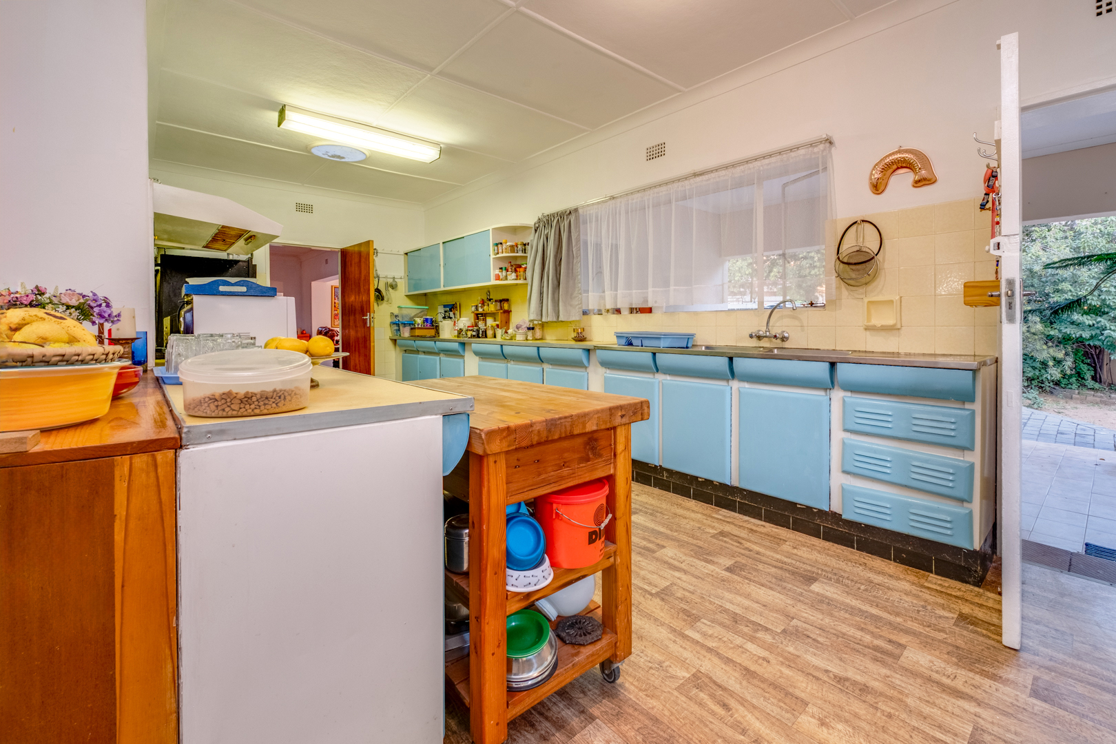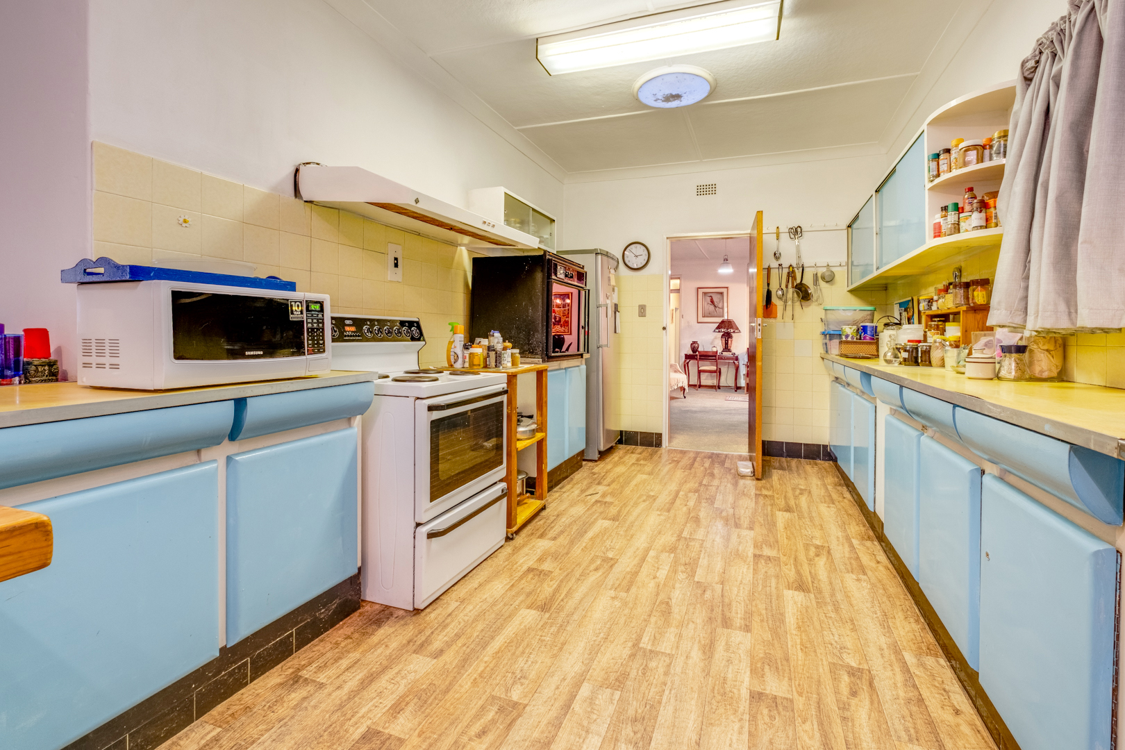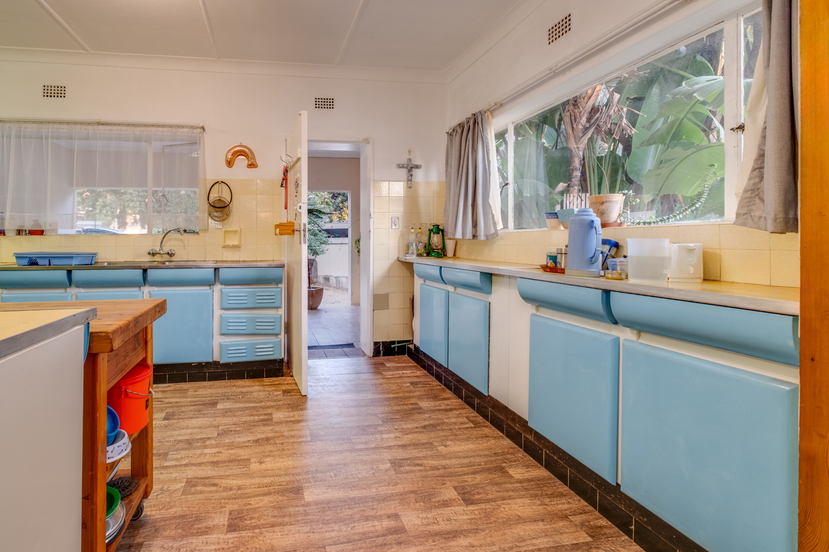 The farm style kitchen includes laminated flooring, space for a single fridge, an electric stove and oven with extractor fan, ample cupboard space, a skylight and double sink