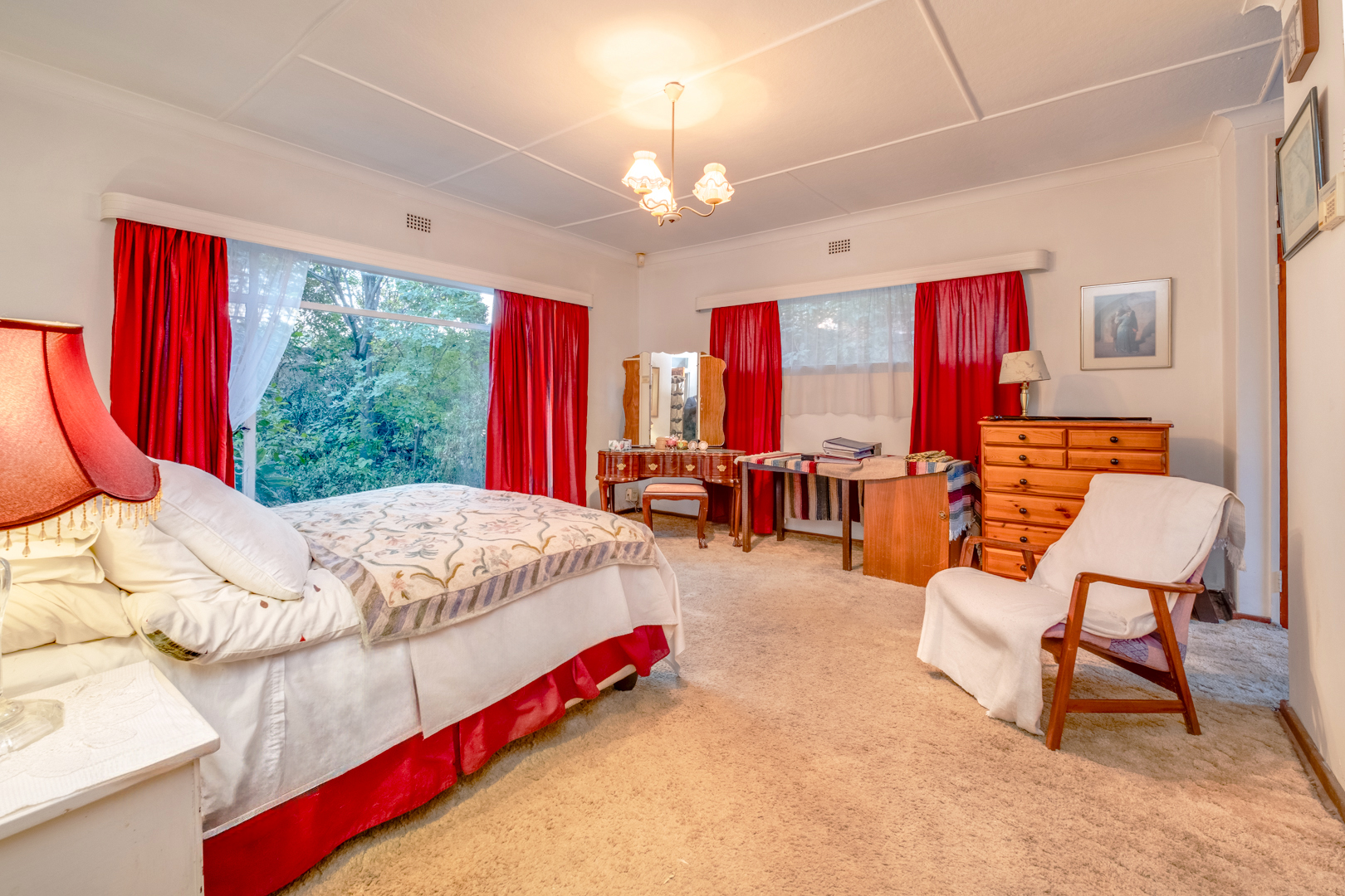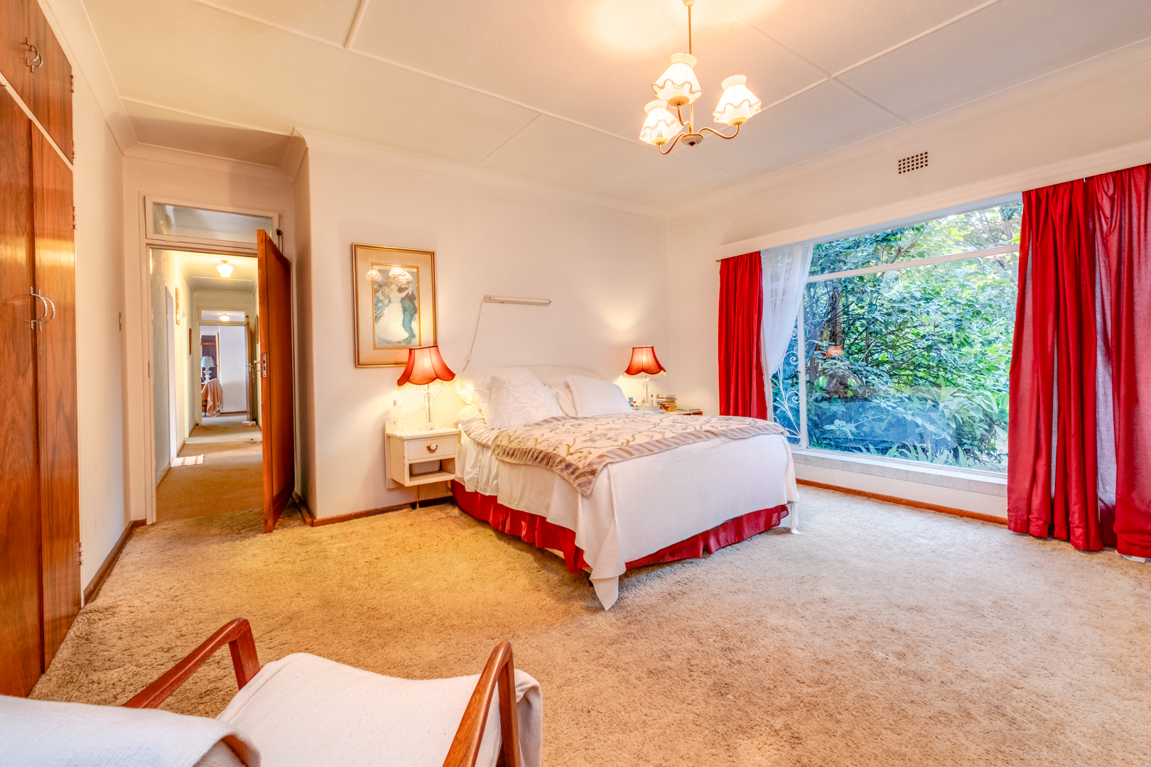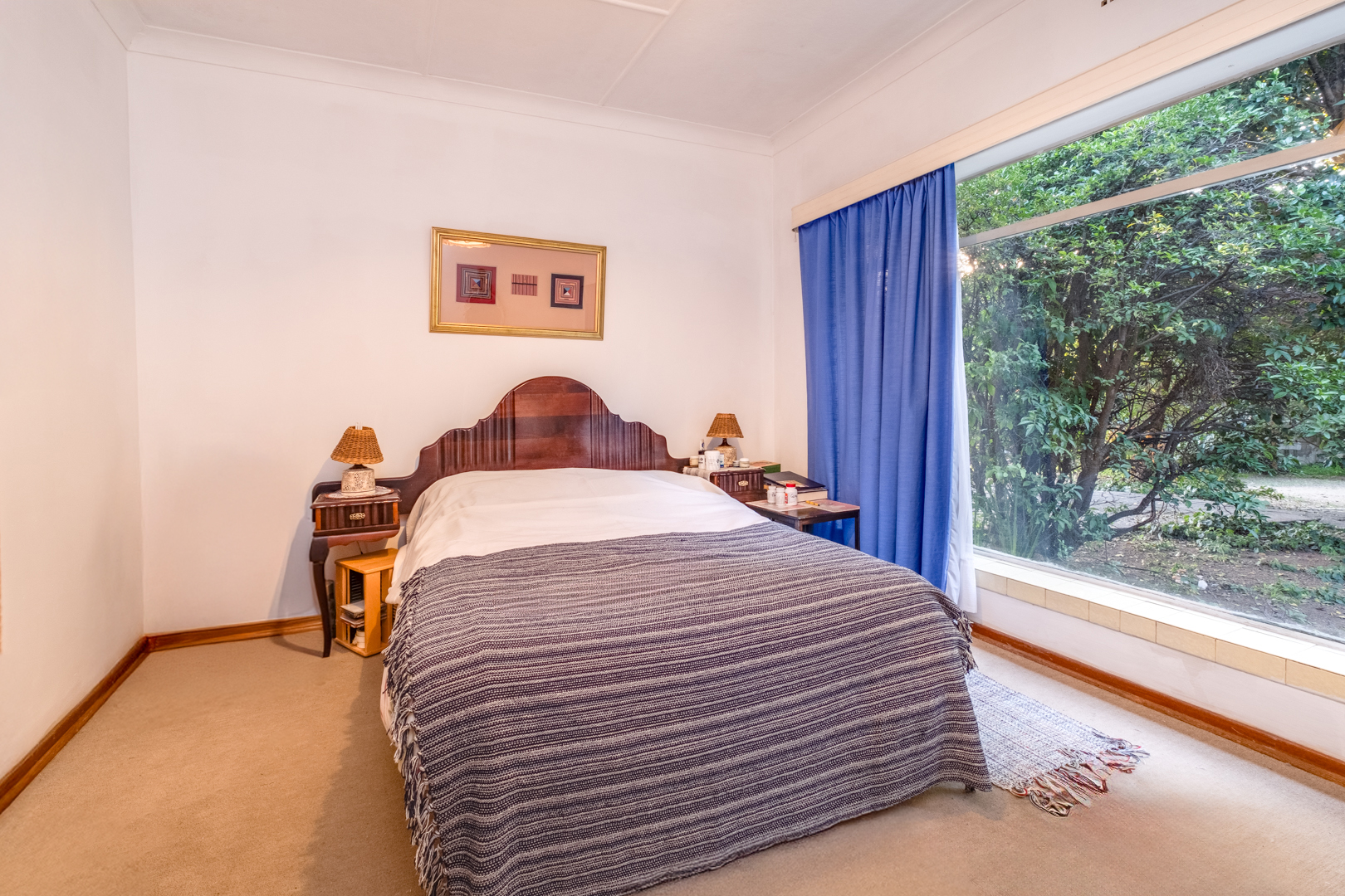 The first bedroom has built-in cupboards, carpet flooring with teak beneath, and a large North-facing window.
