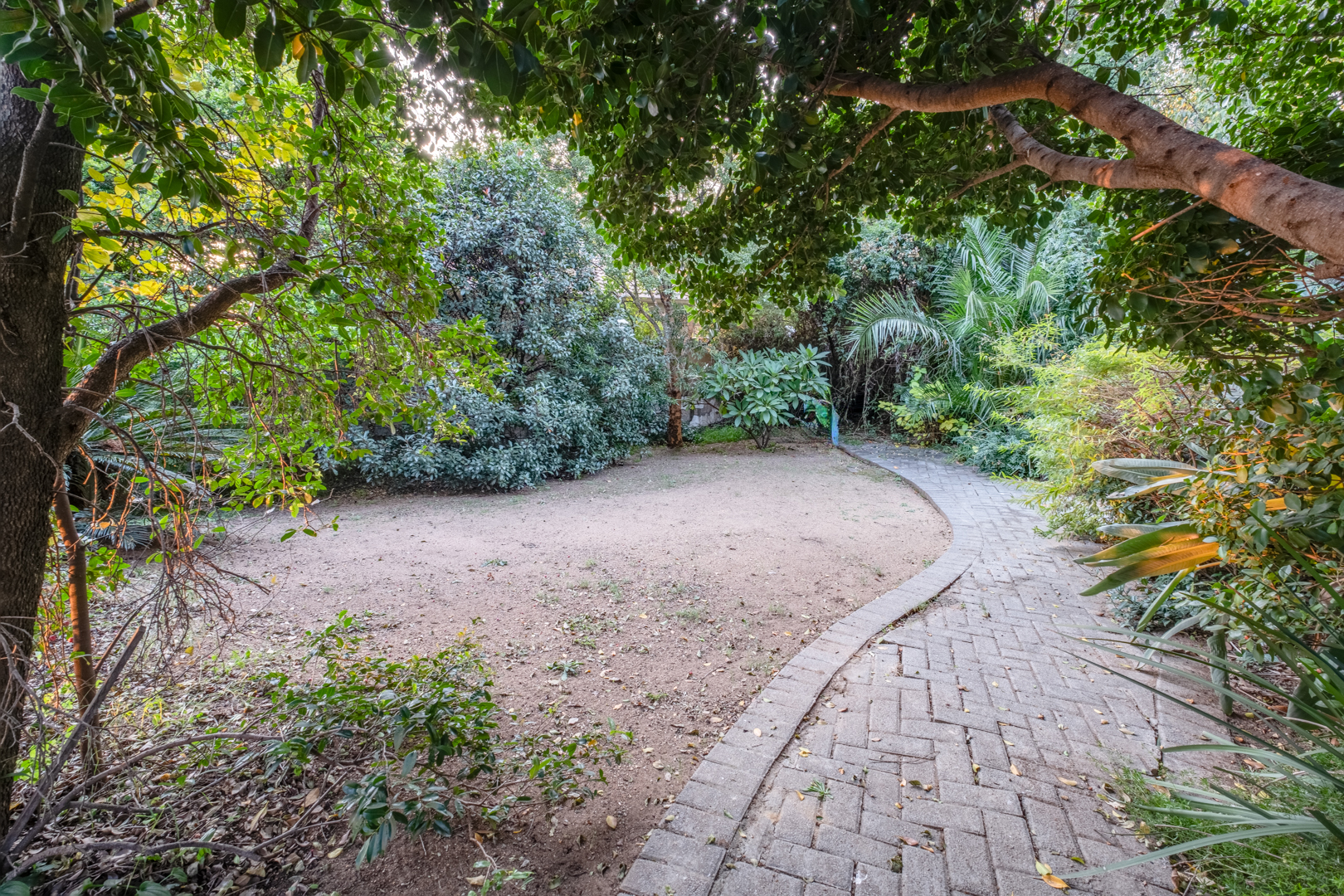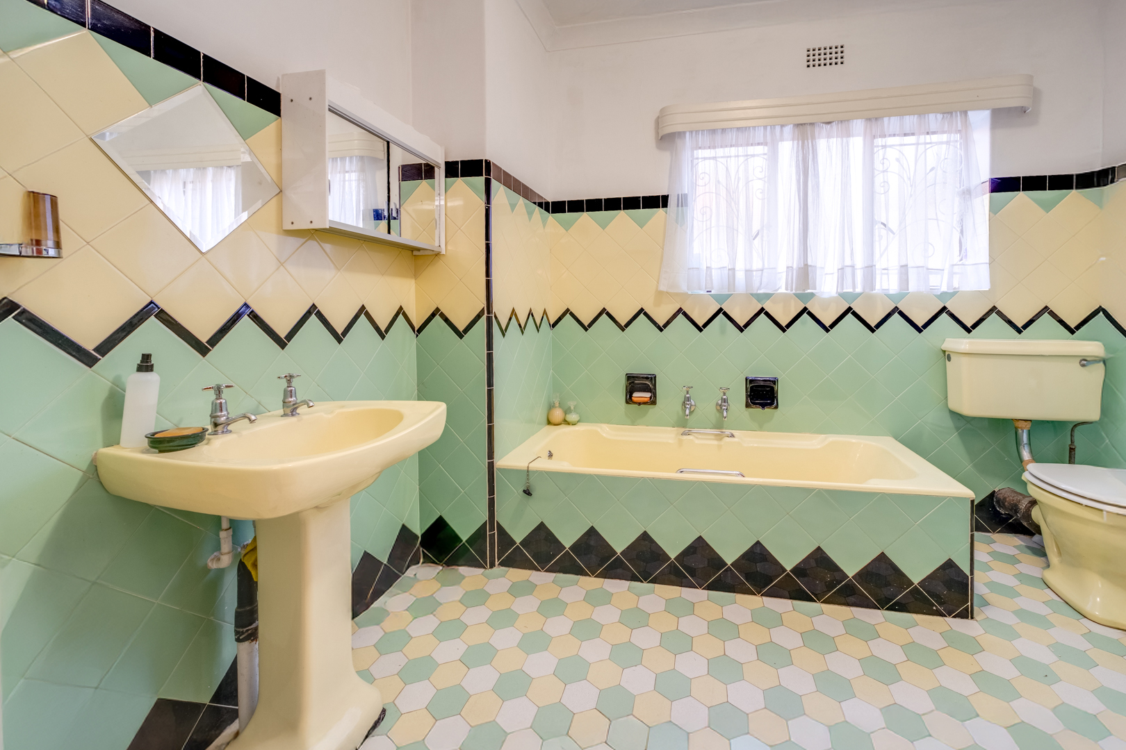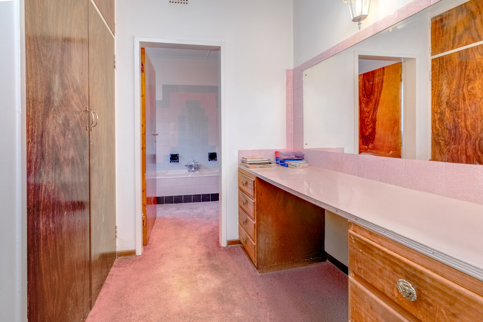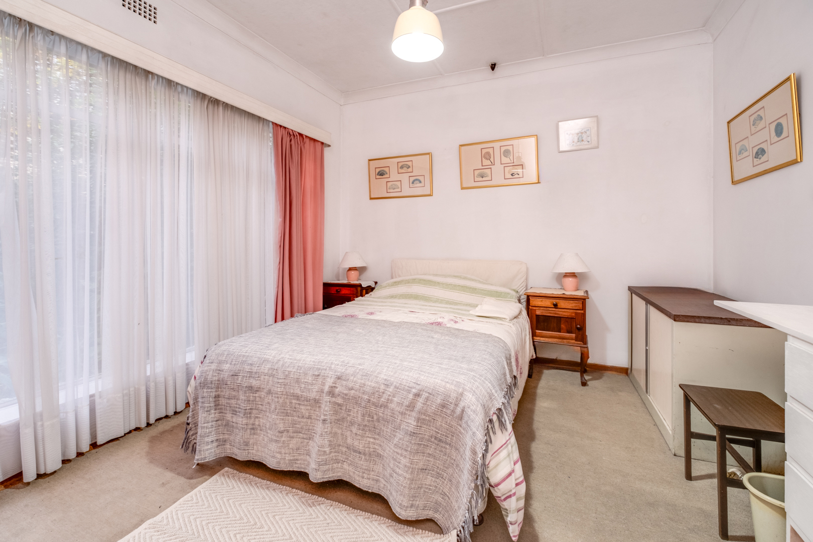 The first bedroom has built-in cupboards, carpet flooring with teak beneath, and a large North-facing window.