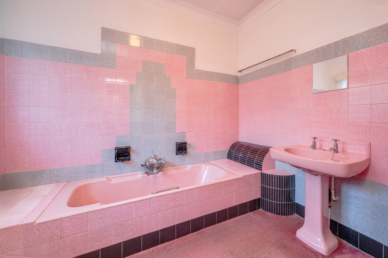 The main en-suite comprises carpet flooring, tiled walls, a basin, WC, and a bath.