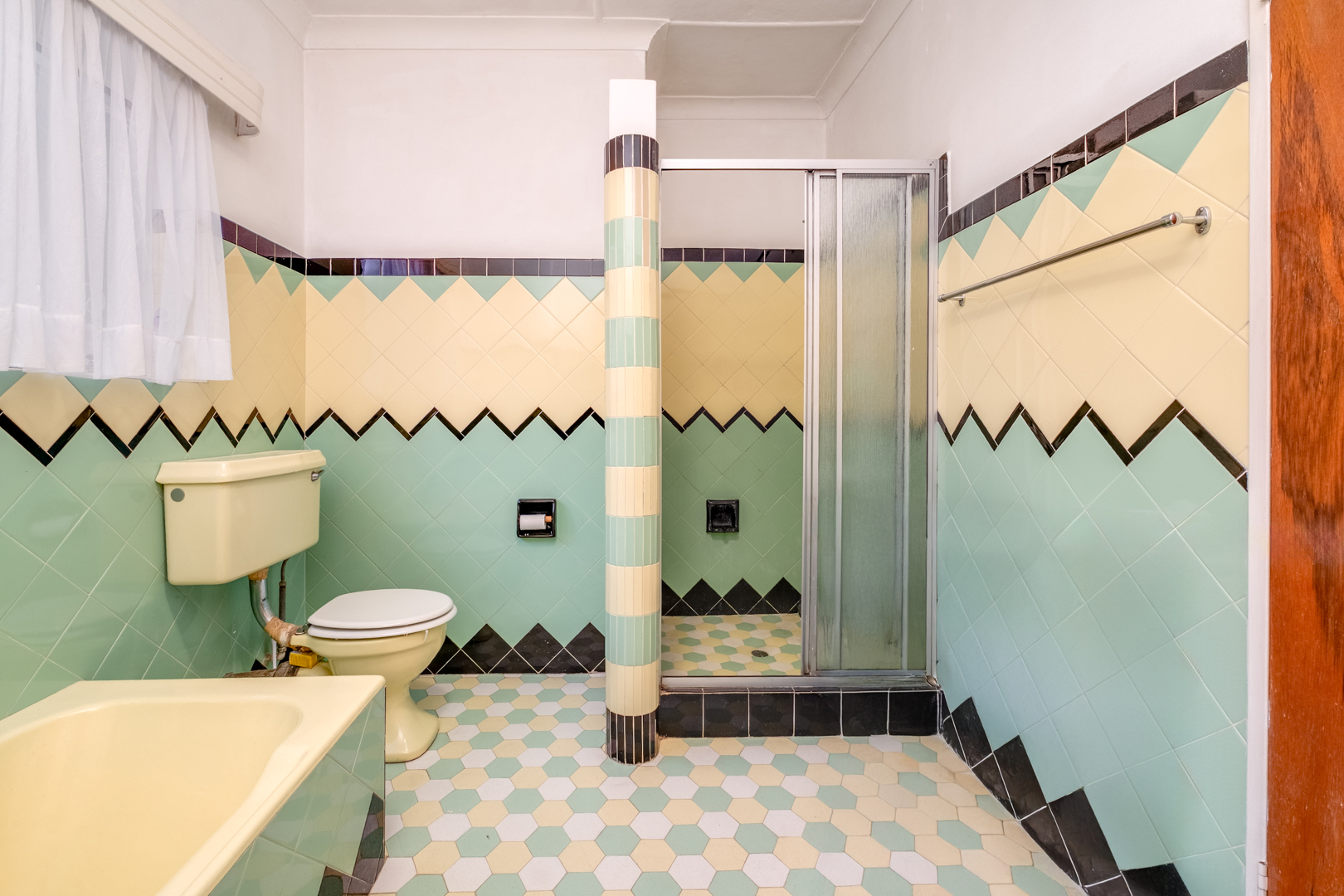 The family bathroom includes floor-to-ceiling tiles, a basin, bath, WC, and a spacious shower.