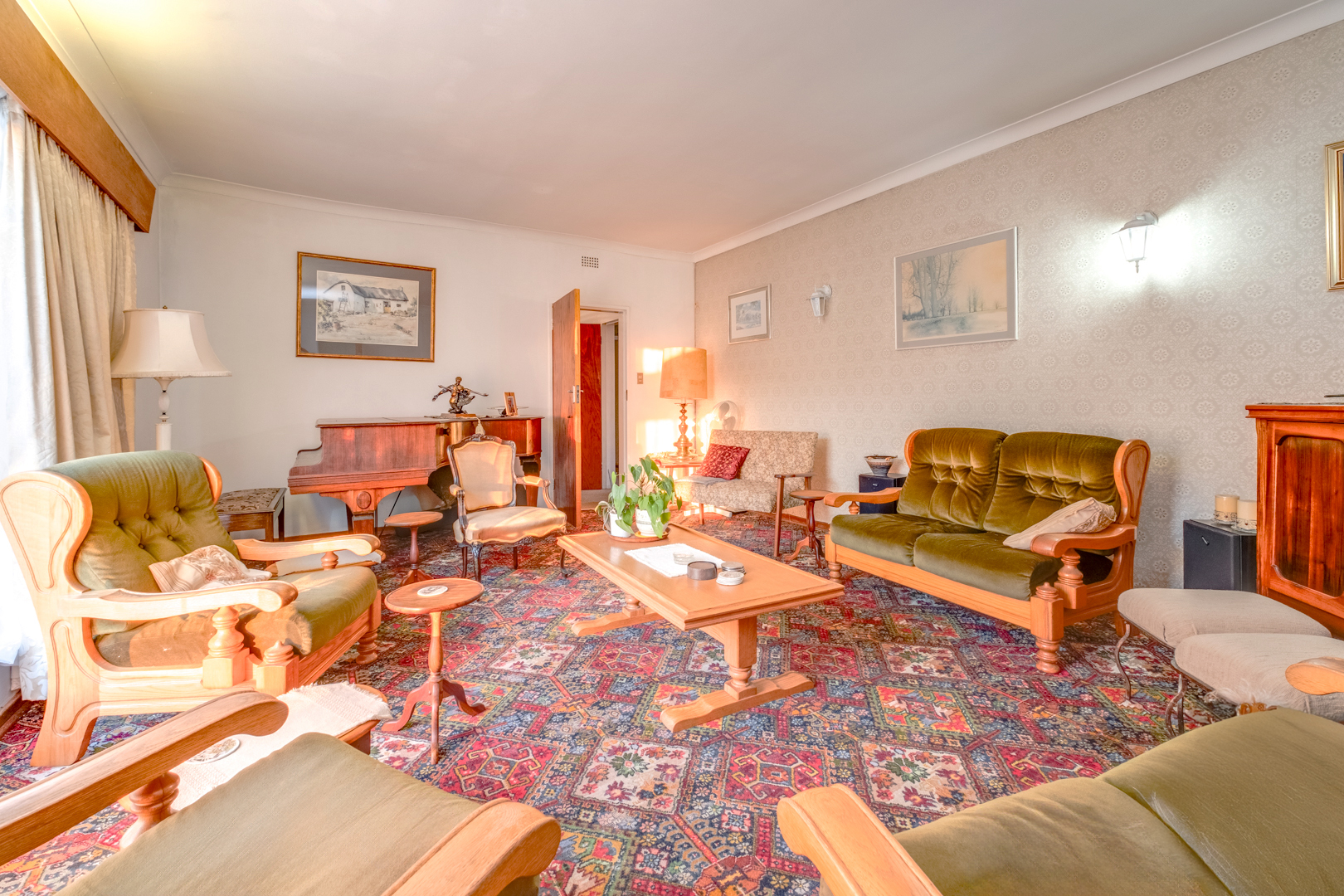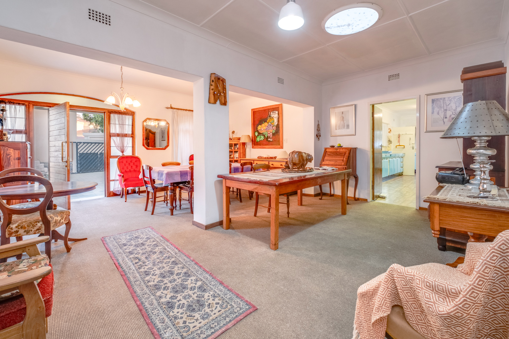 The entrance hall features carpet flooring with teak beneath, opening into a double living and dining area with a skylight.