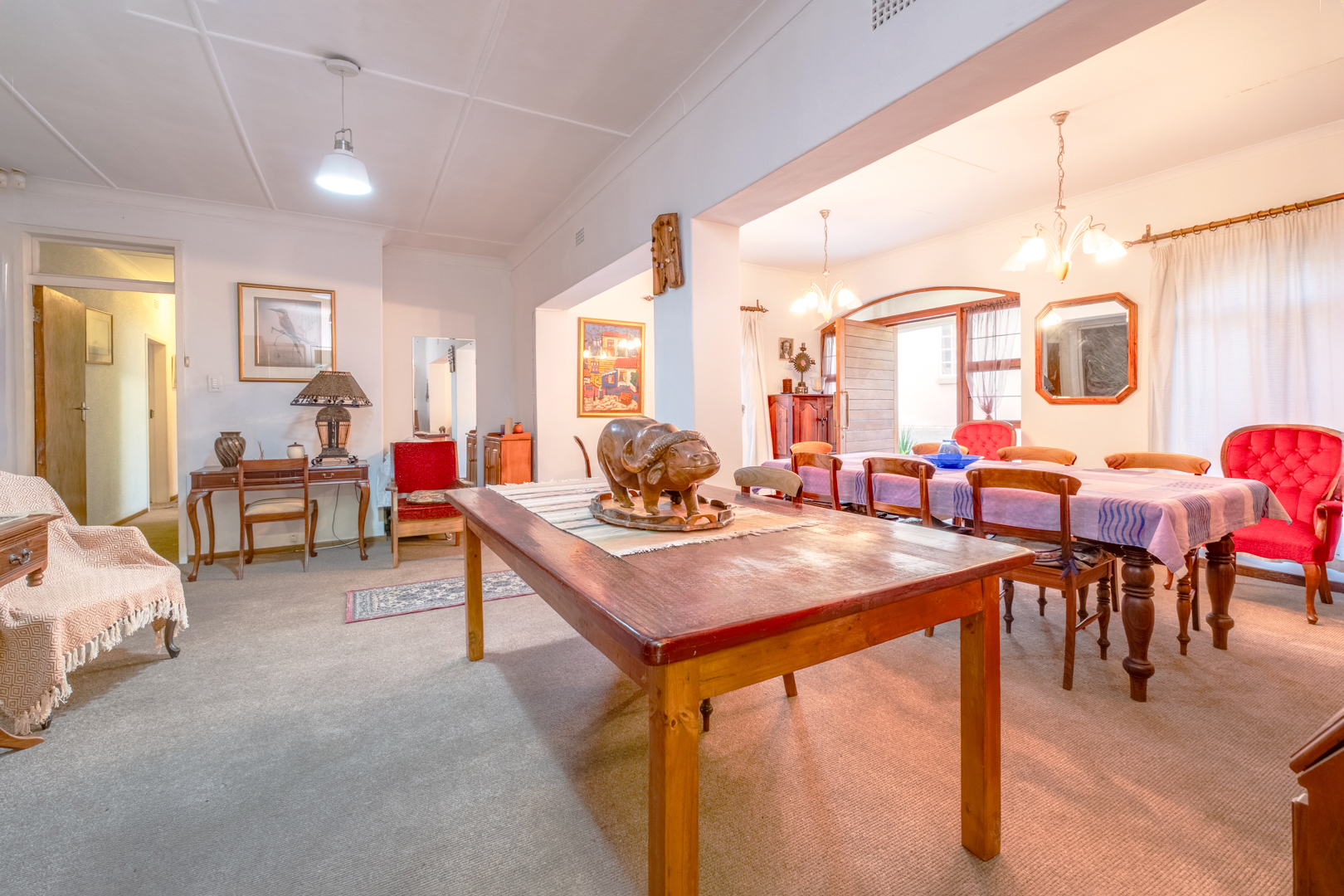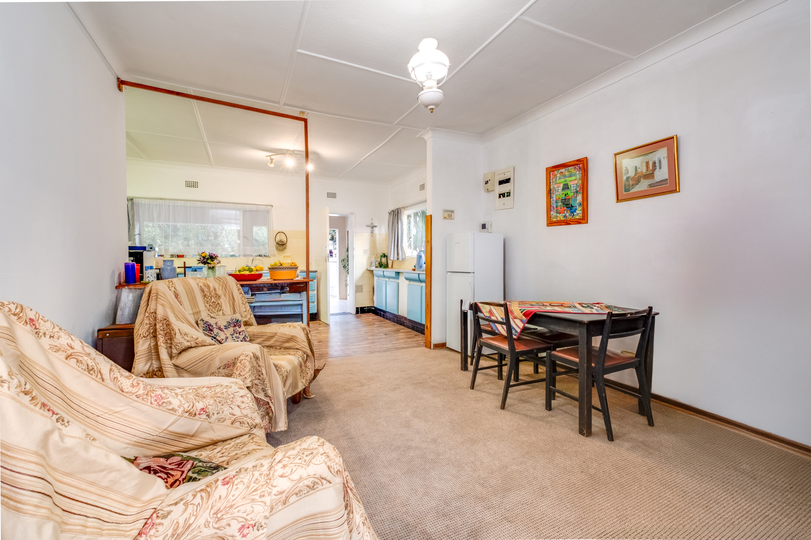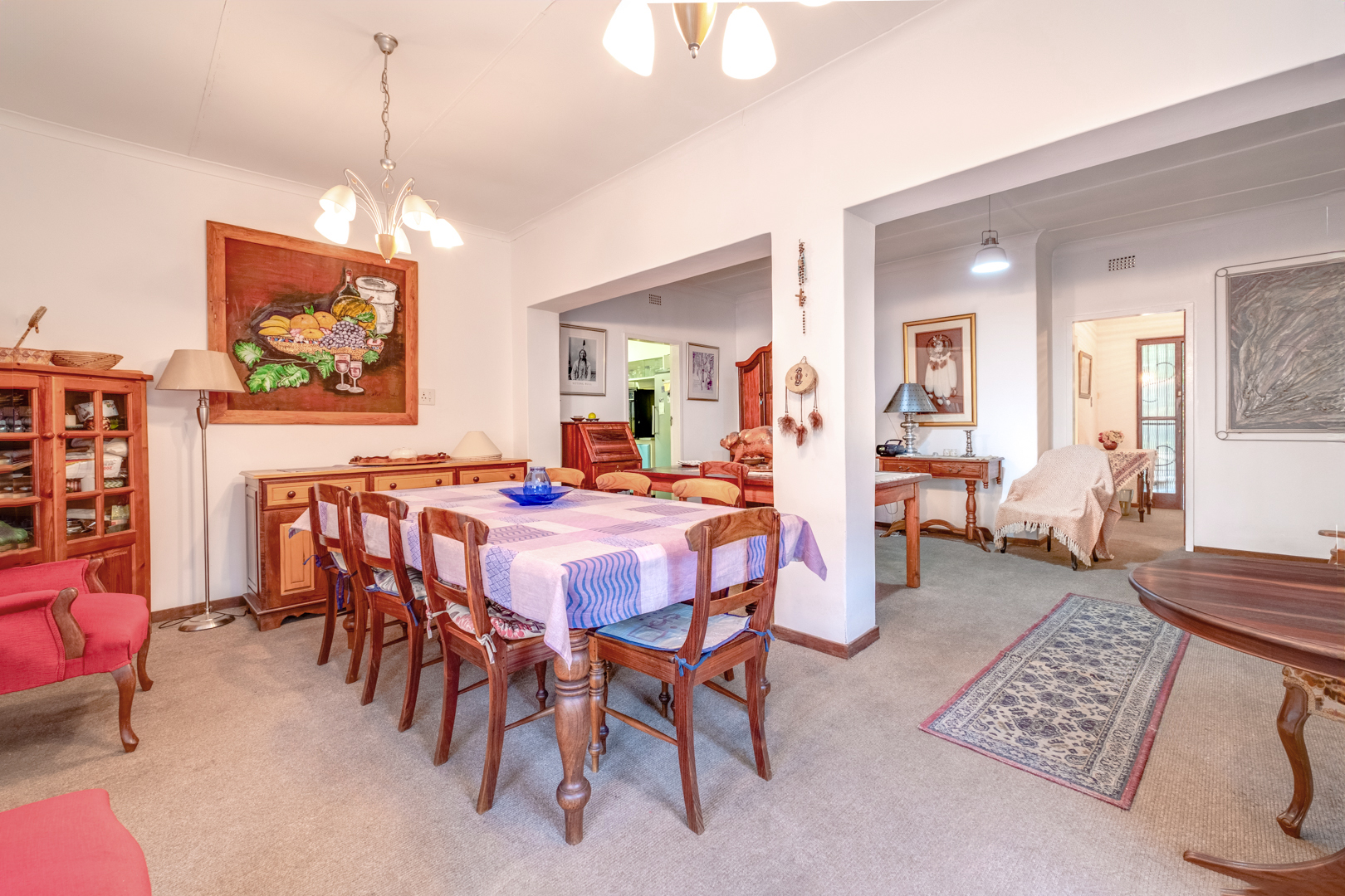The dining room is open plan to the kitchen and features a North-facing door and window.