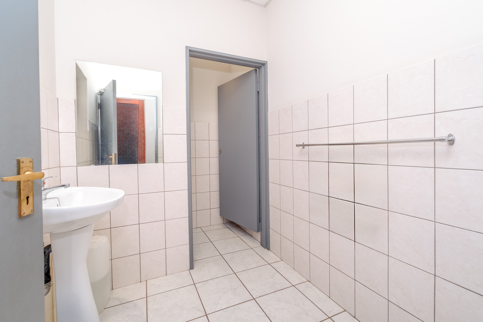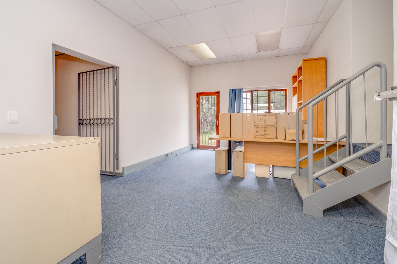 Office 1: Bright south-facing window with tiled flooring; includes access to stairs leading down to a private toilet and basin for added convenience .