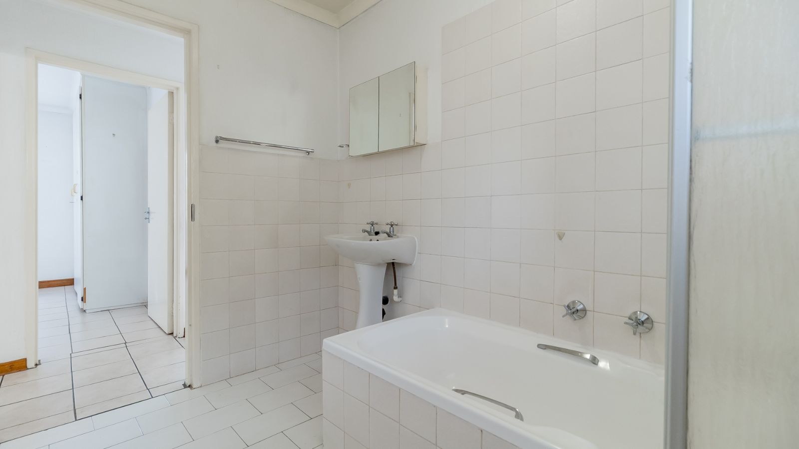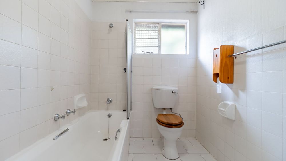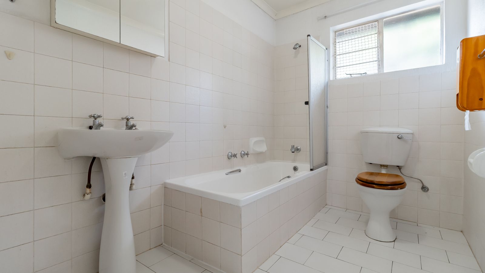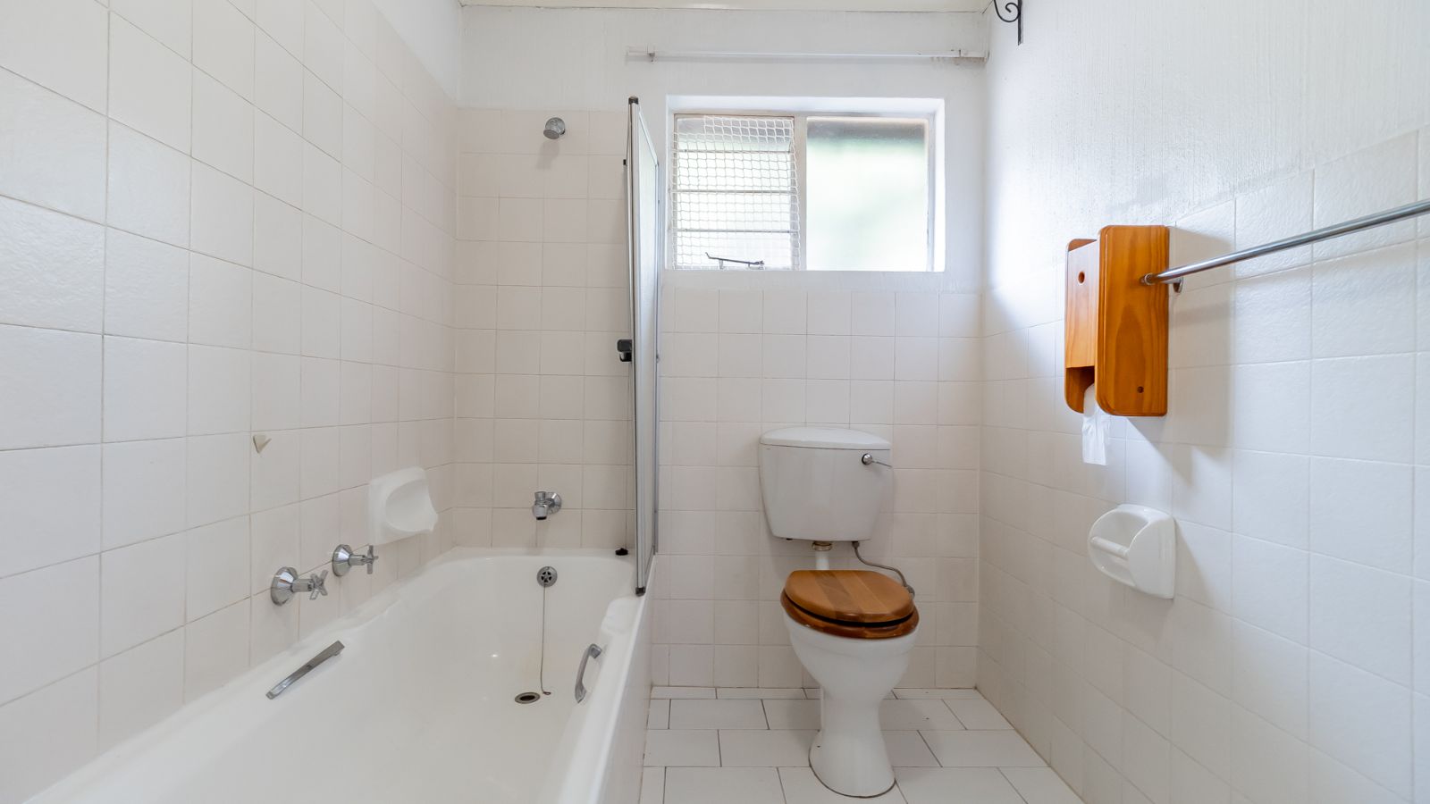 Both bedrooms are well-sized and serviced by a full bathroom fitted with a toilet, basin, bath, and over-bath shower.