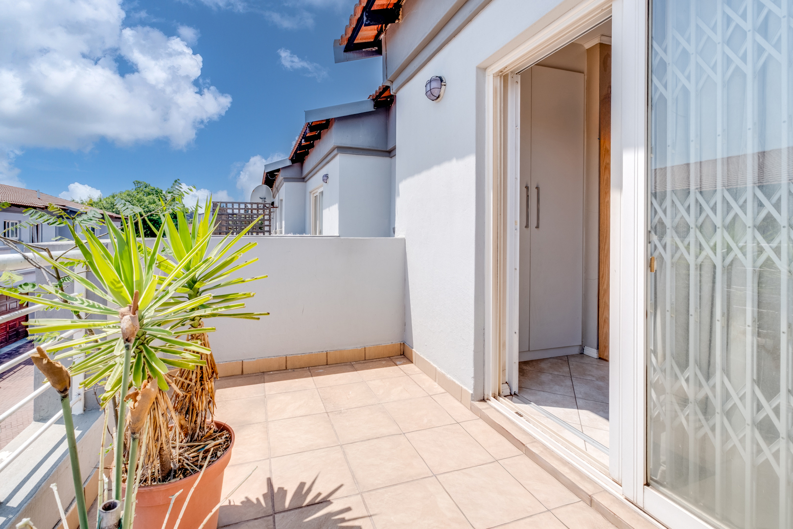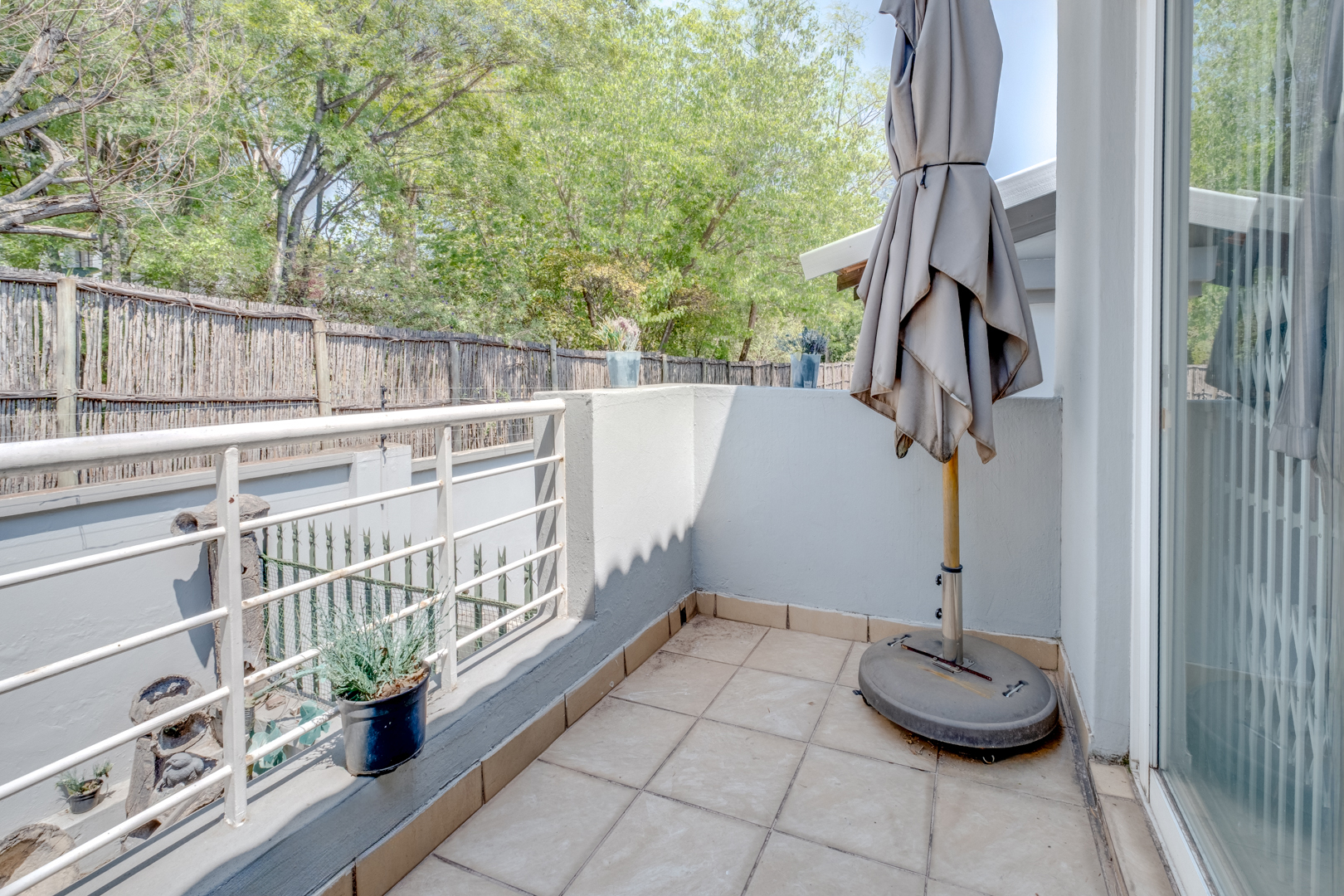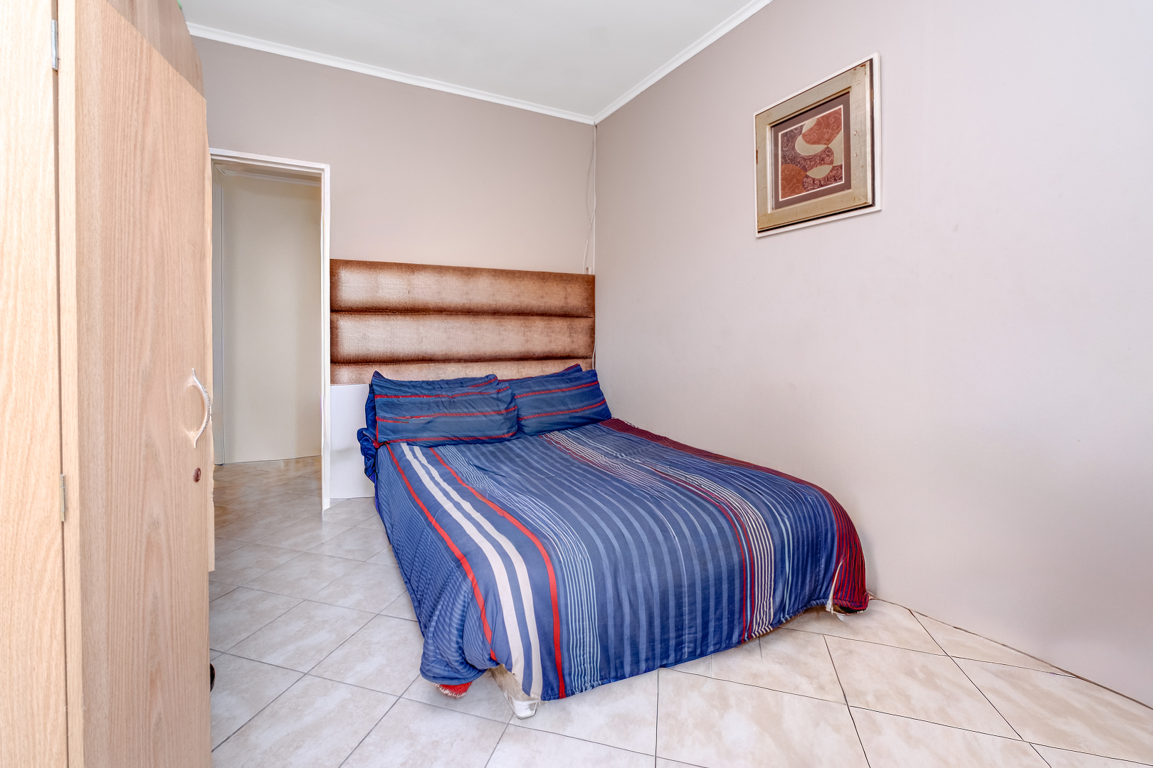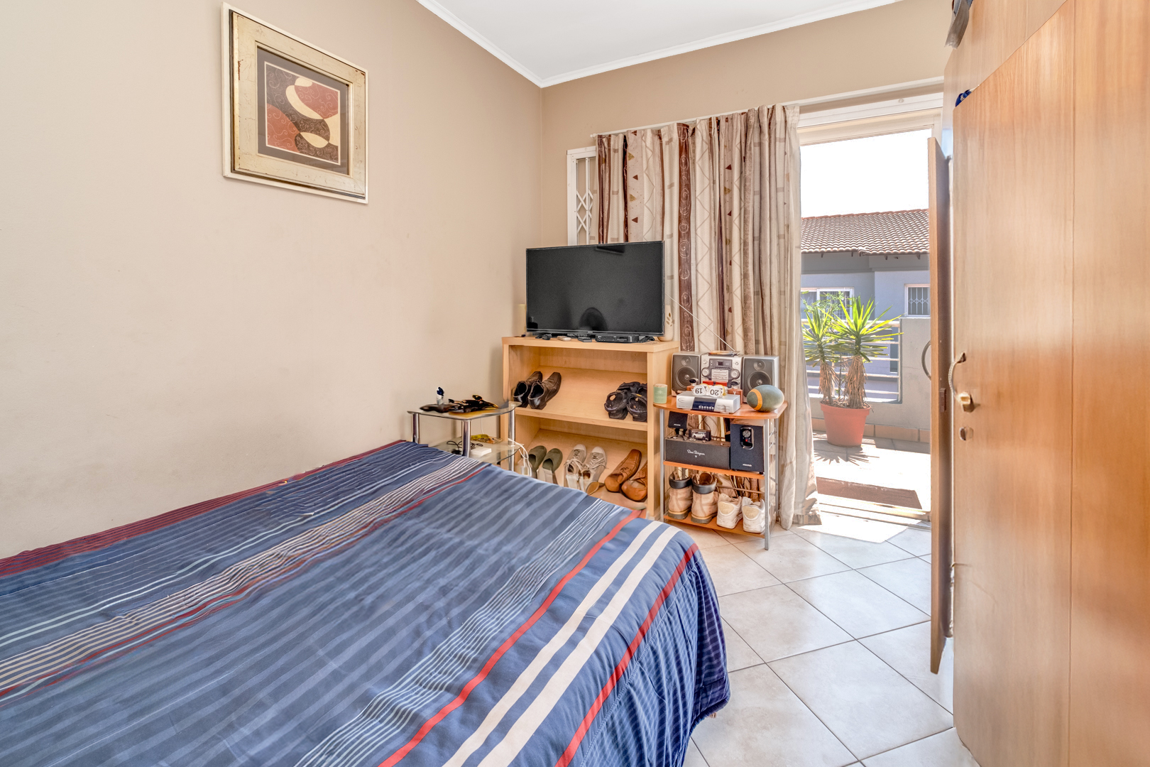 Second bedroom with tiled floors, built-in cupboards, and north-facing sliding door opening to a spacious balcony