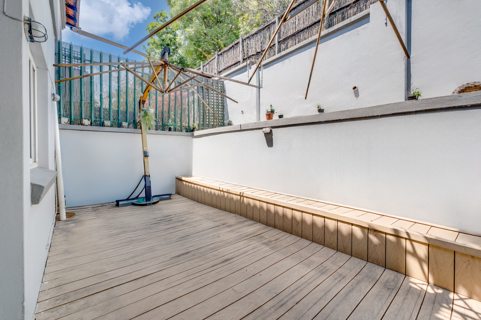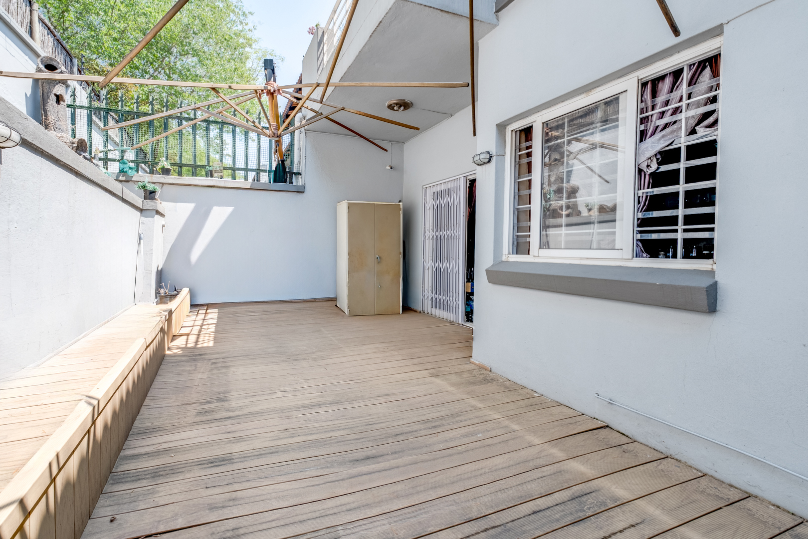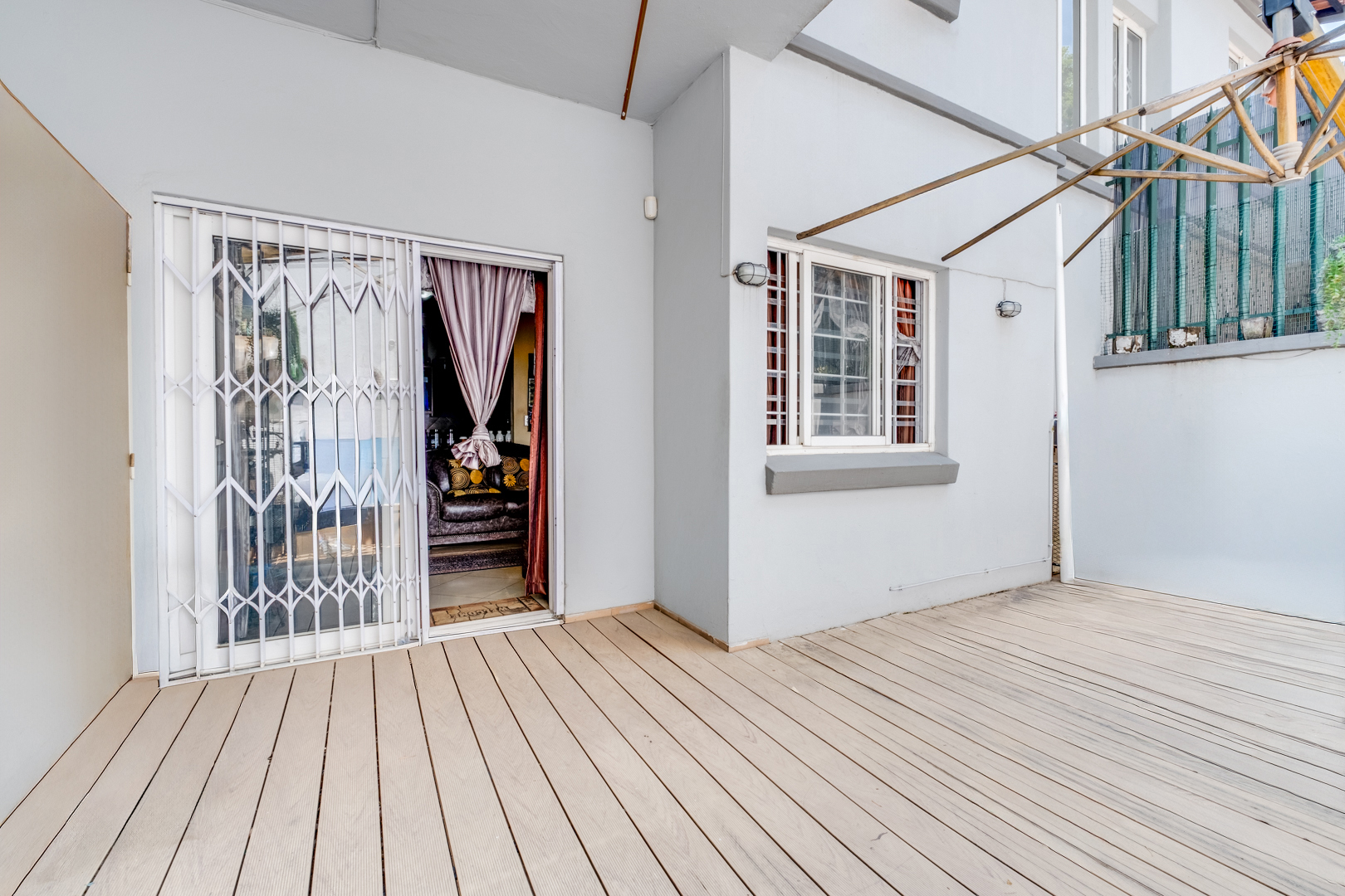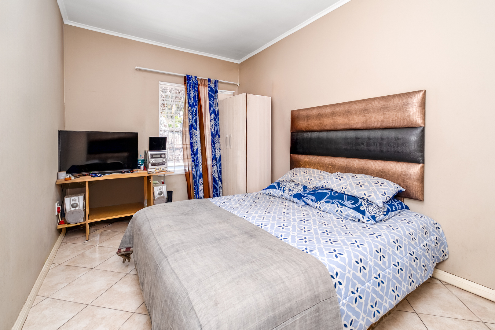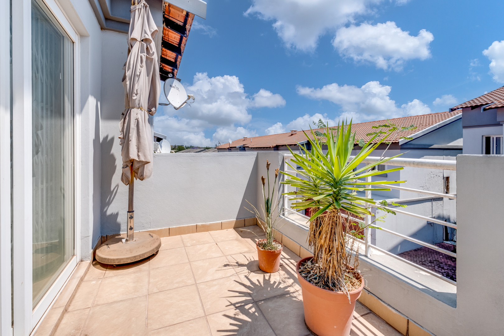 Second bedroom with tiled floors, built-in cupboards, and north-facing sliding door opening to a spacious balcony
