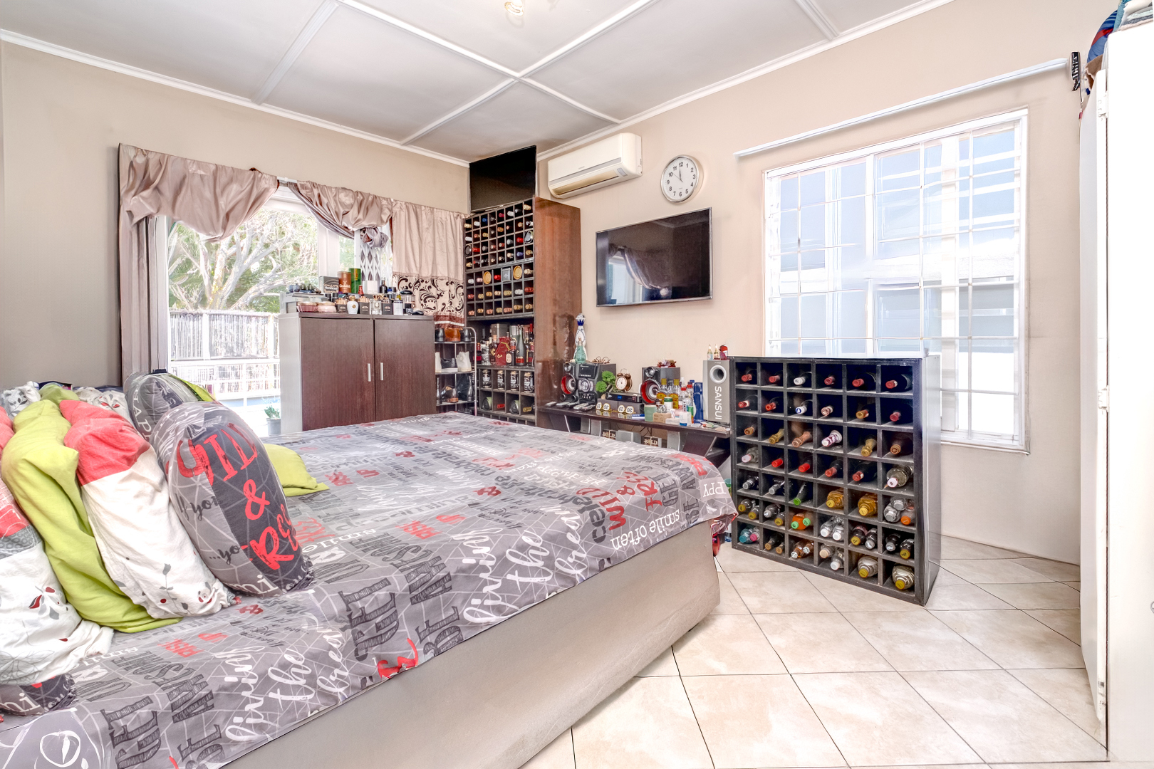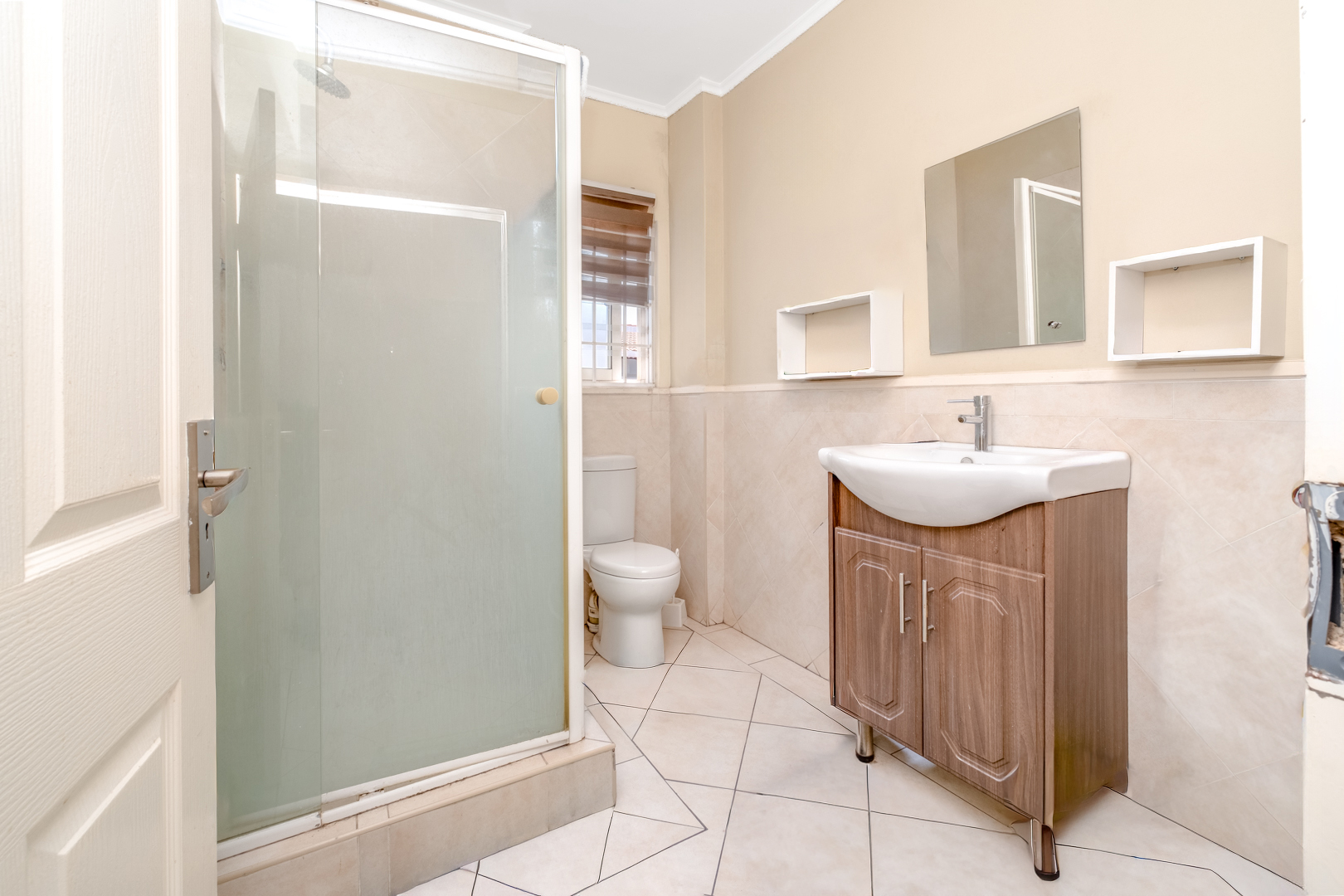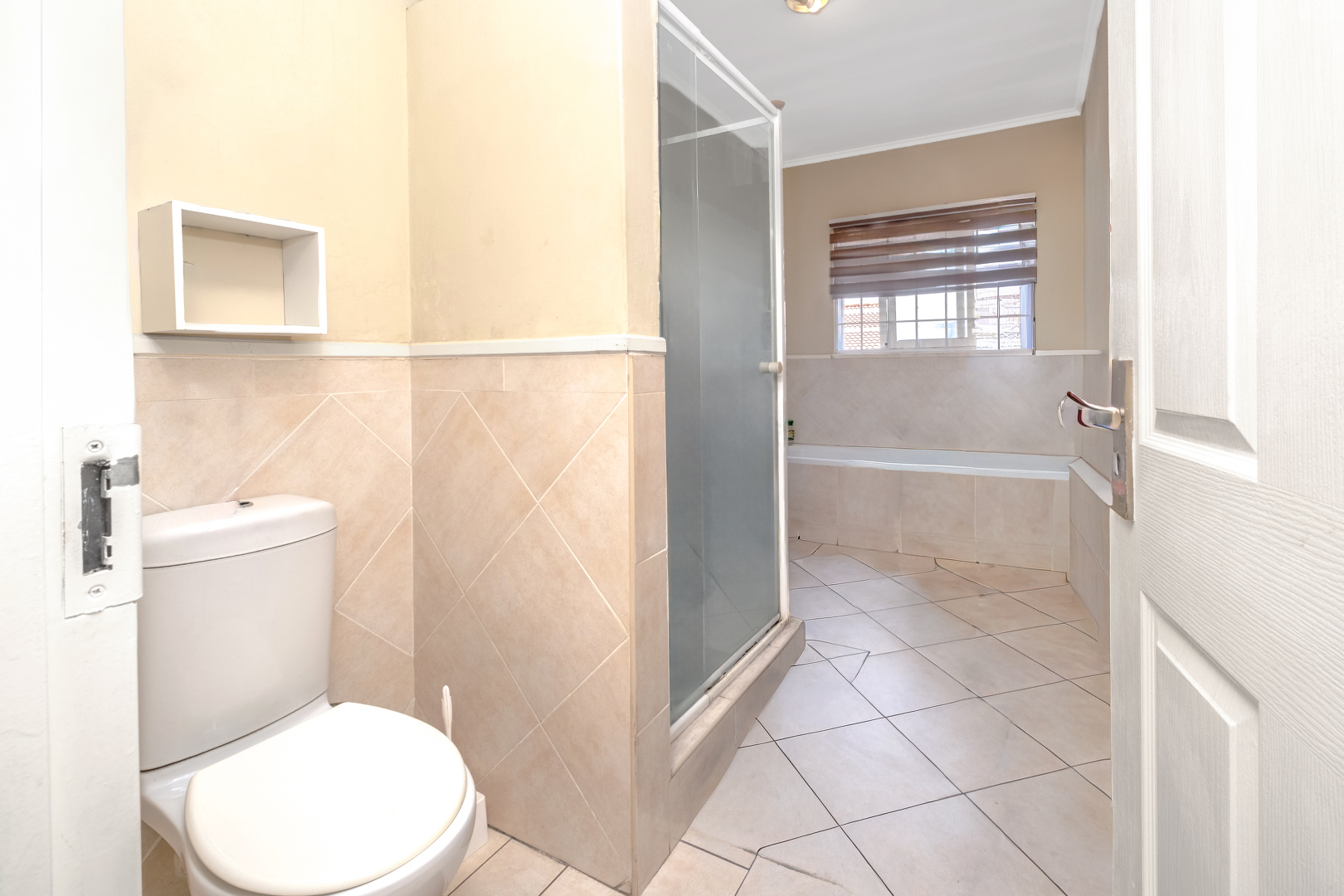 Third bedroom with tiled floors, air-conditioner, access to the balcony, built-in cupboards, and an en-suite featuring tiled floors, WC, bath, basin, and shower