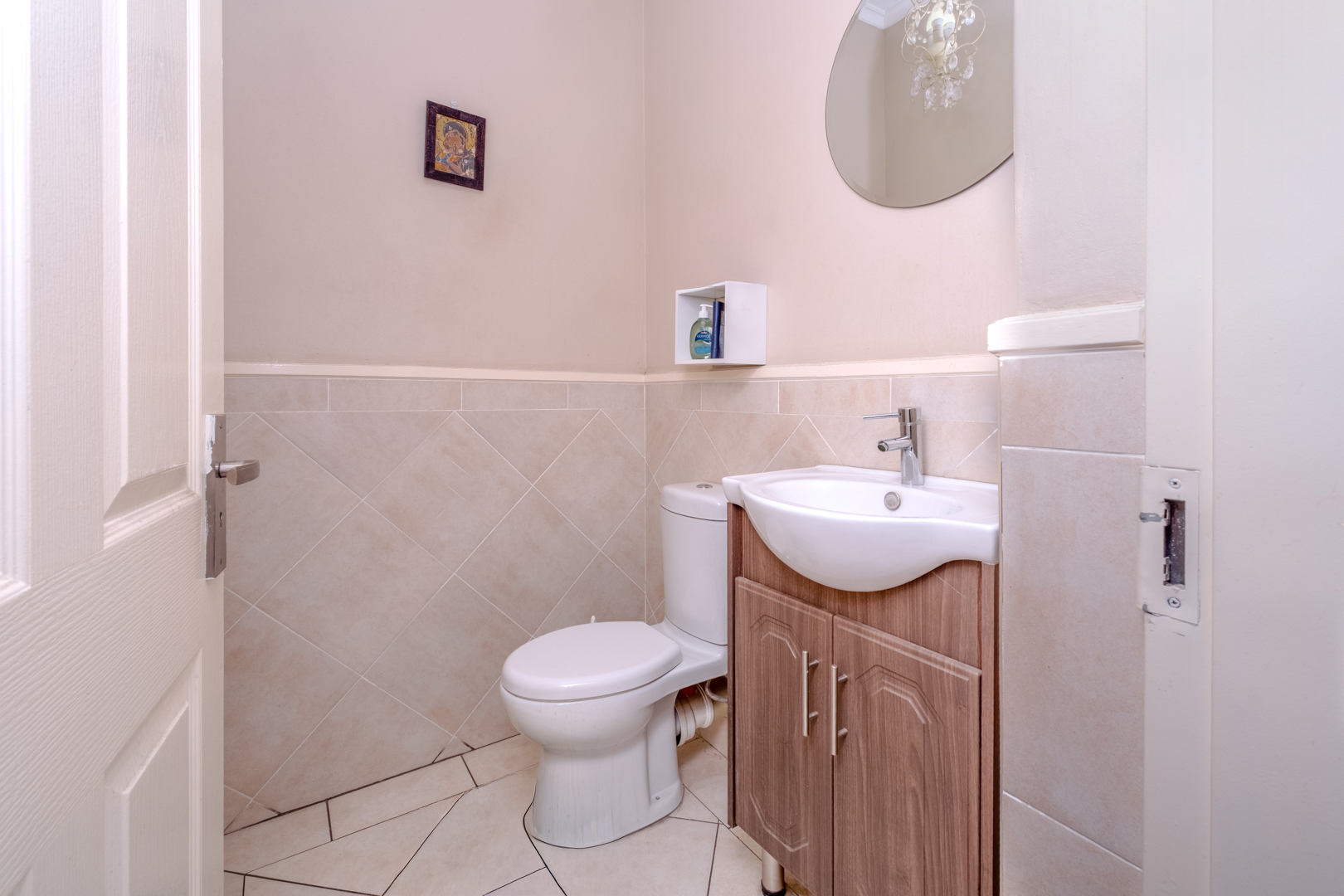 Guest bathroom with floor-to-ceiling tiles, basin, and WC