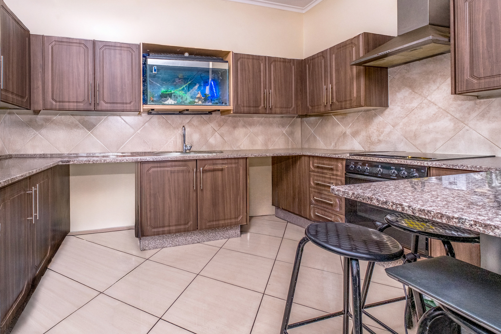 Kitchen featuring tiled floors, double fridge space, ample built-in cupboards, space for a dishwasher and washing machine, double basin, electric stove, and extractor fan