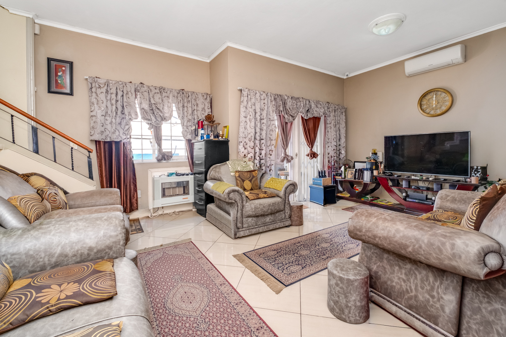 Family room with large modern tiles, gas heater, wall-mounted air-conditioner, and open-plan layout to the kitchen