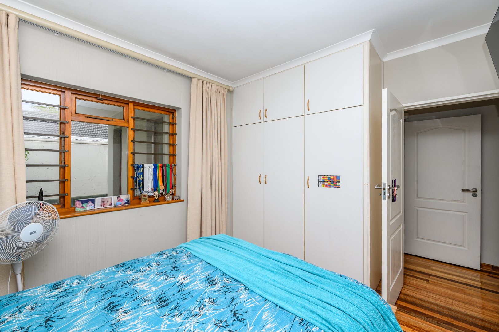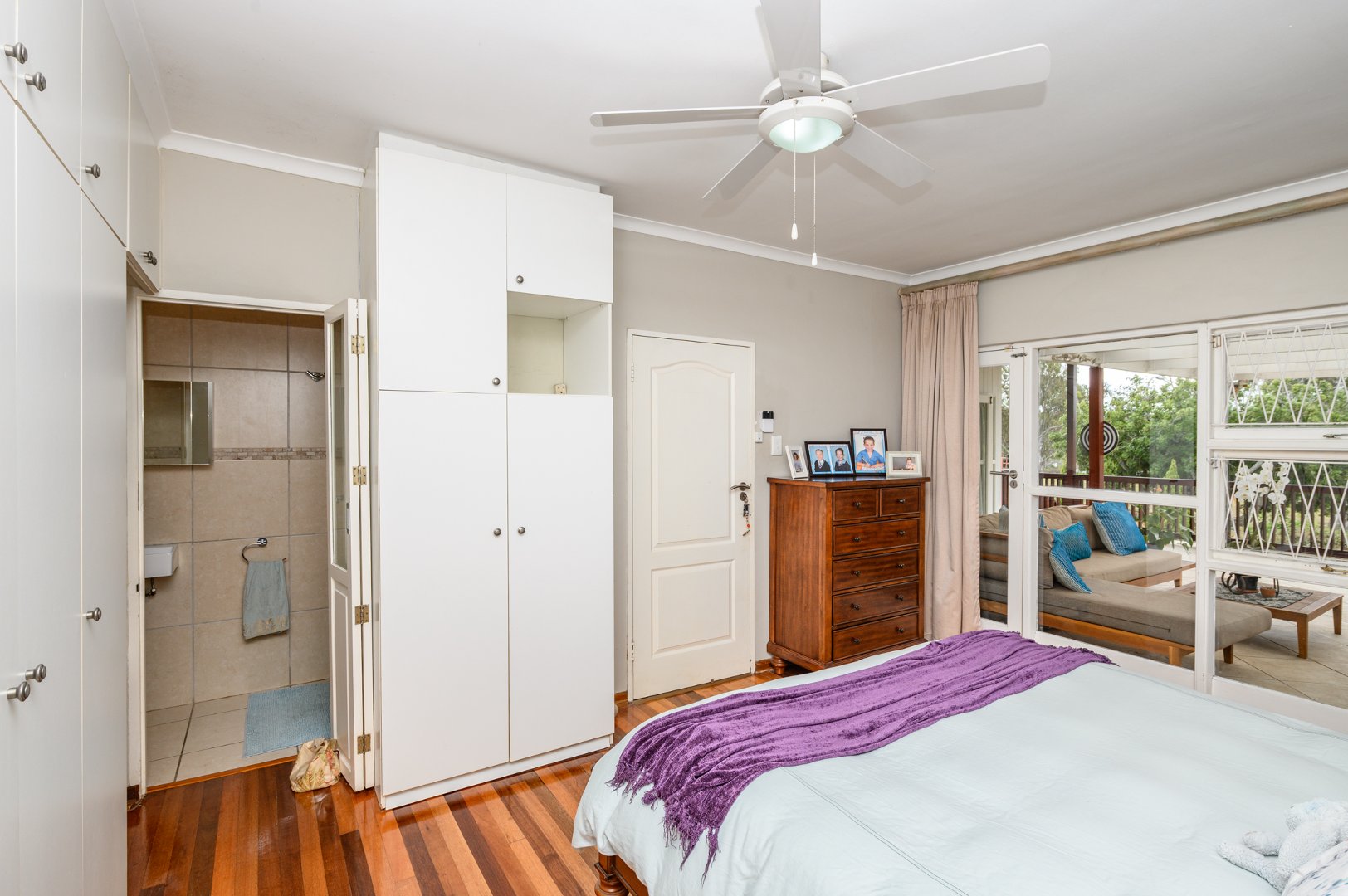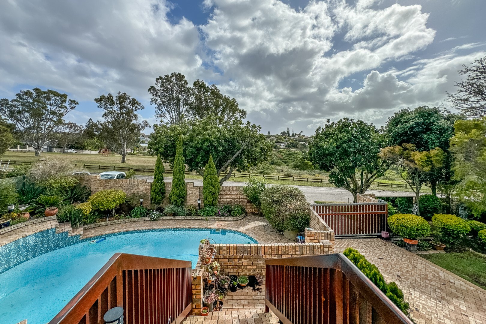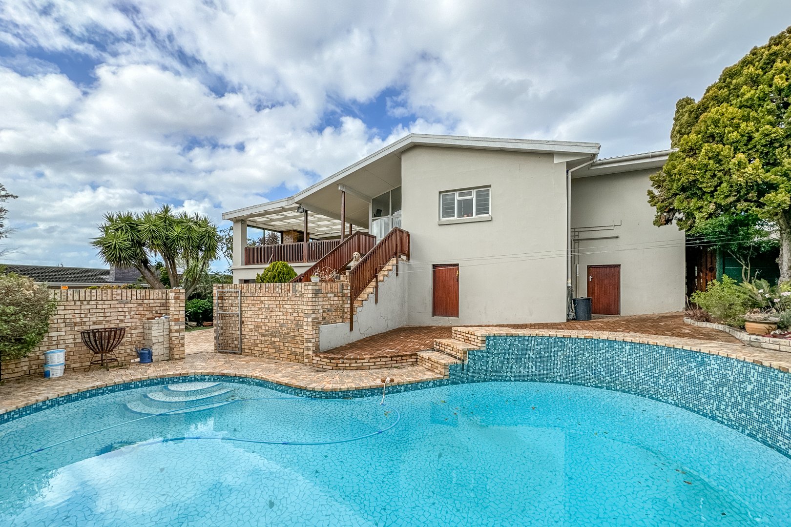 Upstairs features three bedrooms with wooden floors and built-in cupboards, two bathrooms, and a bright open-plan lounge and dining area flowing into the kitchen with separate scullery. A standout feature is the spacious covered braai area, ideal for year-round entertaining overlooking the sparkling swimming pool. The main bedroom opens onto this area and includes an en-suite shower.