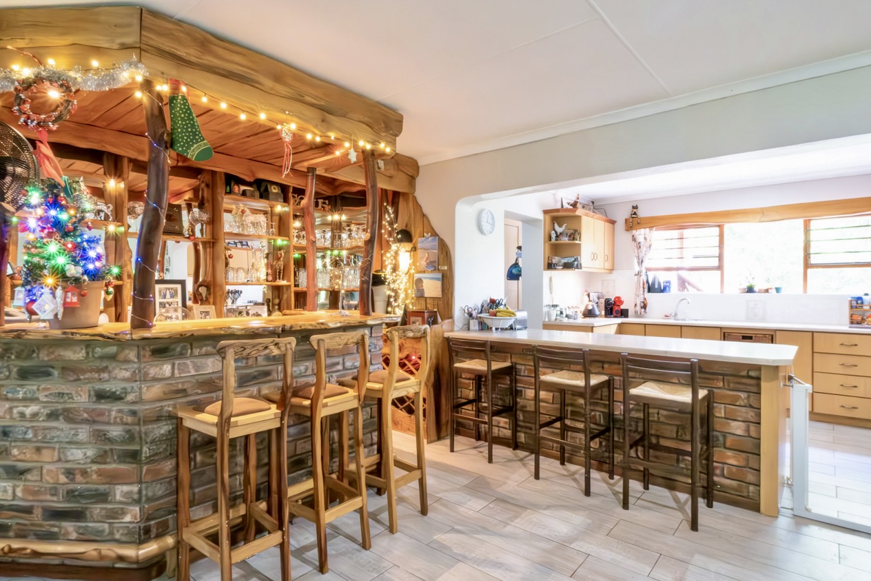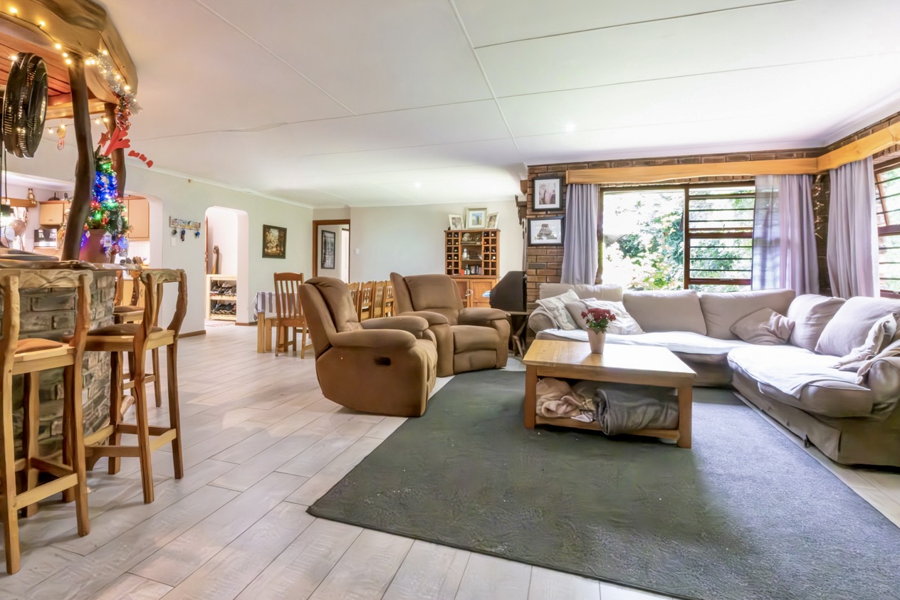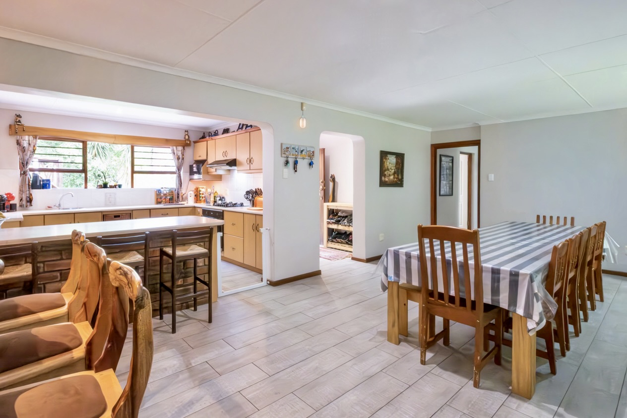 The home offers four comfortable bedrooms and two bathrooms, one of which is a well-appointed main en-suite. The open-plan living area creates an inviting, free-flowing space ideal for everyday living and easy entertaining and leads directly onto a braai room. The well-fitted kitchen is practical and complemented by a separate scullery that keeps the workspace uncluttered.