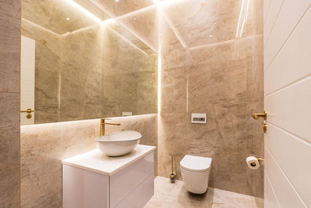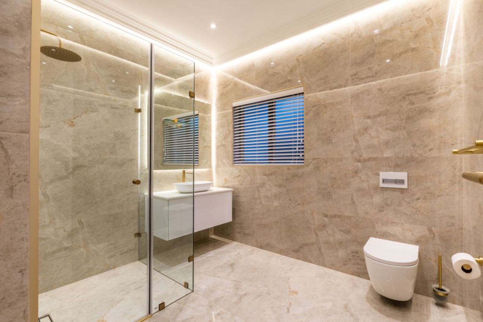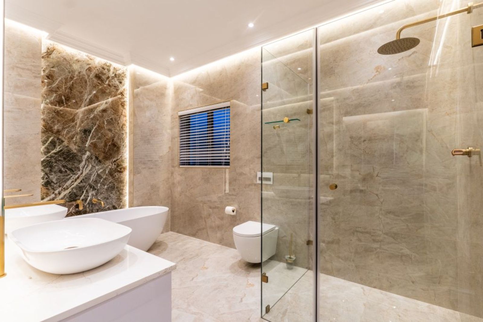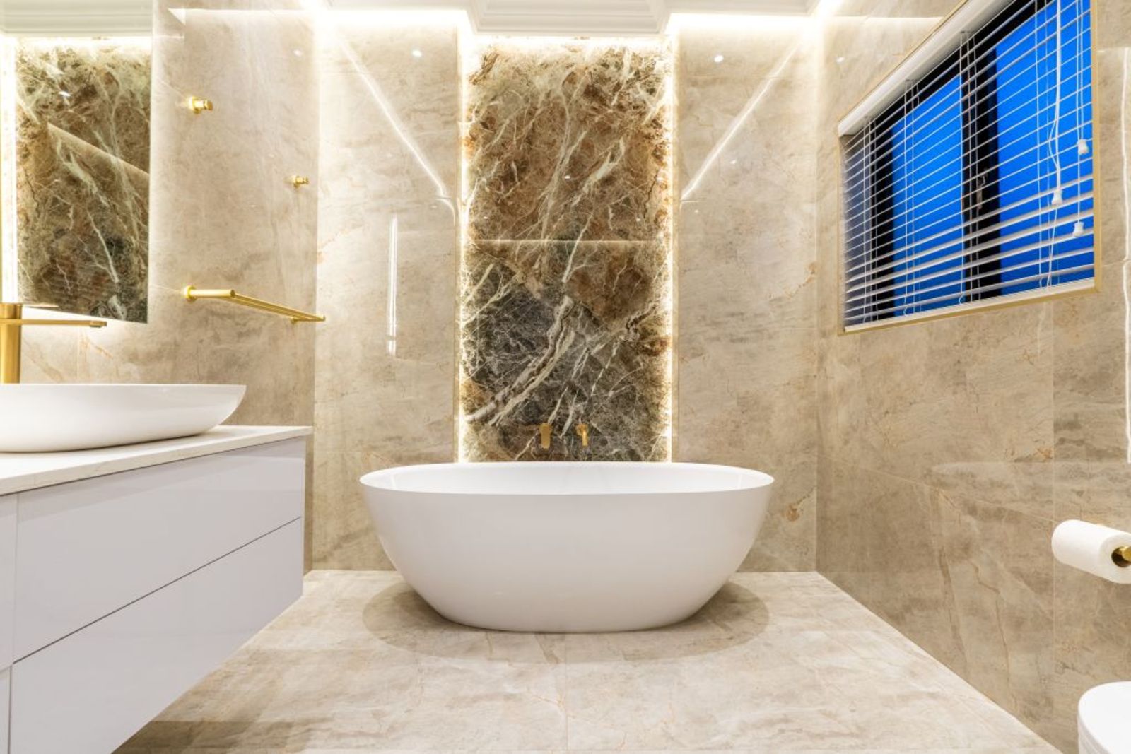Freestanding bathtub, rainfall shower, and gold fixtures — a spa-like sanctuary.