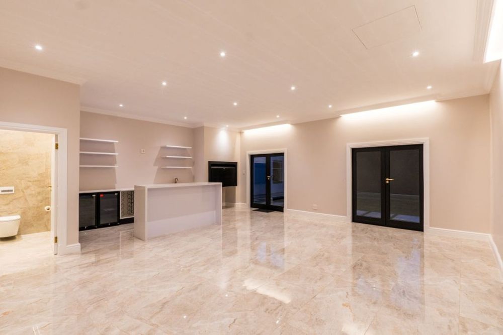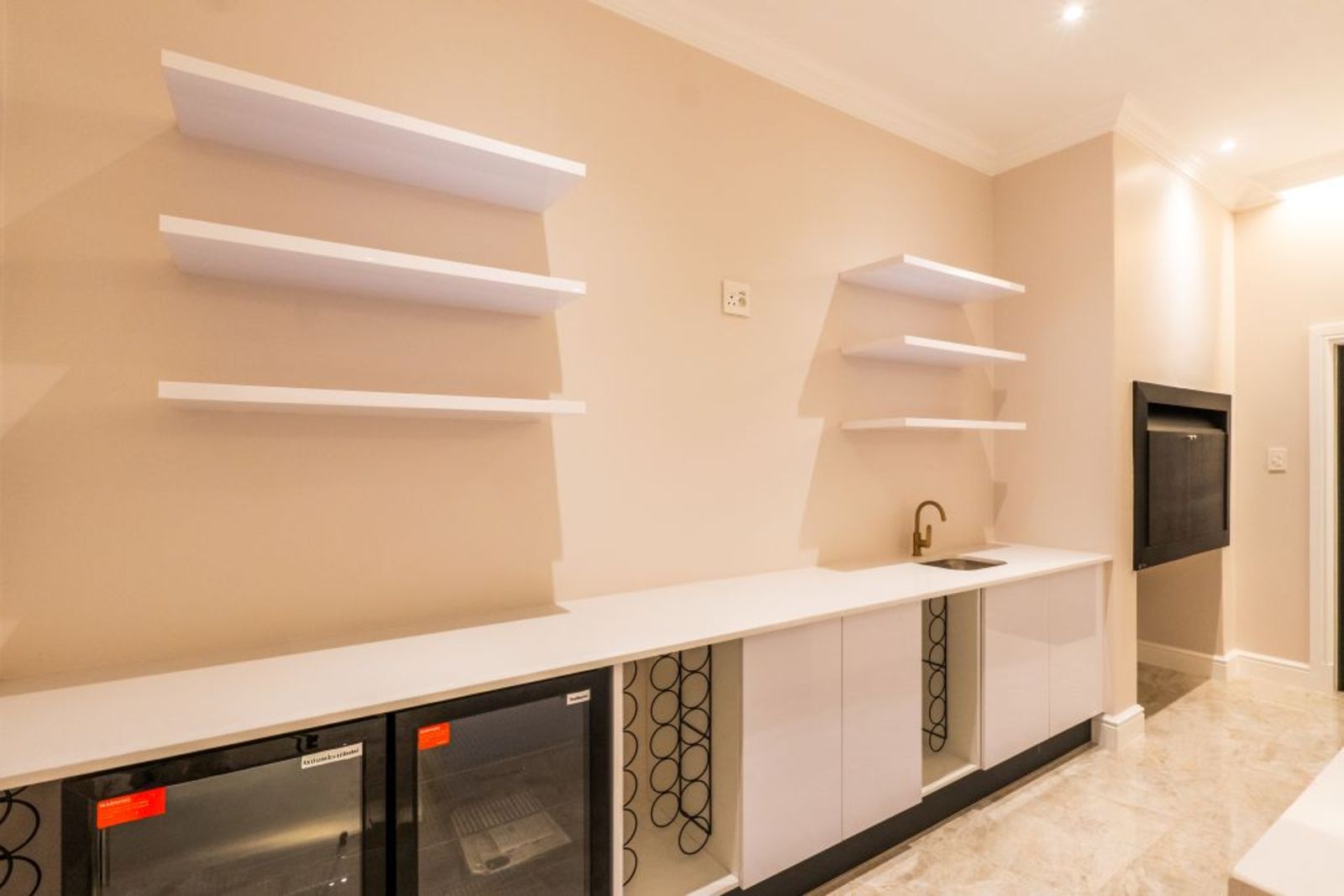 Indoor braai & bar area with floating shelves, wine racks, dual fridges, and guest WC — perfect for entertaining.