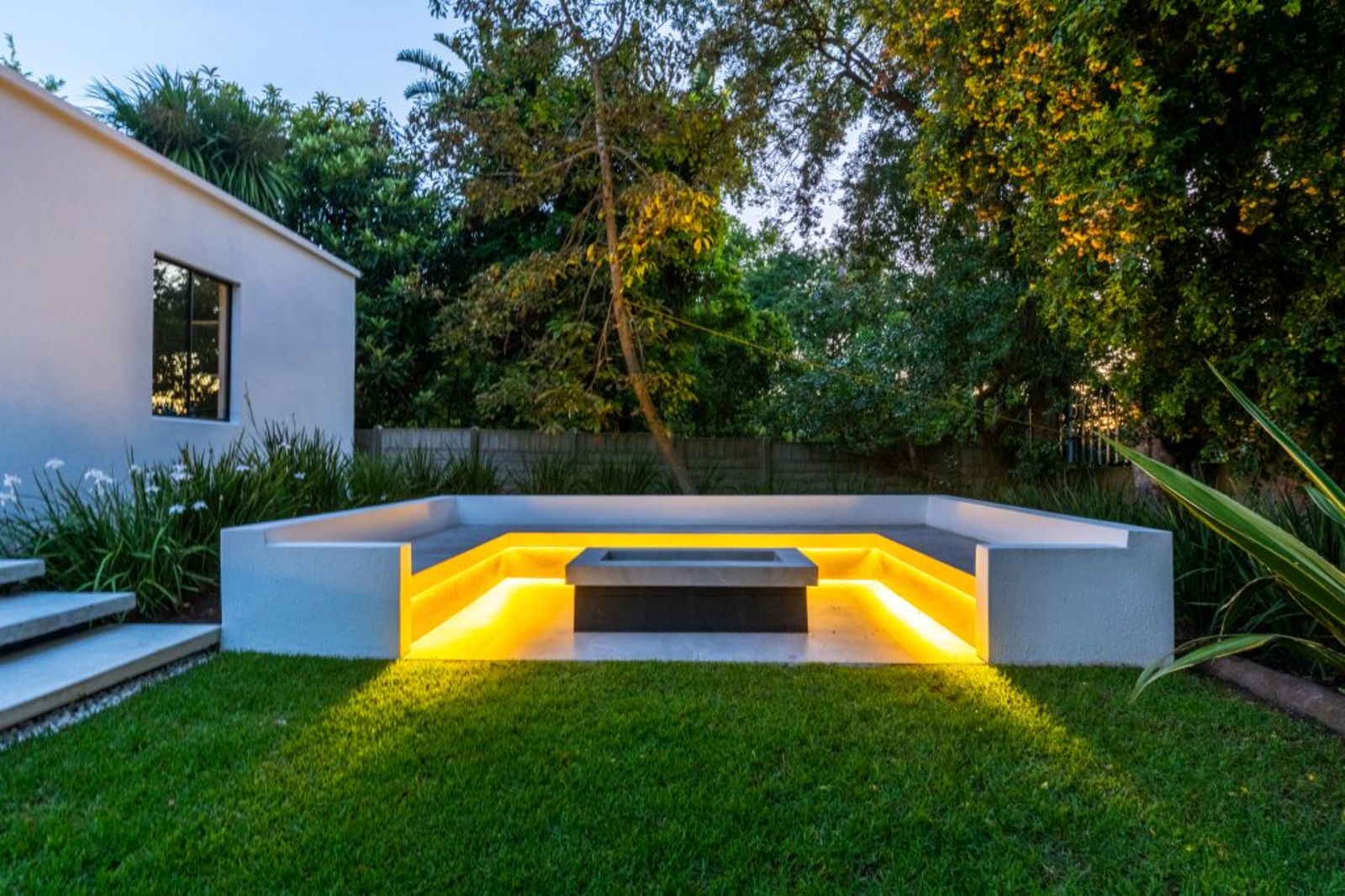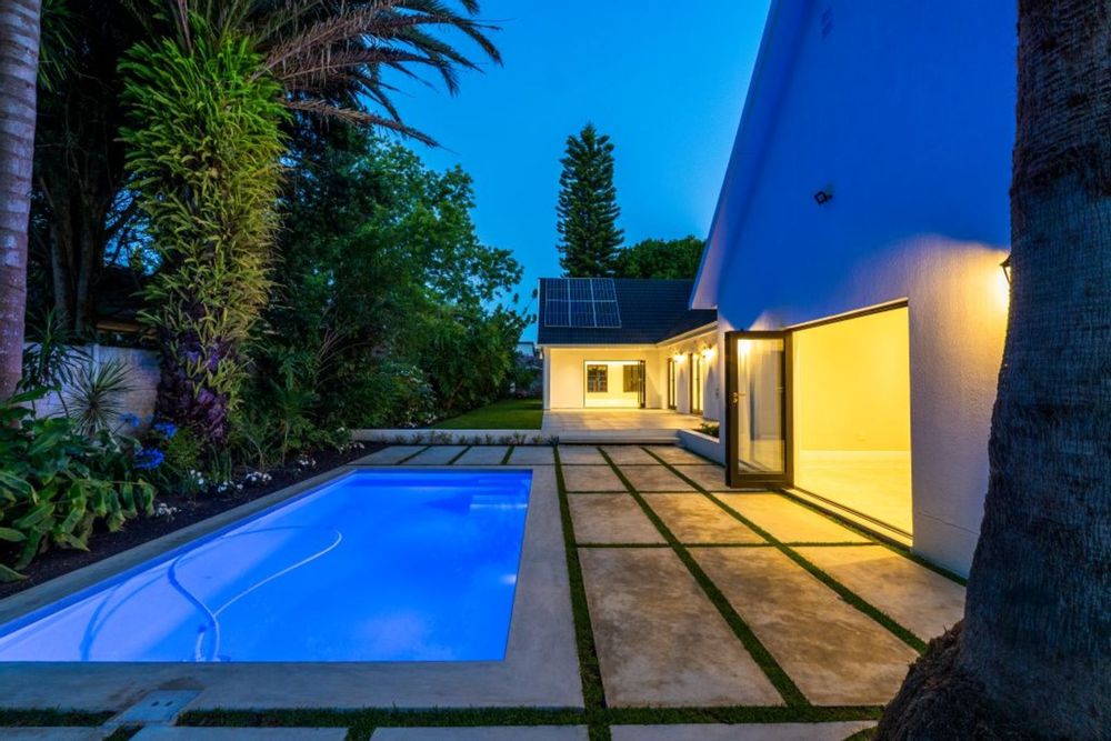 Sparkling pool framed by tropical greenery and a sunken LED-lit boma for unforgettable evenings.