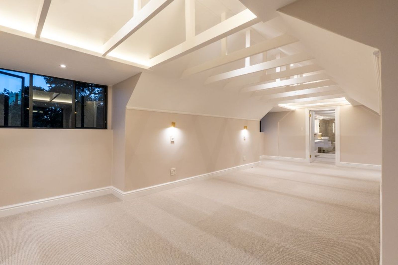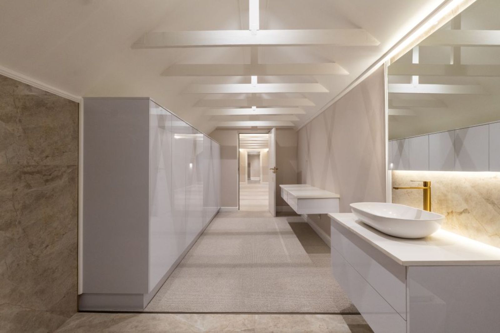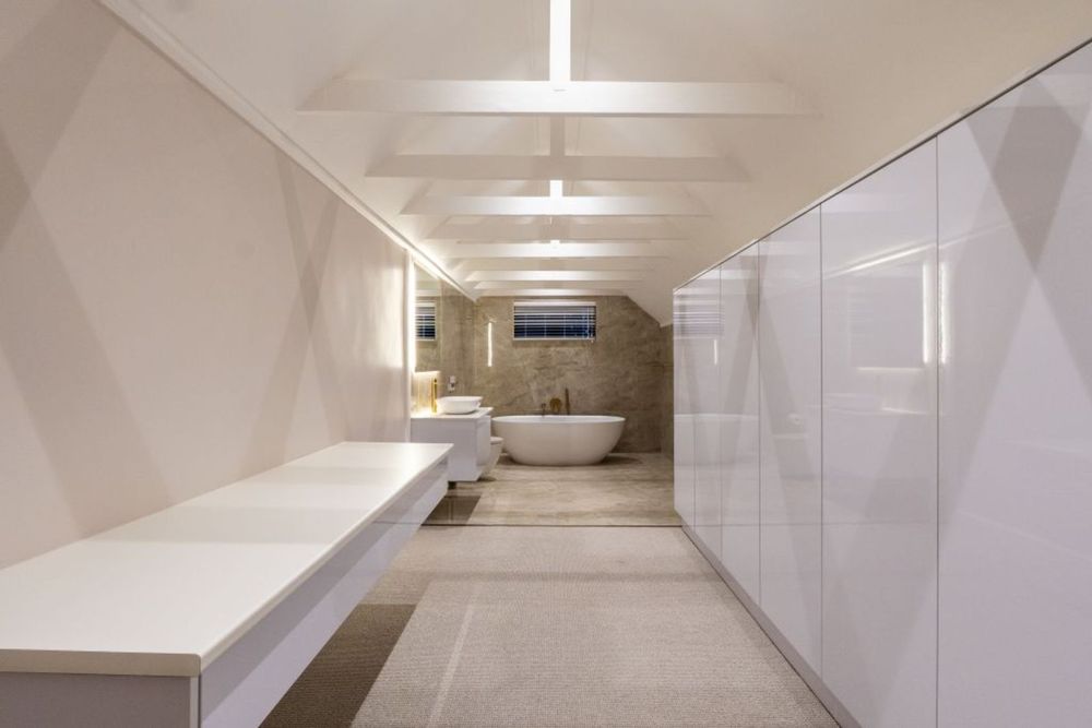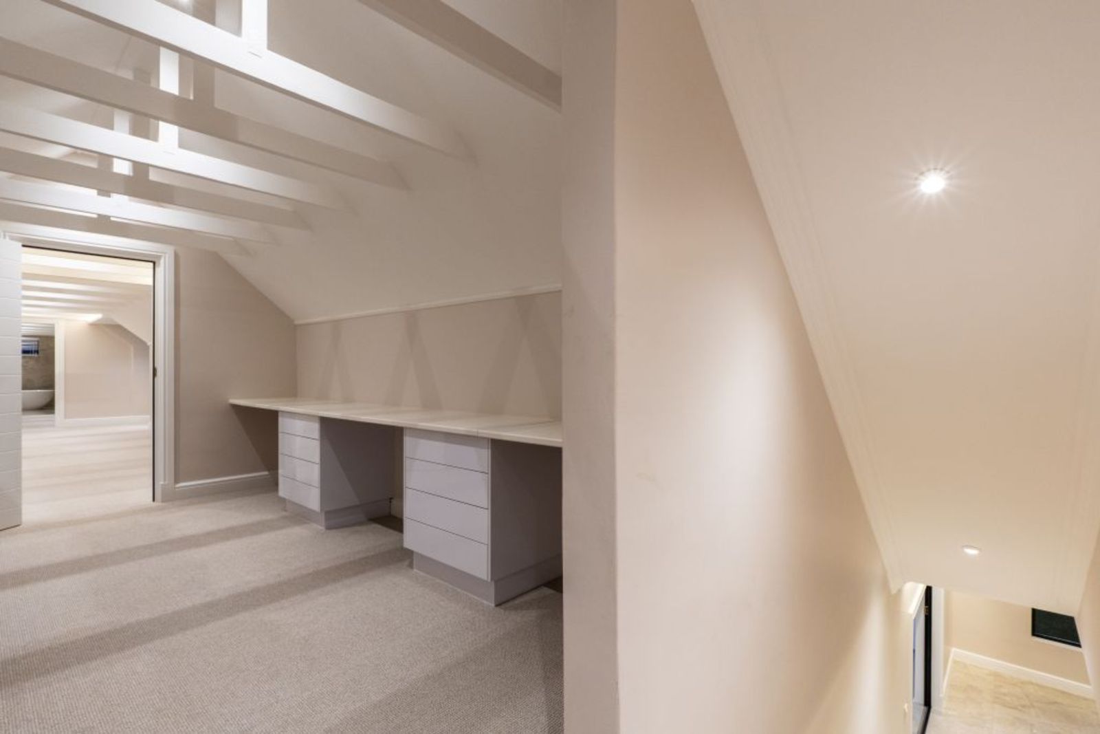 Loft-level retreat with floating concrete staircase, glass balustrades, study nook, and en-suite.