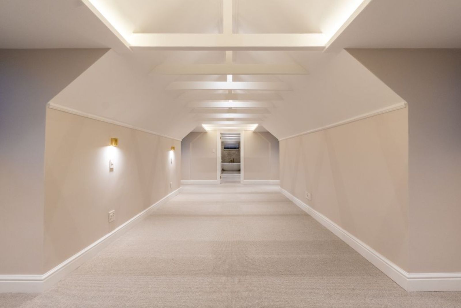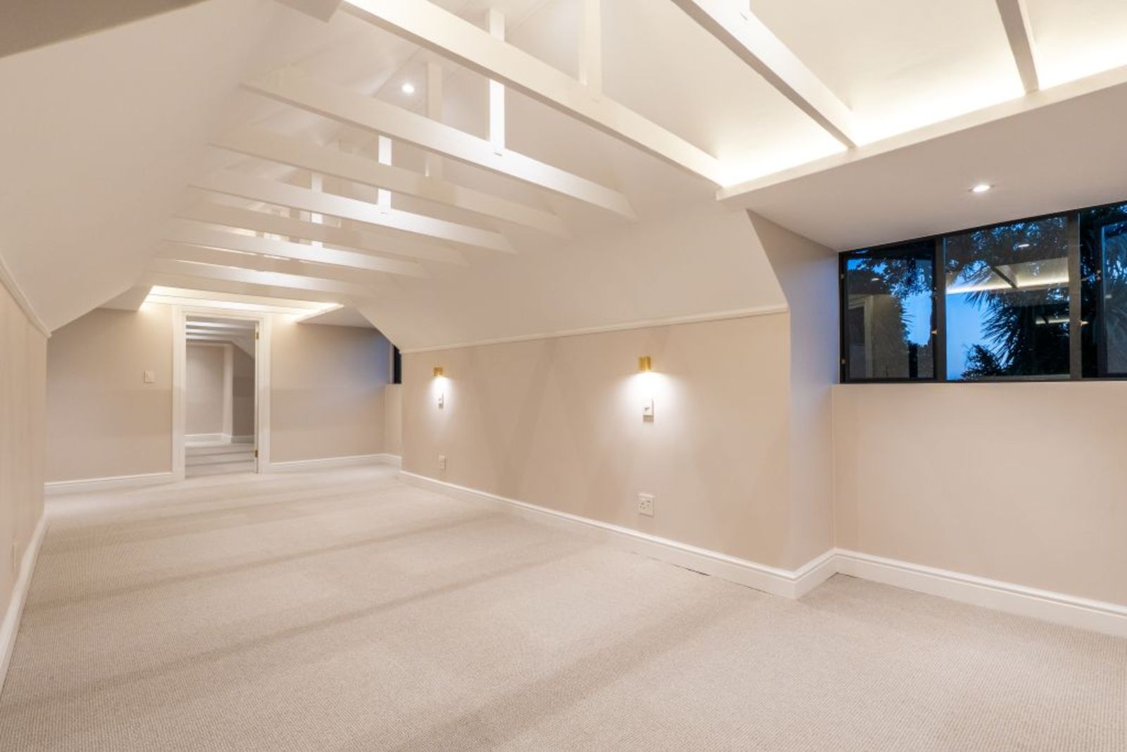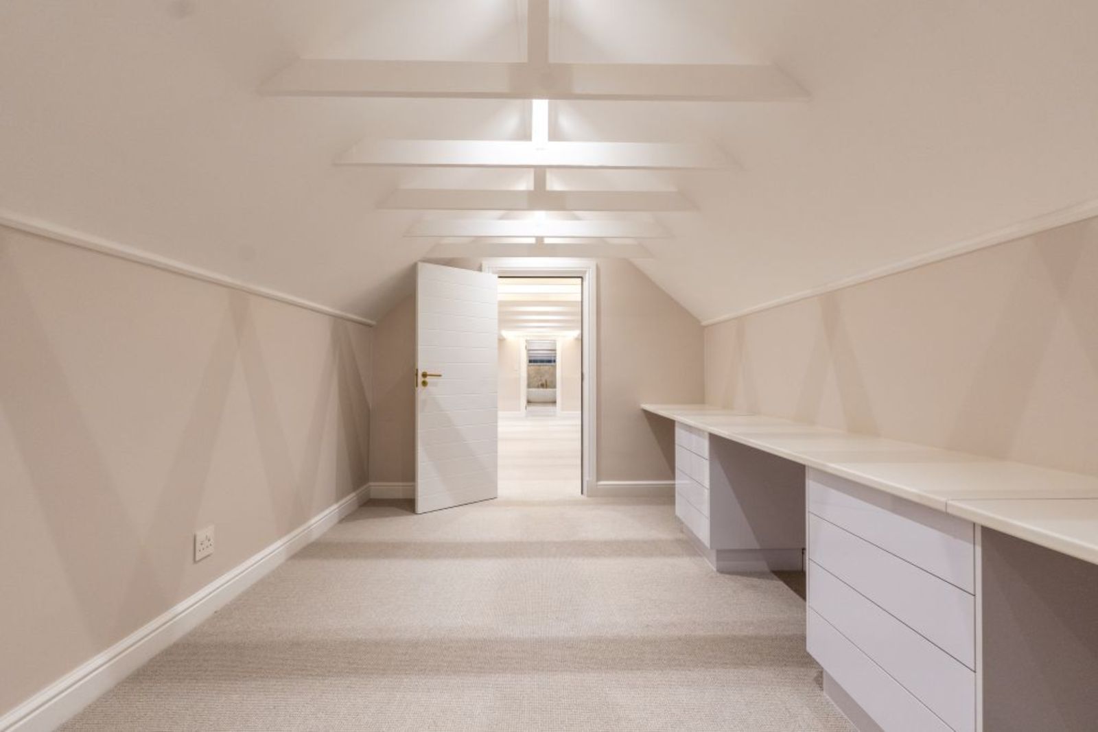 Loft-level retreat with floating concrete staircase, glass balustrades, study nook, and en-suite.