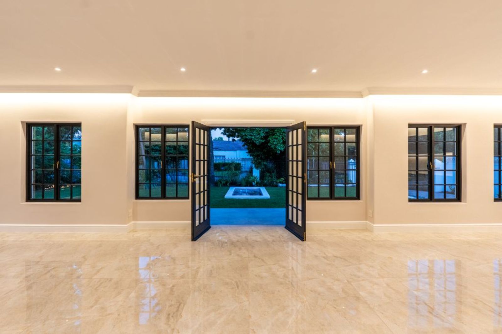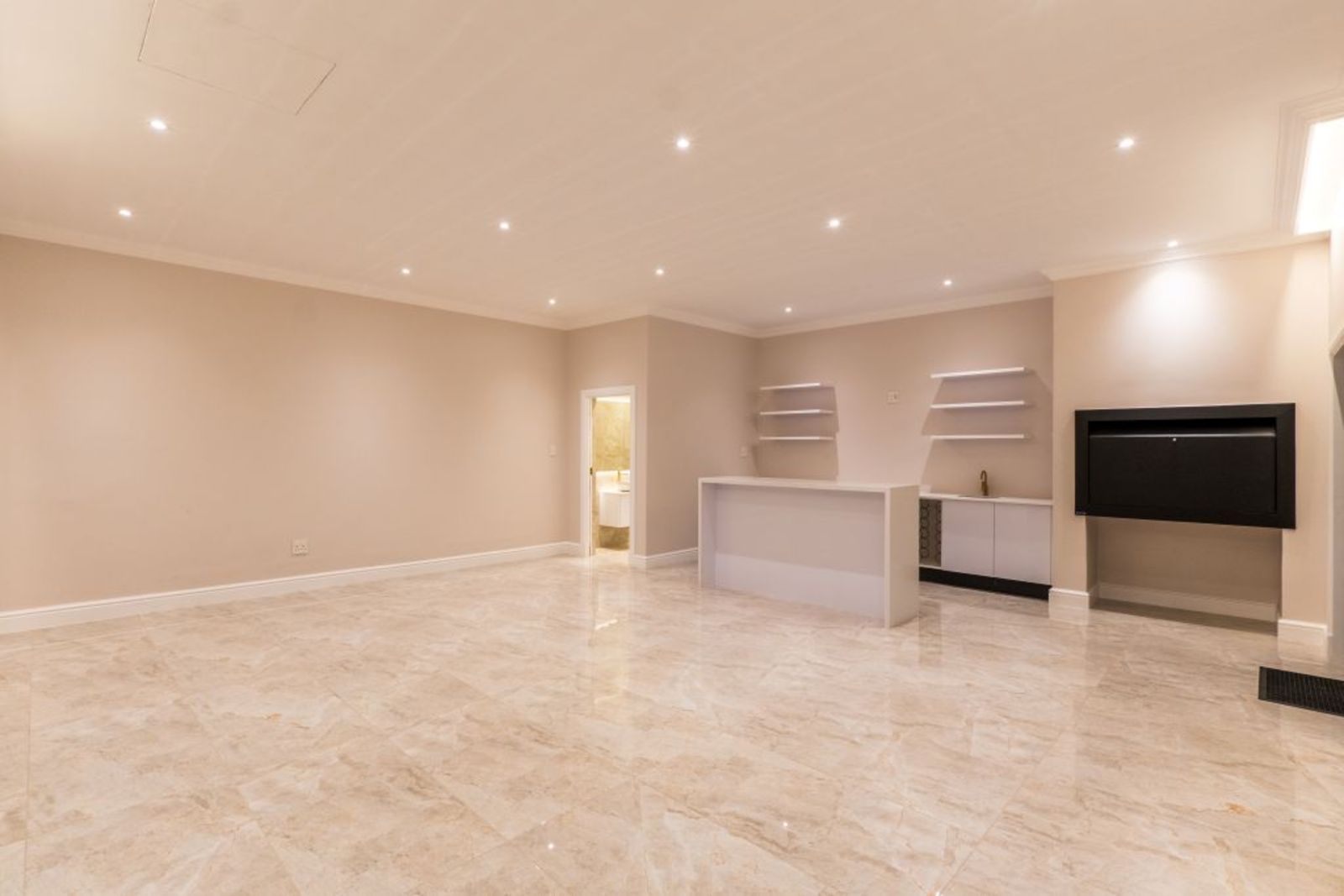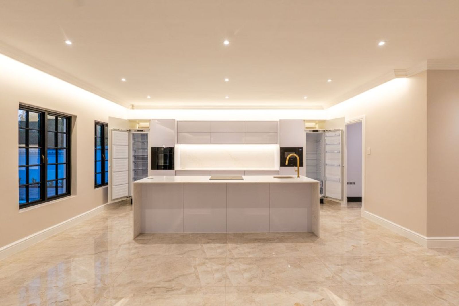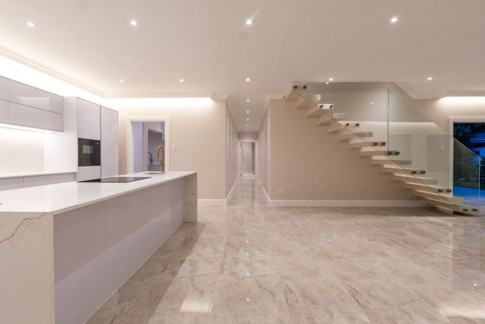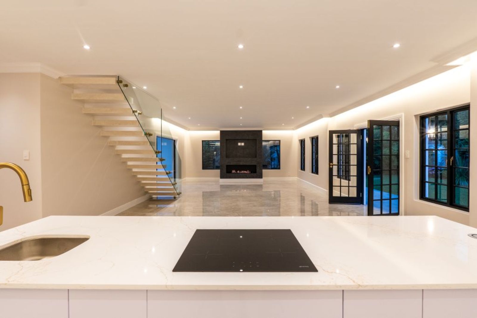 Open-plan living with imported Italian tiles, feature Pandomo wall, and sleek gas fireplace.