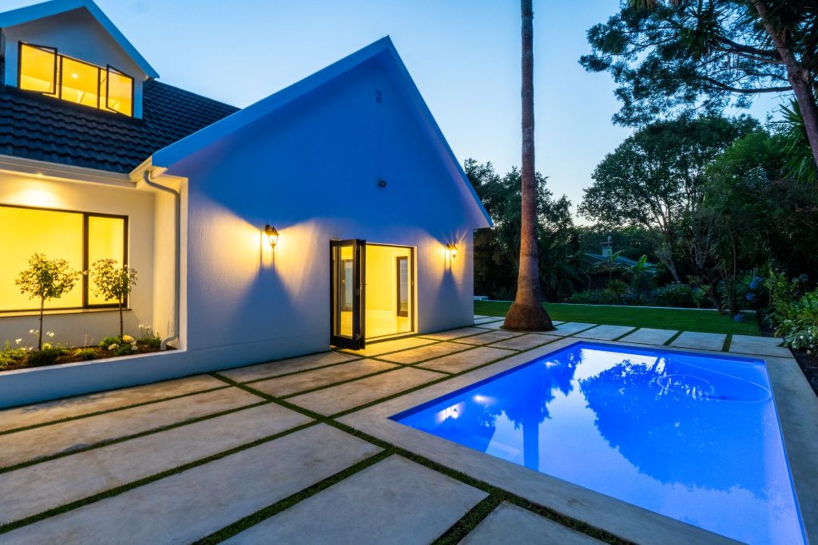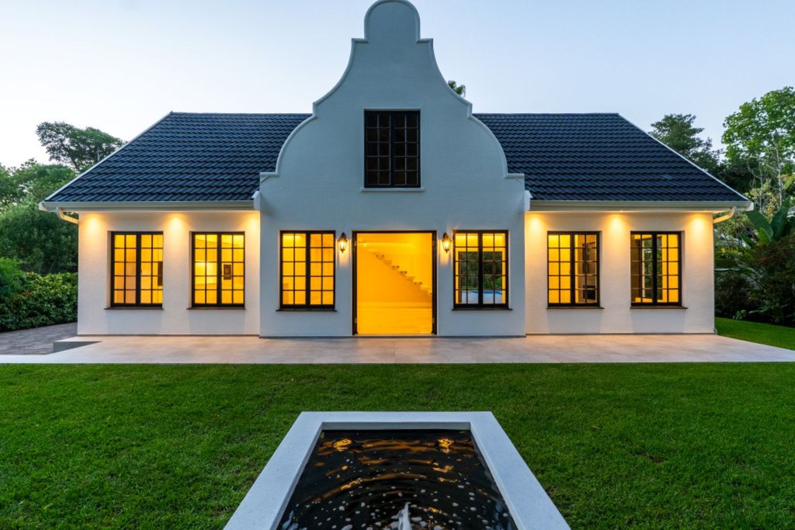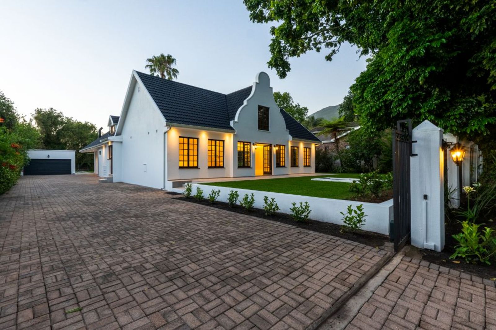 Symmetrical façade with glowing lanterns and a central gable window — a true showstopper at dusk.