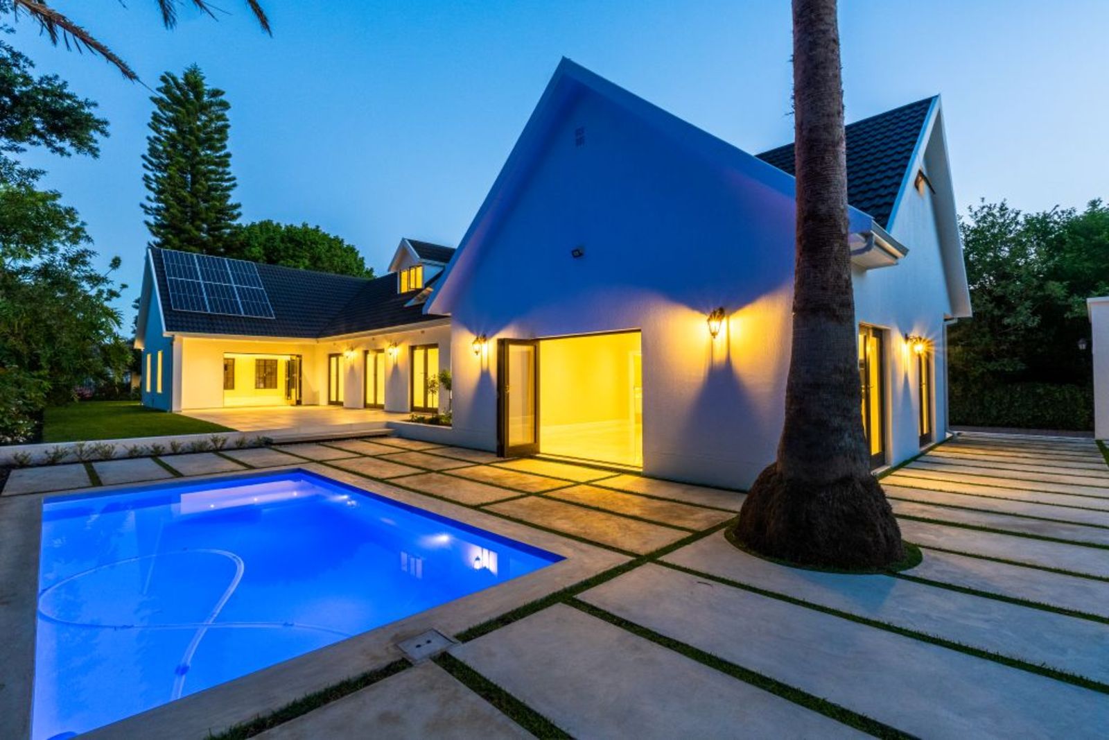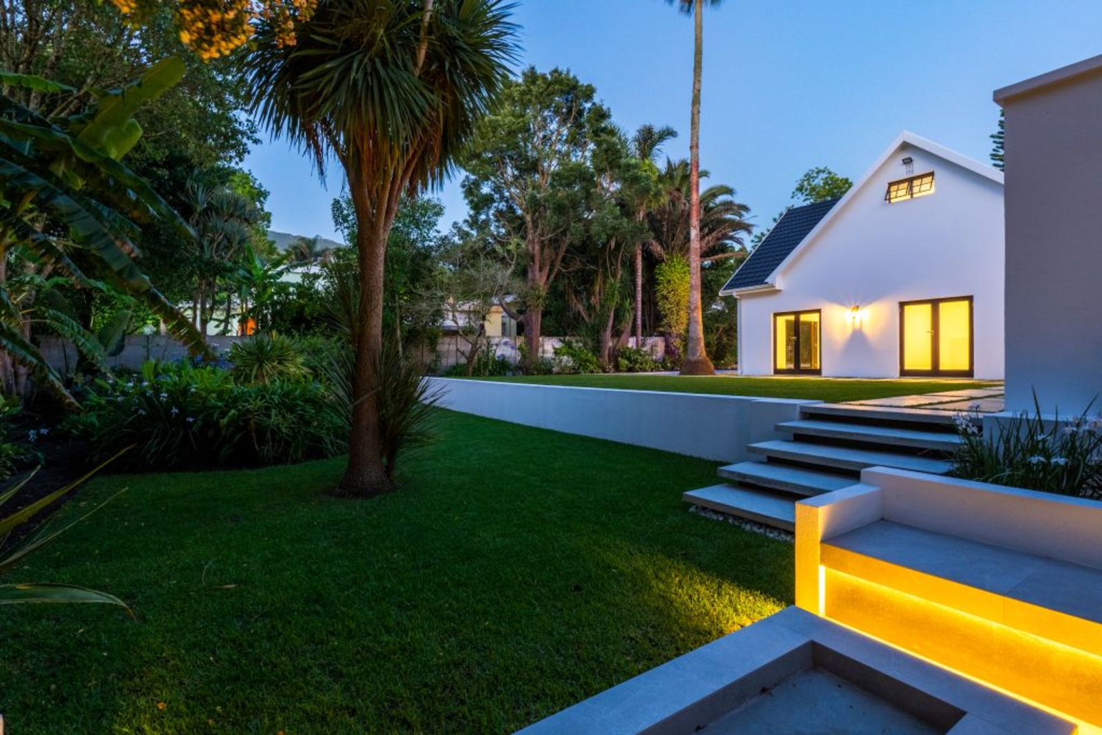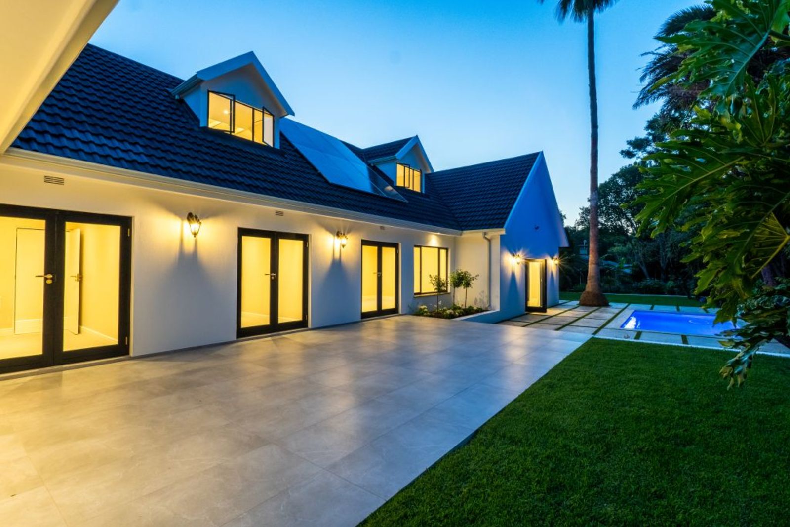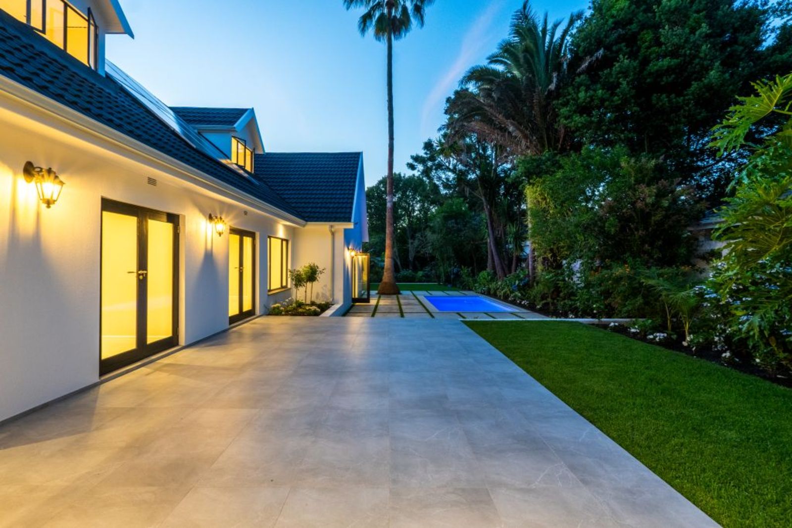 Symmetrical façade with glowing lanterns and a central gable window — a true showstopper at dusk.