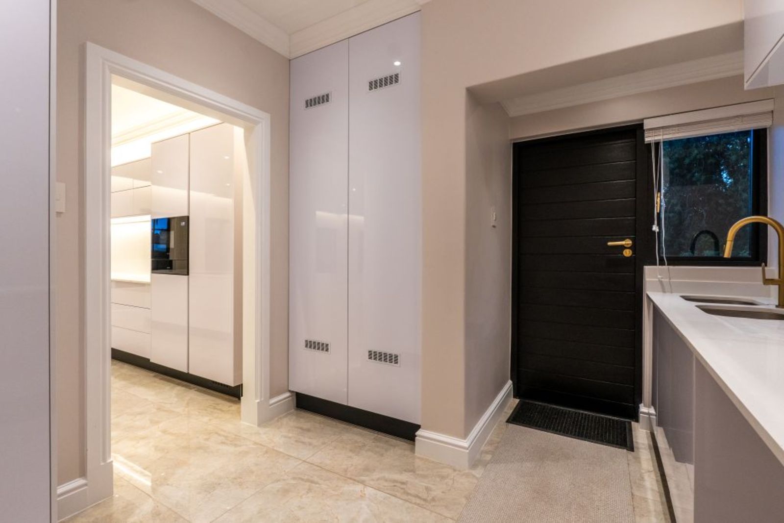 Designer kitchen: quartz countertops, soft-touch cabinetry, integrated appliances, and scullery with inverter system.