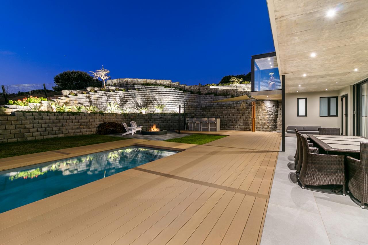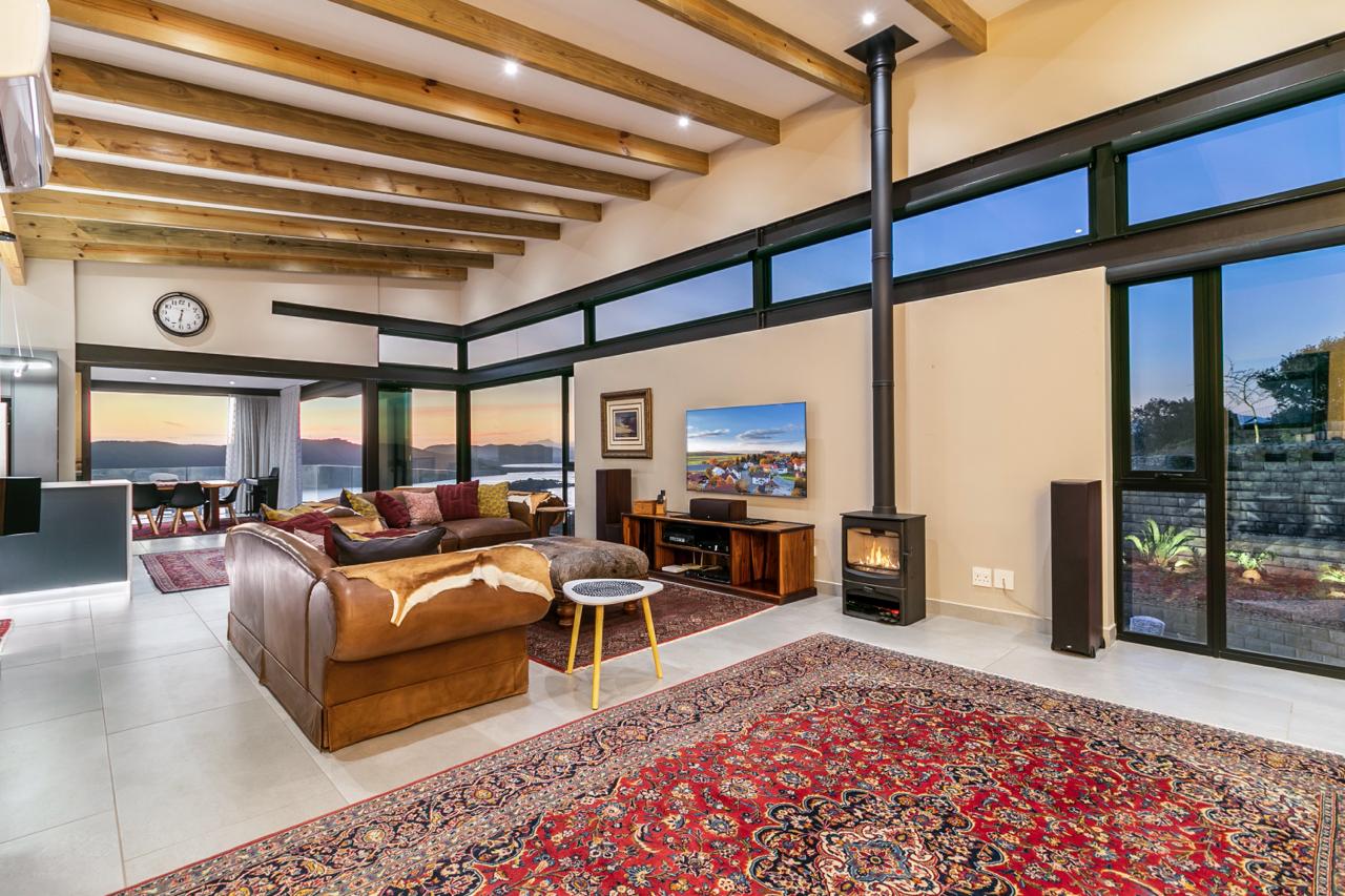 The clean-cut recent build double-storey flows effortlessly down to the barbeque deck, with its clever built-in concrete bar and Boma, making an impressive entertainment area. This is a proudly warm, welcoming hospitality home, for family life and pleasurable entertaining. The essence of the build on this unique estate is to enjoy the colour-filled sunsets across the expansive Knysna Lagoon.
