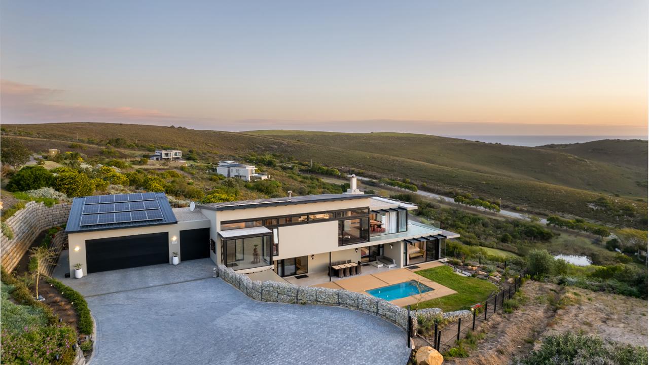 Stacking doors open onto a spacious patio, revealing distant sea and farmland views to the south east, as well as the Knysna Lagoon north west and beyond. Luxury light and spacious bedrooms on the ground floor open directly to the sunny garden and pool area. The downstairs laundry cleverly doubles as a catering hub for easy entertaining, with an outside loo and a shower for convenience.