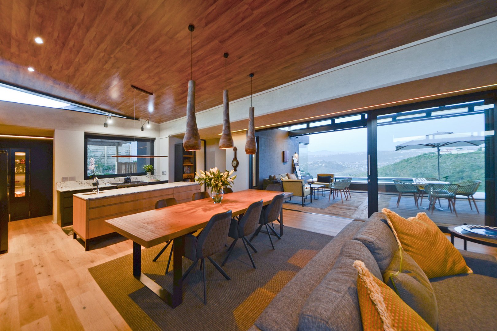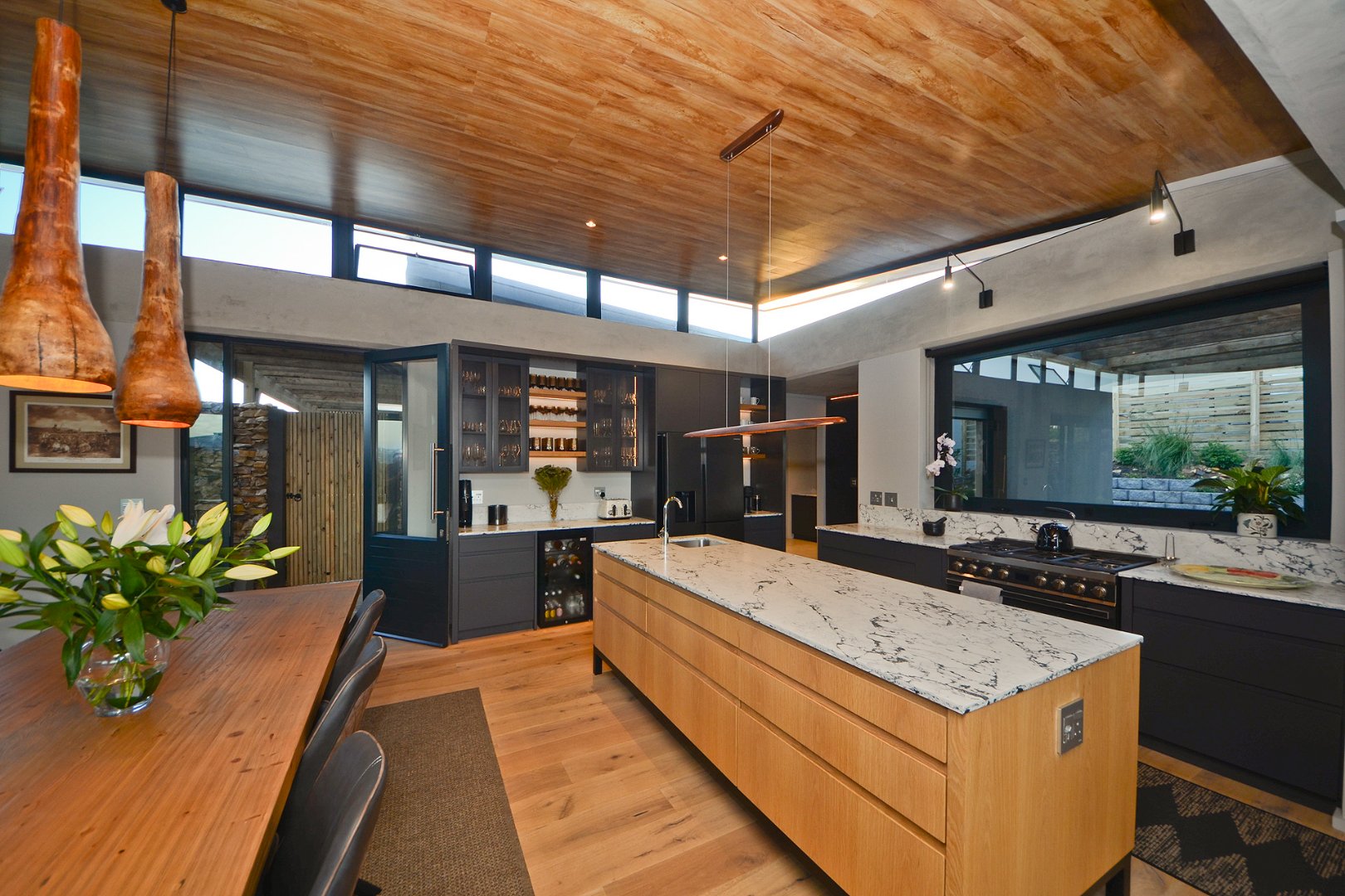 Clip lock Chroma deck roofing with high wood ceilings and high windows encourages northern light and warmth inside, these vast sliding doors bring in controlled refreshing ventilation.