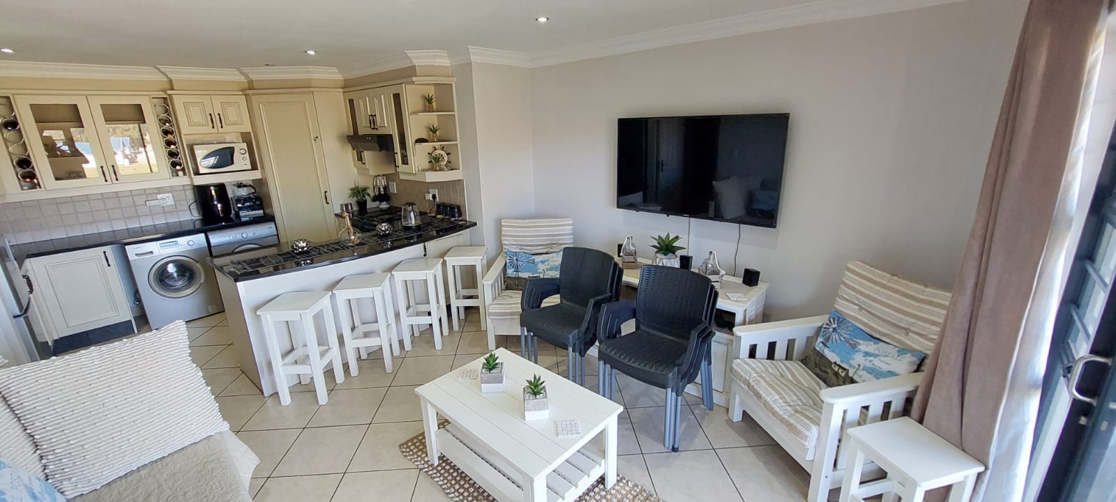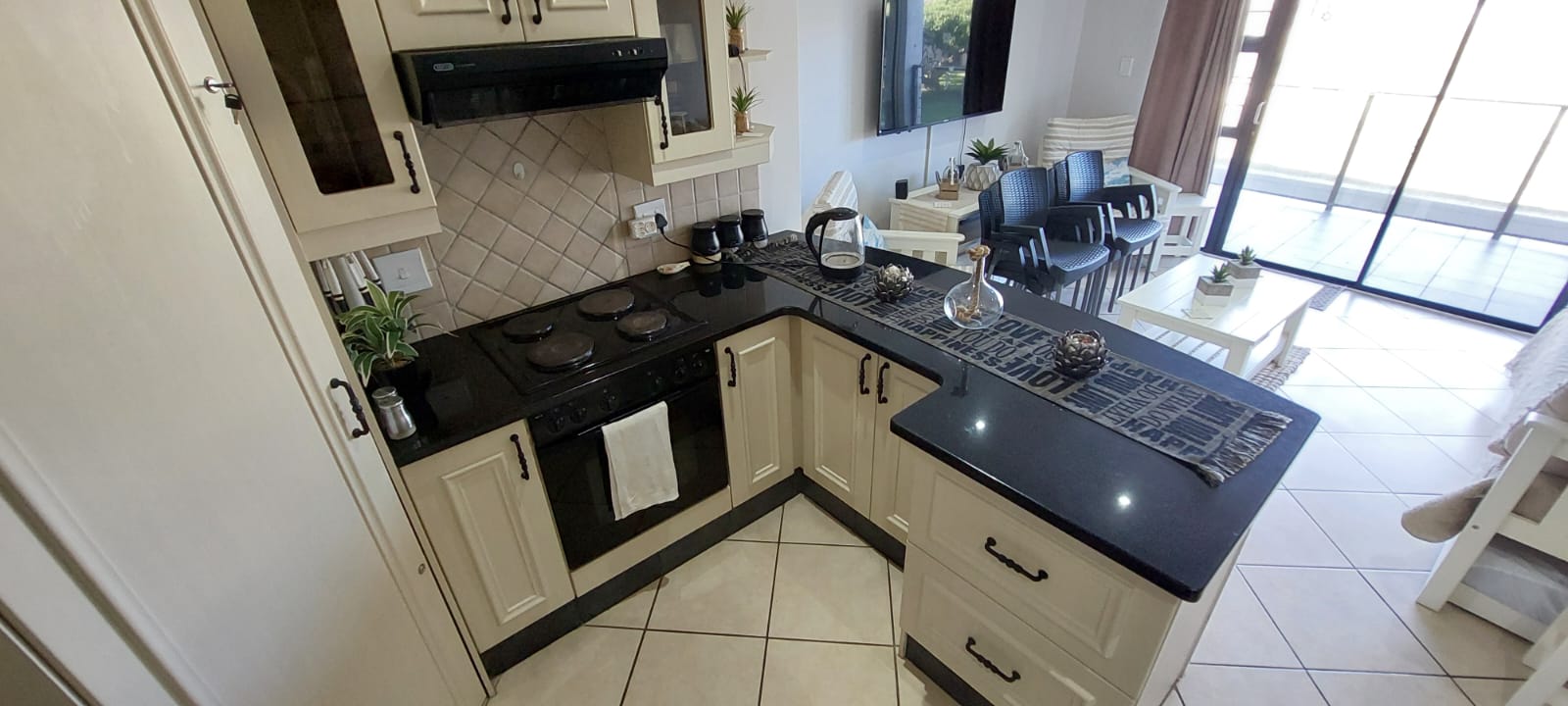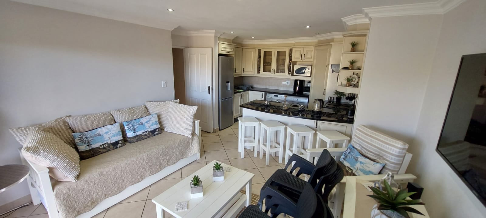 The open-plan kitchen and living room create a warm, functional space ideal for both long-term living and short-term letting. One of the standout features is the expansive, wraparound patio-style balcony, which stretches seamlessly from one side of the unit to the other. With direct access from both bedrooms and the living room, the balcony invites natural light and fresh sea air into every corner of the apartment. It also includes a built-in braai area, perfect for enjoying relaxed outdoor meals while soaking up the laid-back coastal atmosphere.