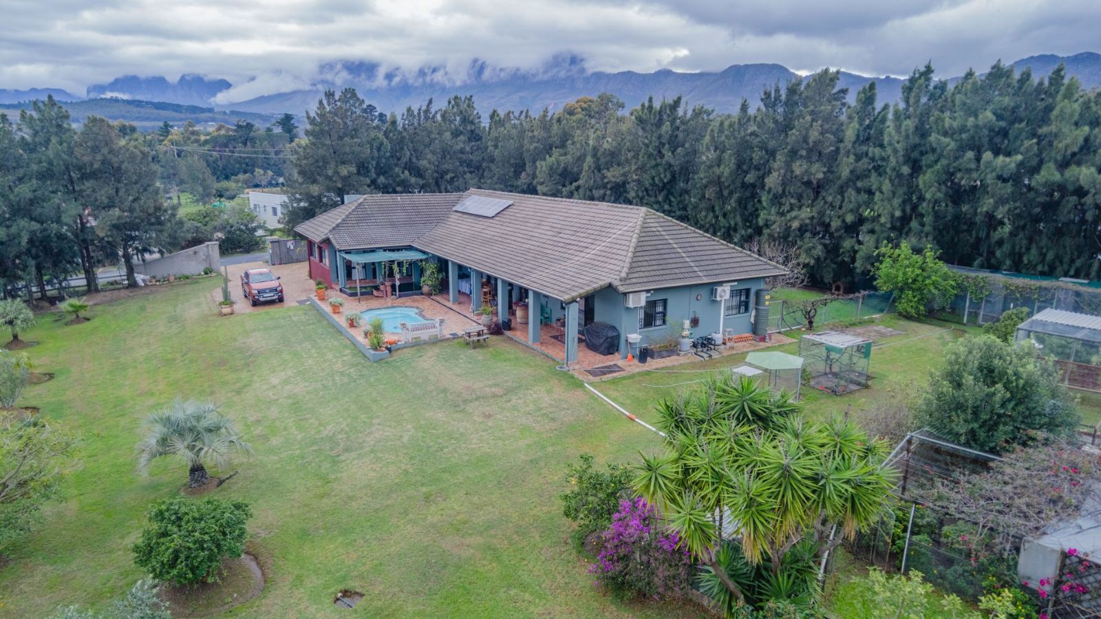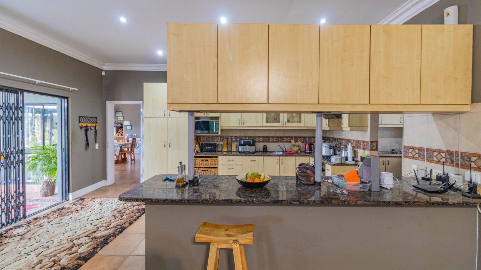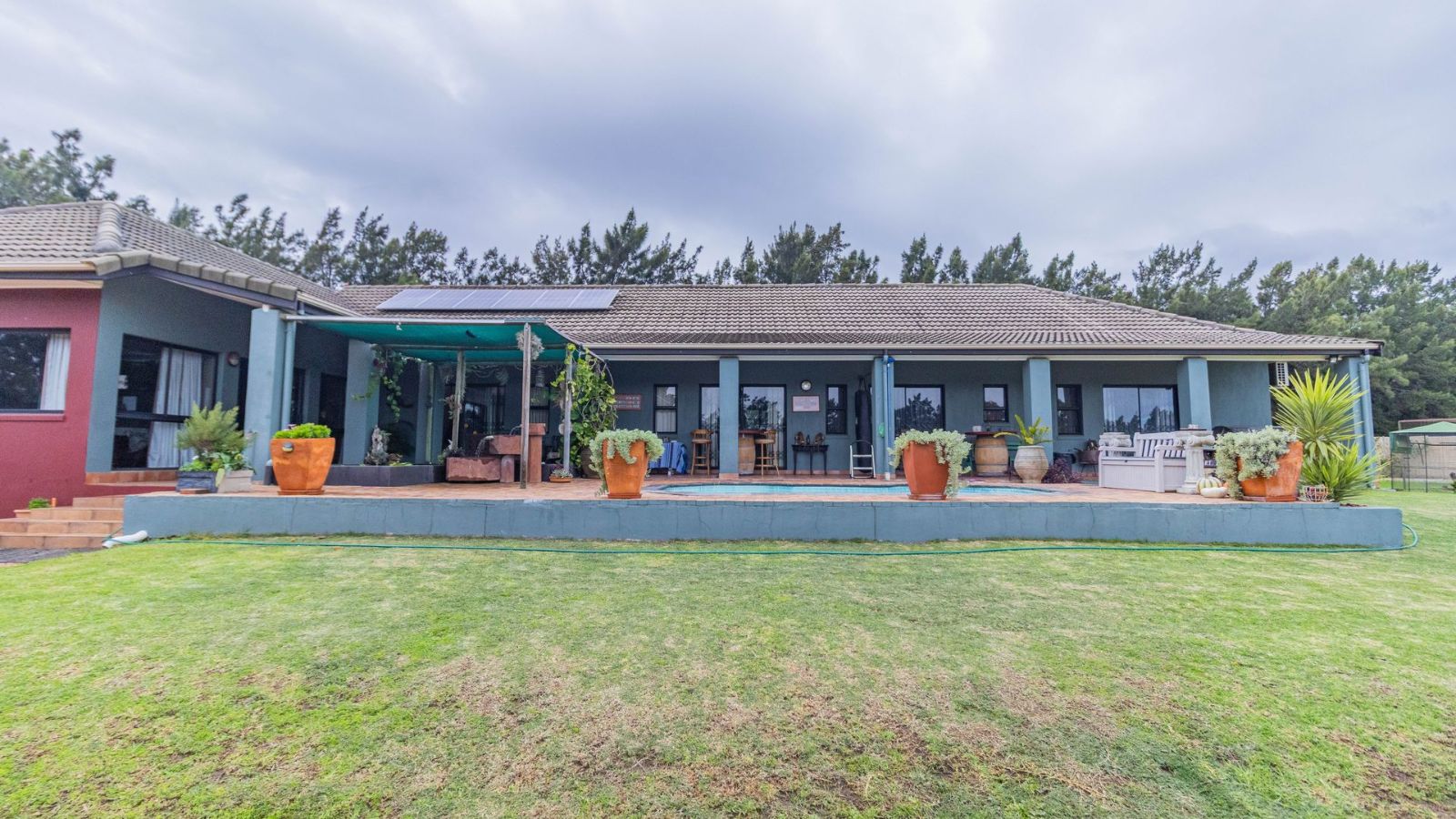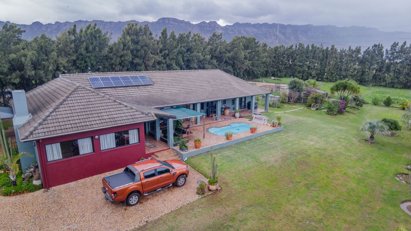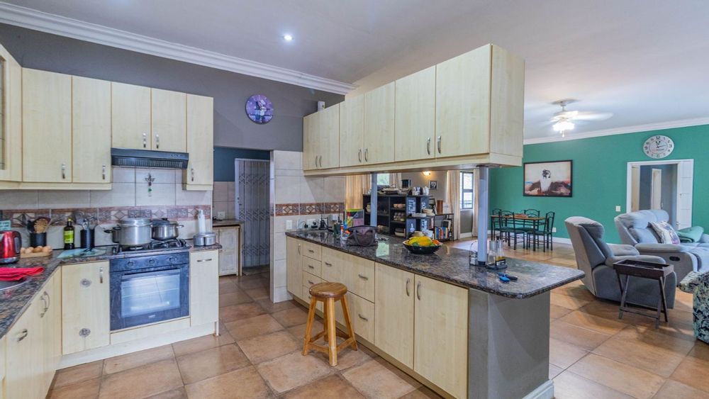 Outdoors, you’ll find a double garage, double carport, and plenty of additional parking space. The property also features solar power and a borehole that supplies clean water – ideal for sustainable living. A full alarm system adds extra peace of mind.