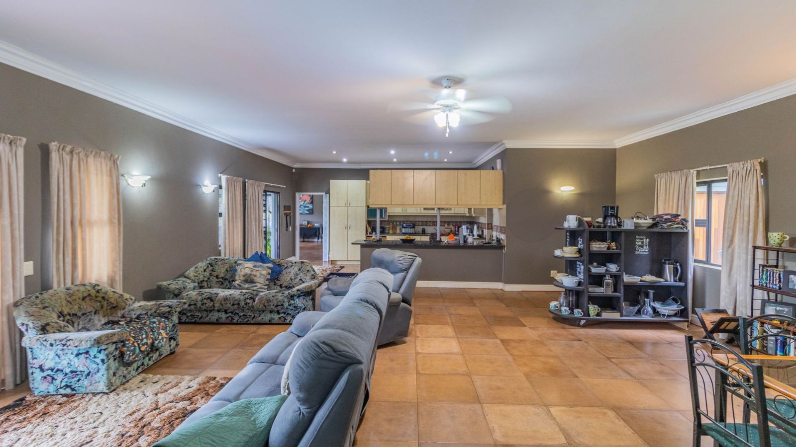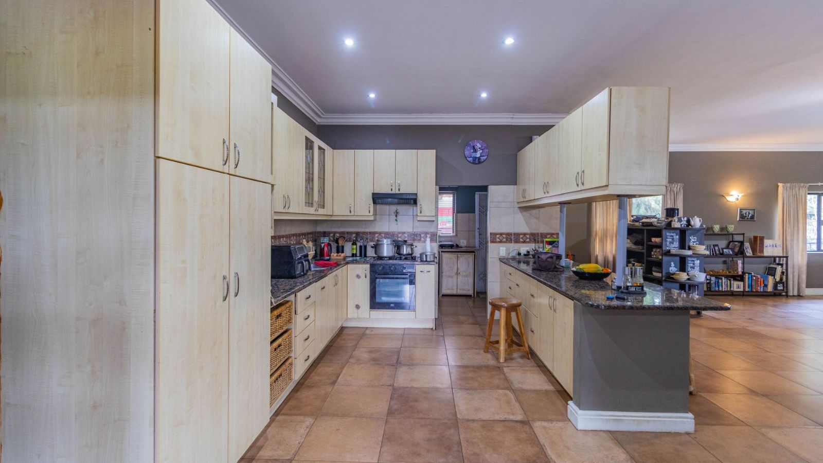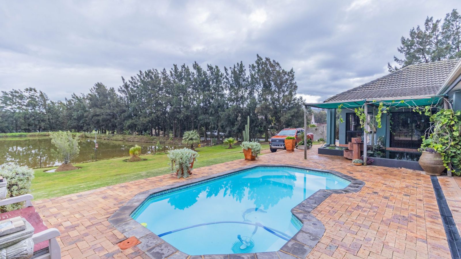 The open-plan kitchen and lounge flow effortlessly into a separate dining and entertainment area, where there’s space for a built-in braai — perfect for hosting family and friends. Large doors open onto a generous covered patio, leading to a sparkling swimming pool and peaceful fishpond with a water feature.