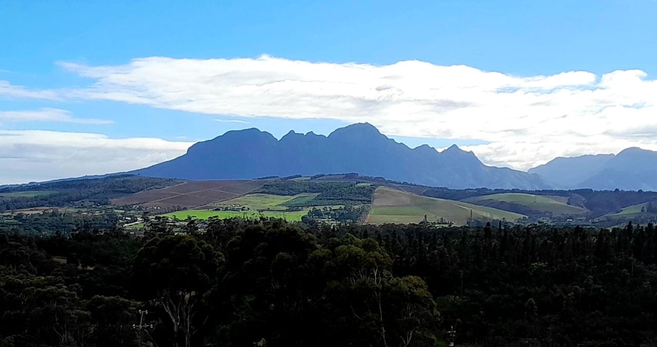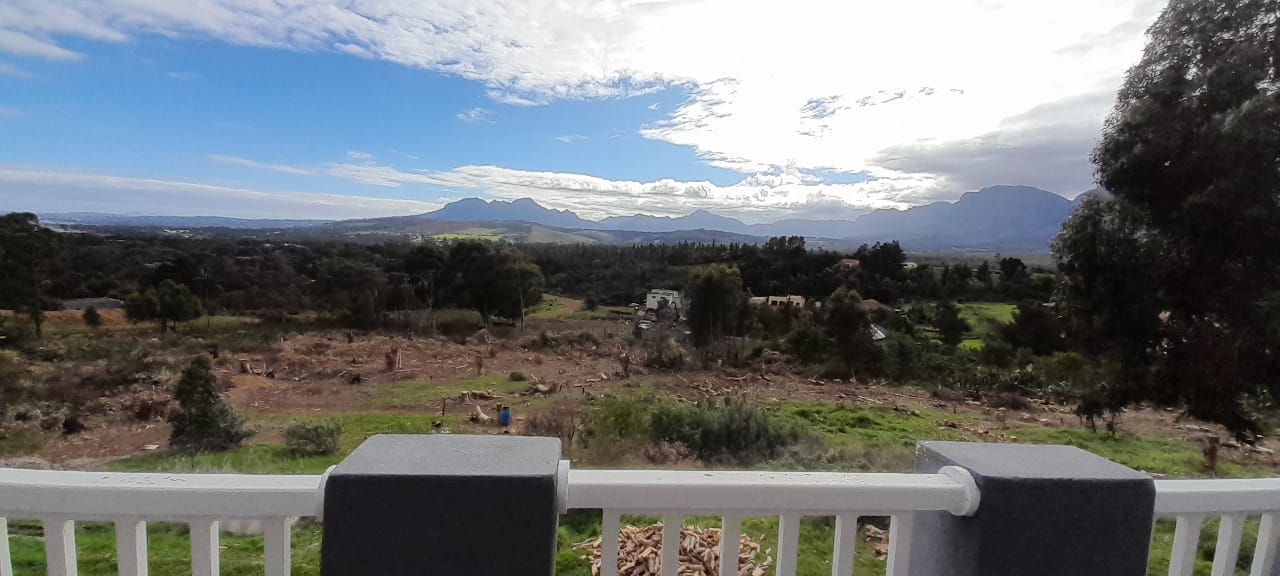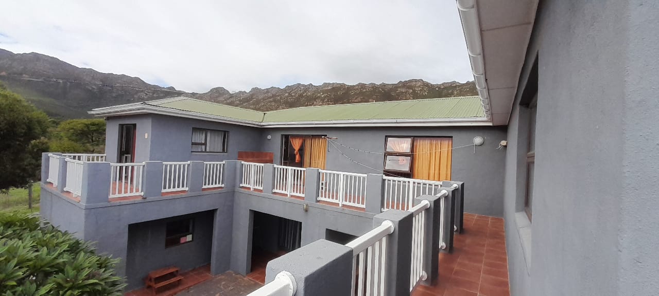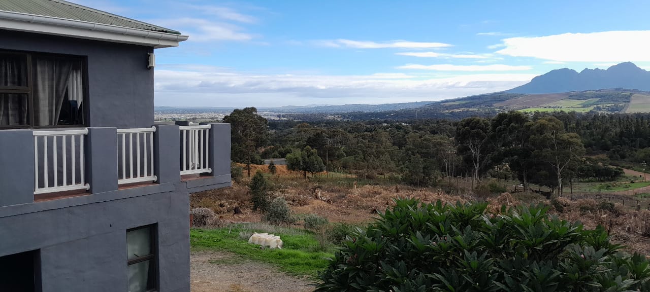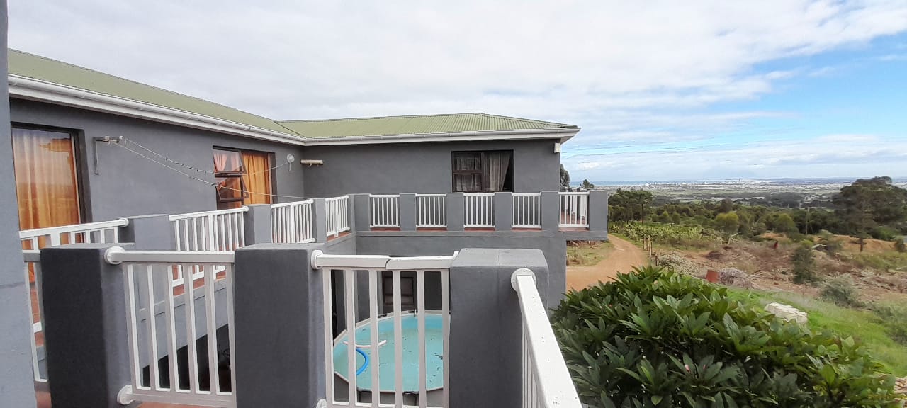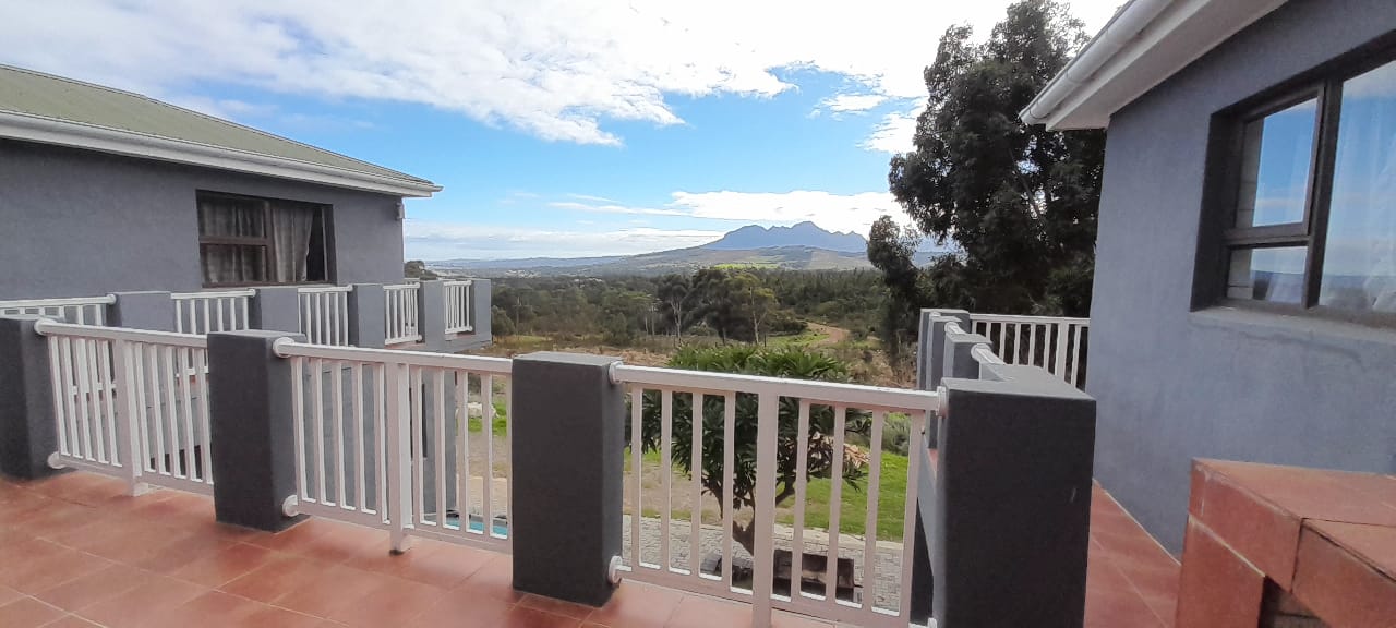 A balcony that is wrapped around the front of the house with beautiful views of the Helderberg mountains.