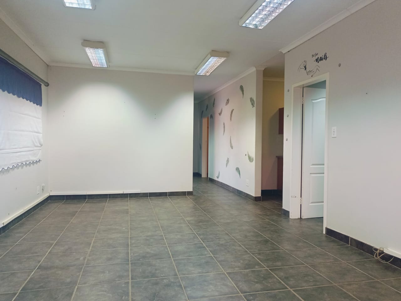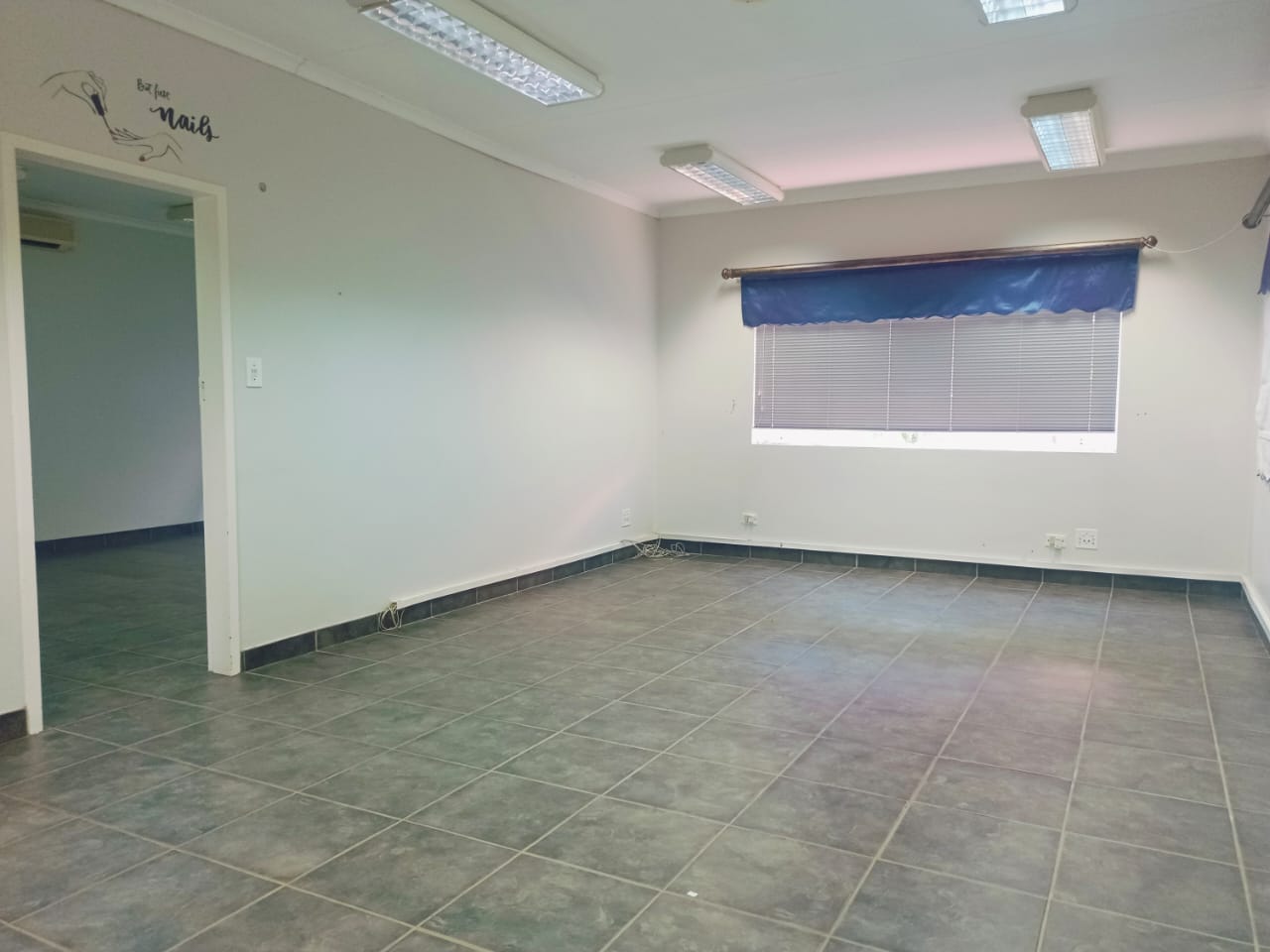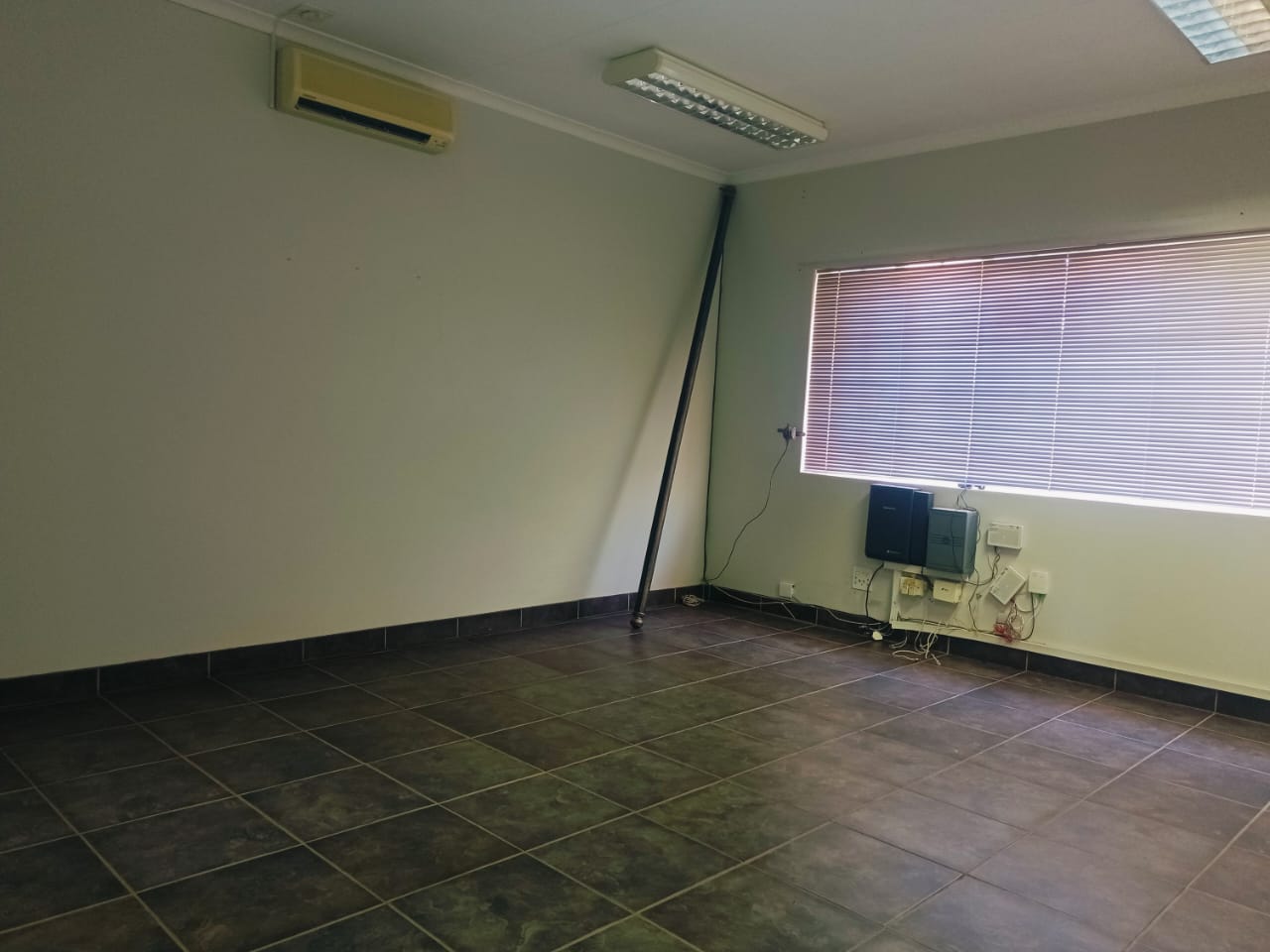 This well-laid-out office offers a welcoming reception area, a private enclosed office fitted with air-conditioning, and a bathroom for convenience. An additional room provides extensive cupboard space, ideal for storage and organization.