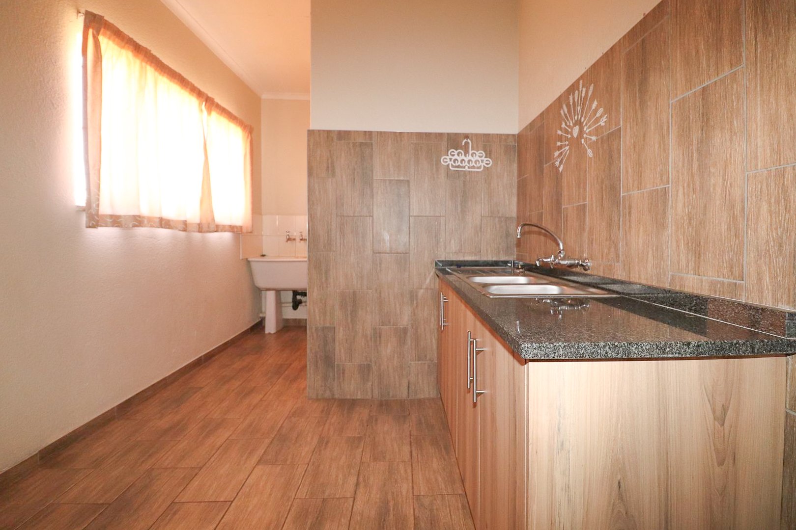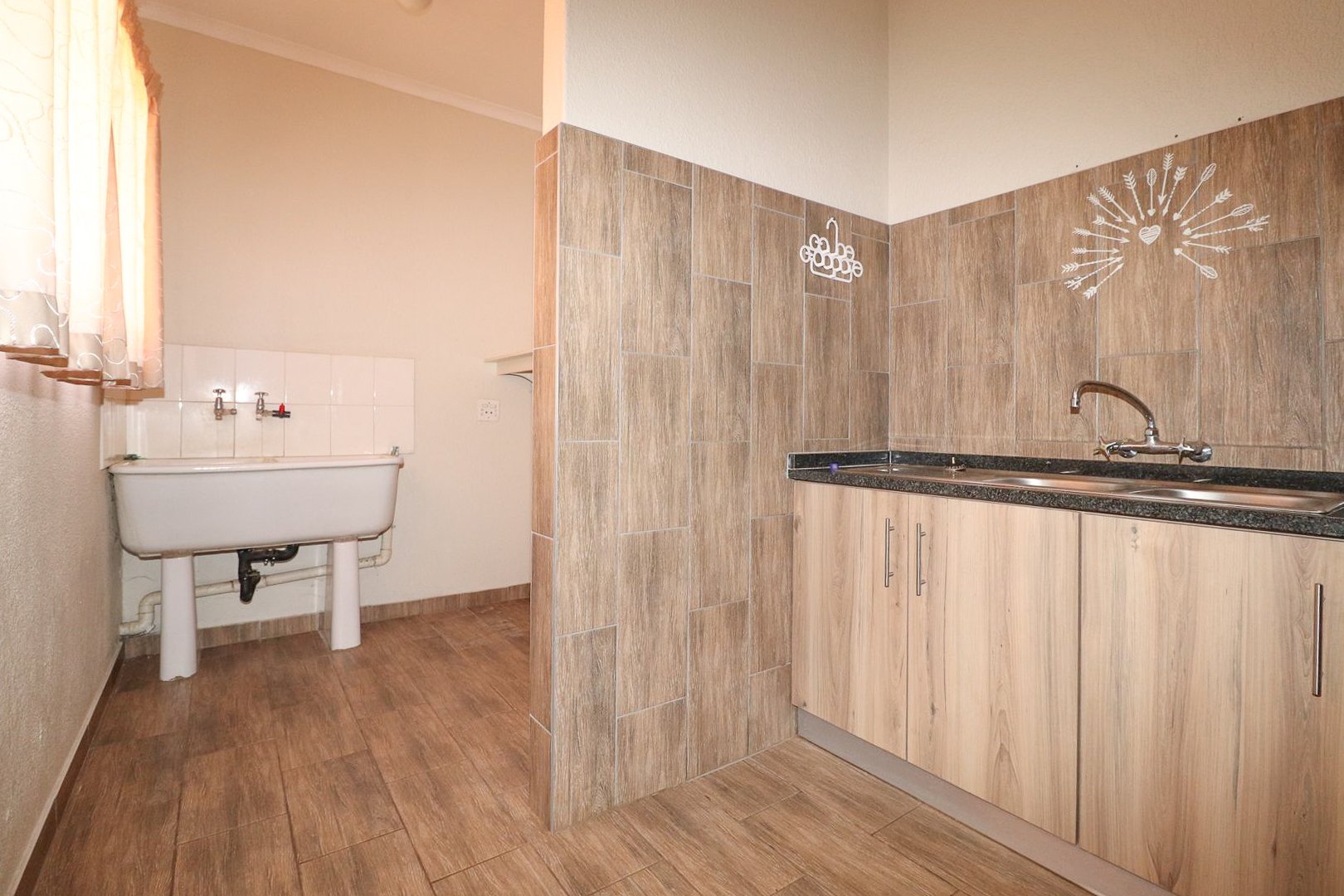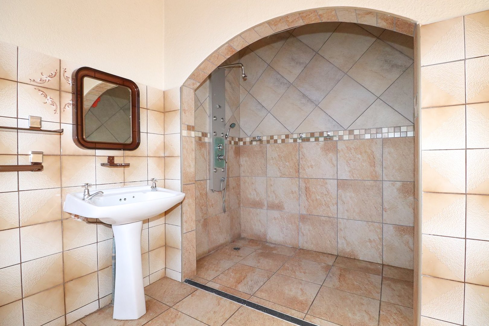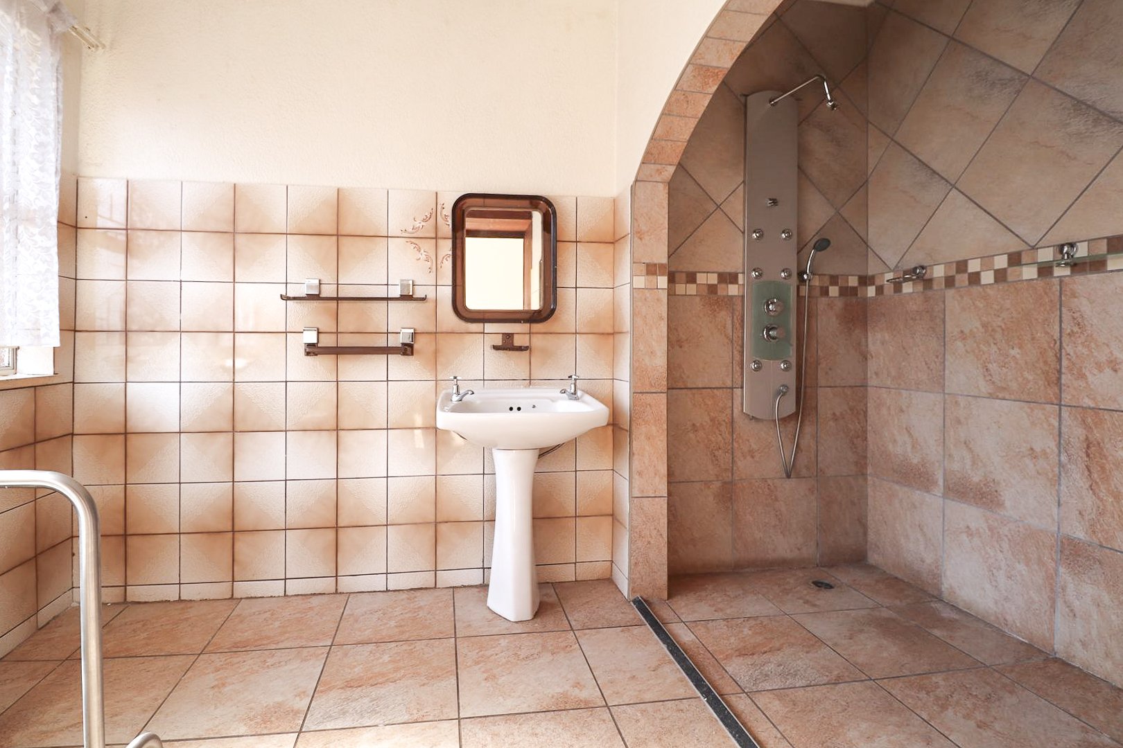 A spacious home with cozy living spaces, including a large thatched lapa with built-in braai, -bar.