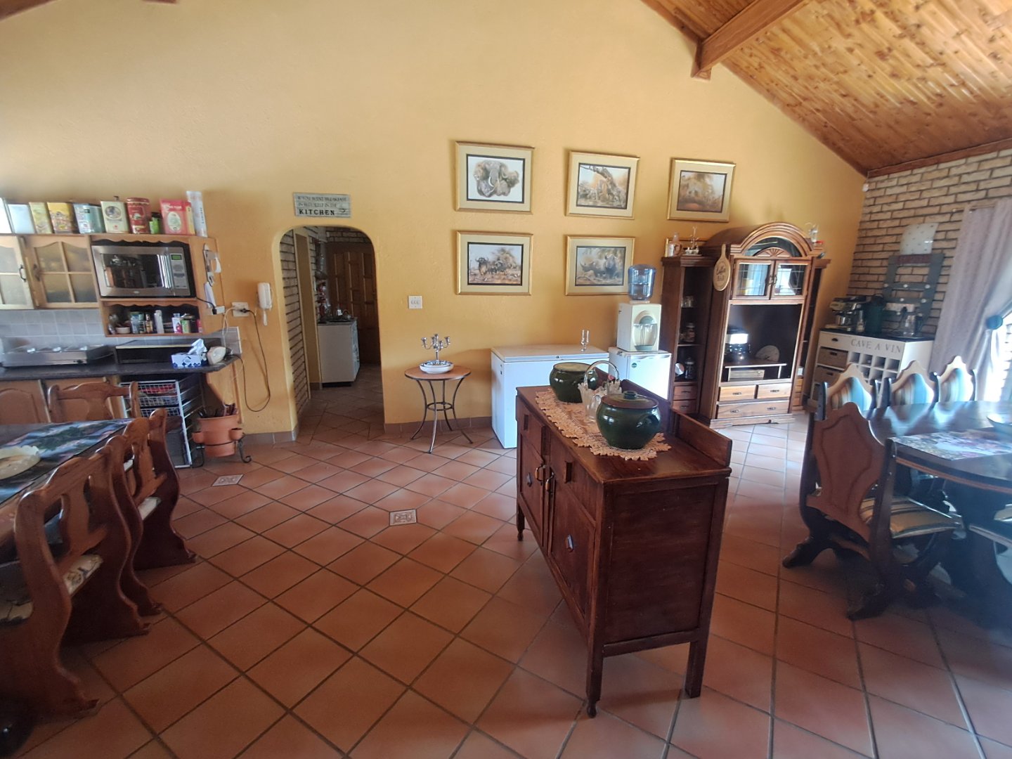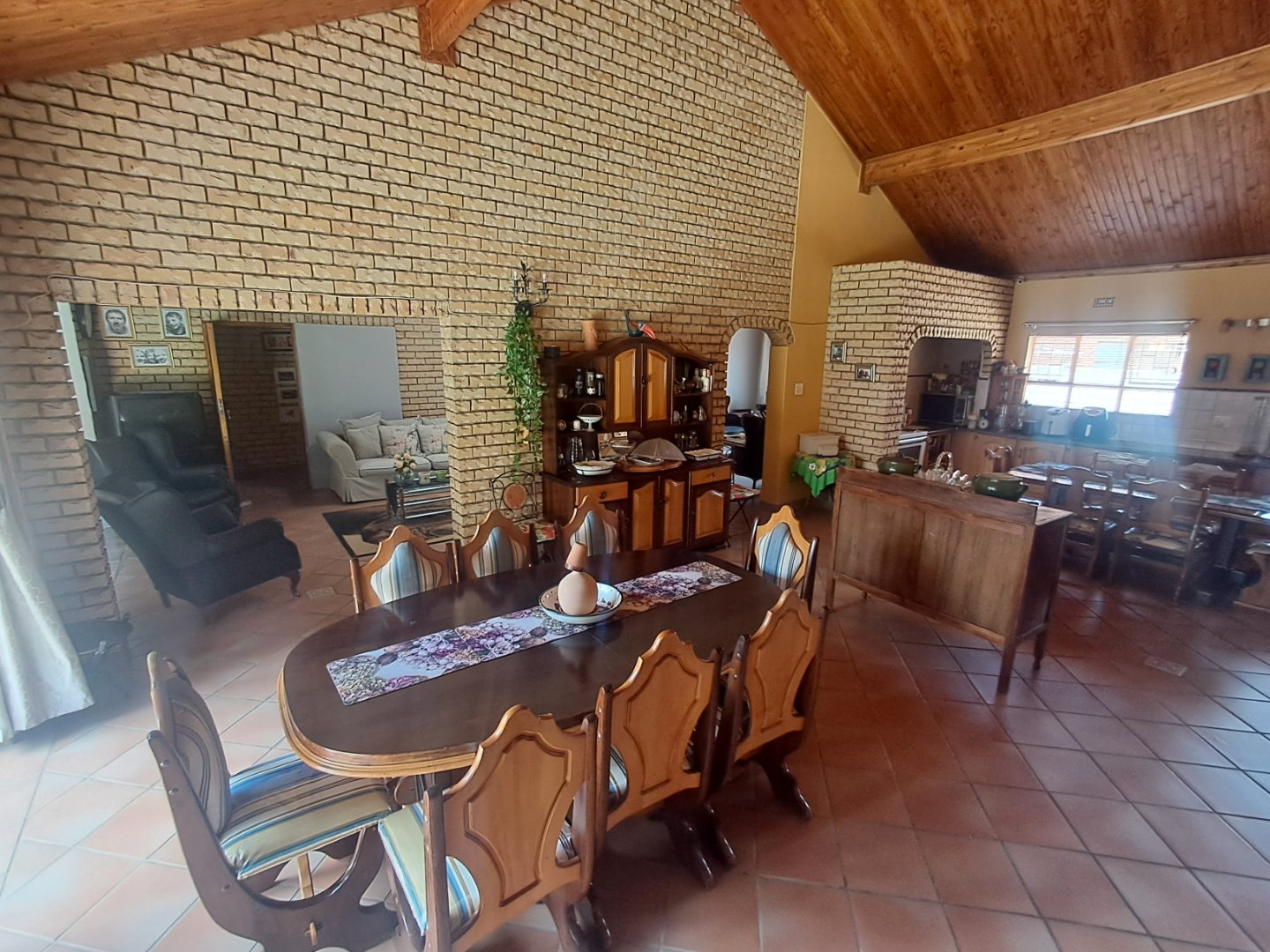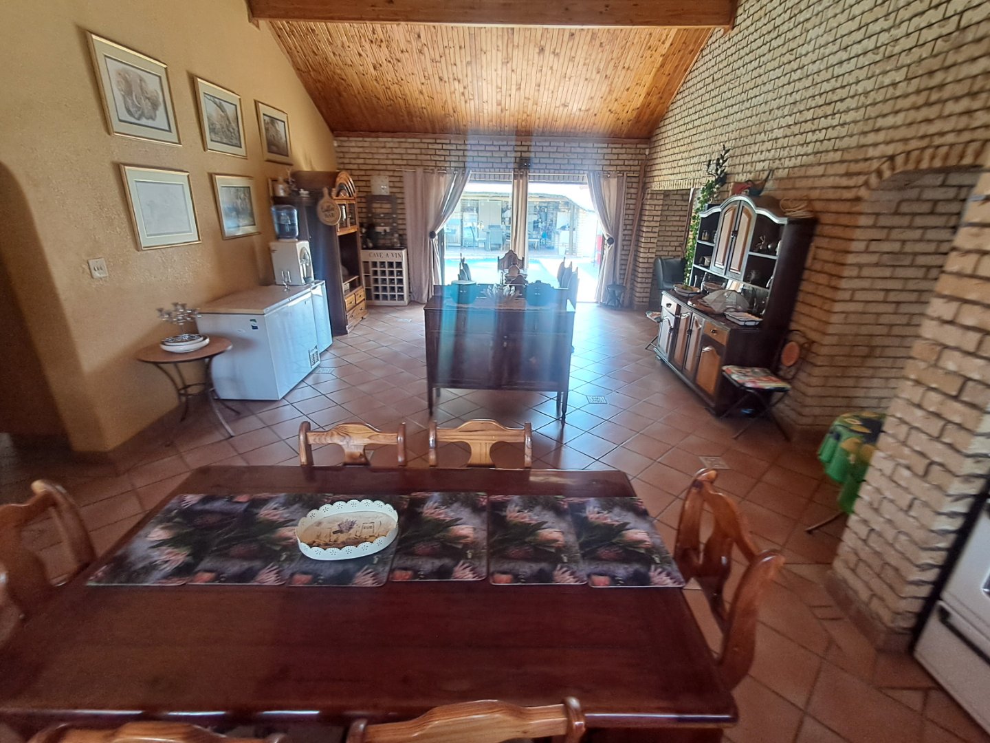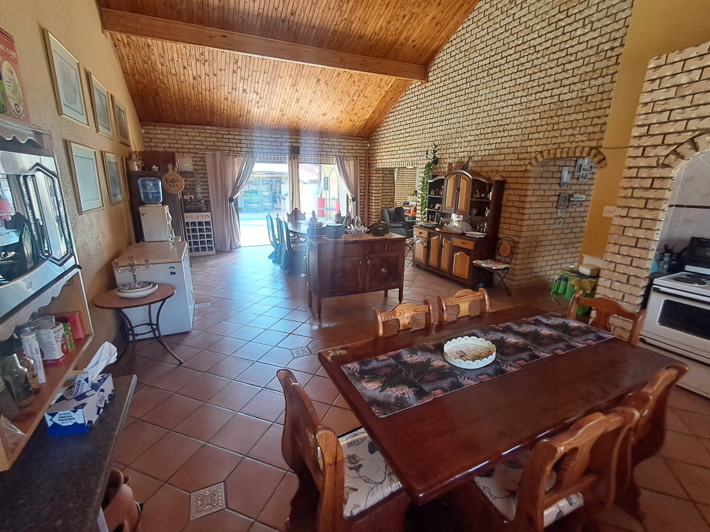 * Open kitchen and dining area with wooden cupboards, pine ceilings, and sliding doors to the pool area